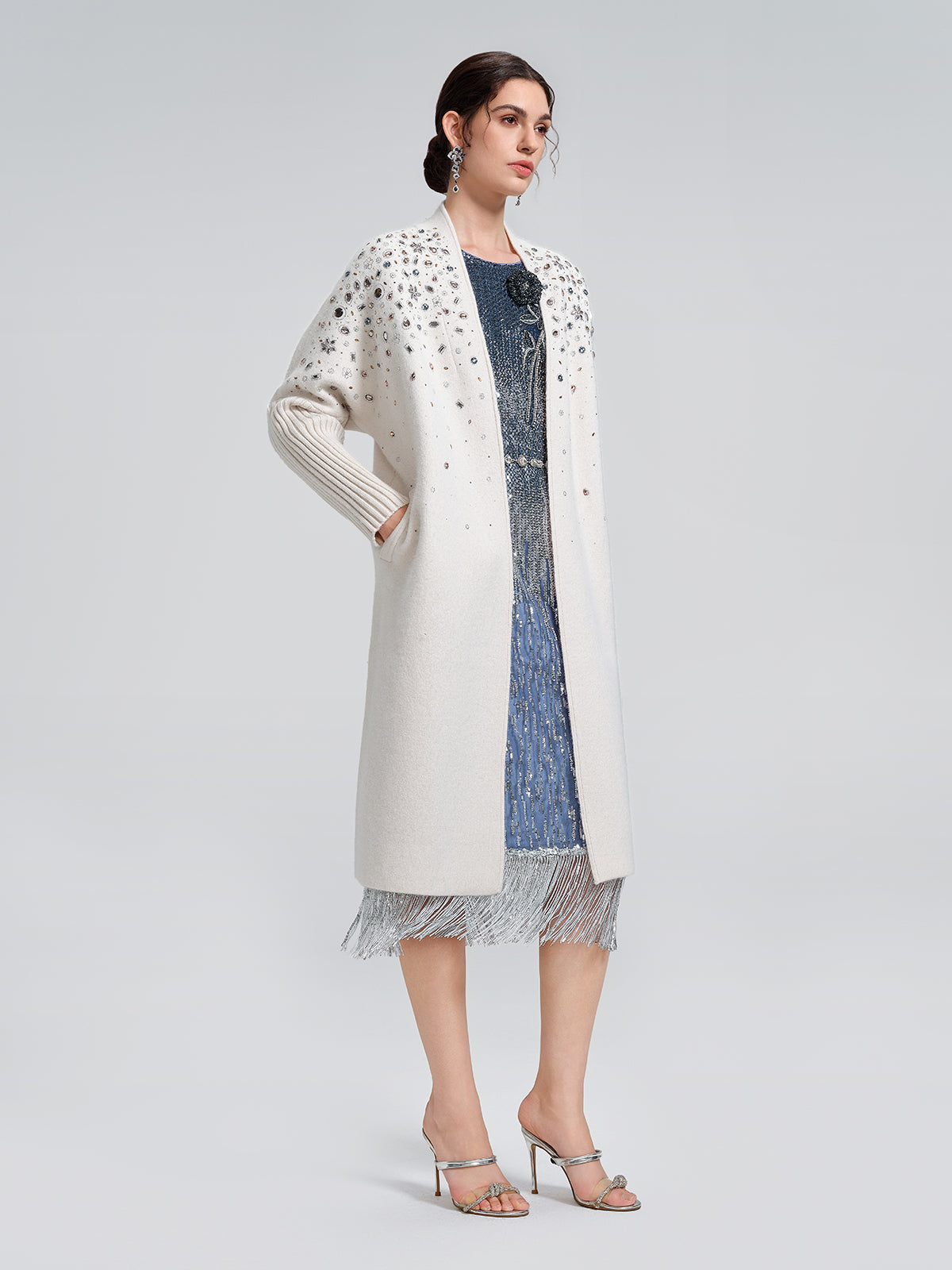 Crafted from premium gradient sequin fabric, this dress becomes a statement piece for dates or social gatherings. A hand-crafted, 3D flower at the neckline softens the clean silhouette, while fringe detailing at the hem adds movement and depth. The relaxed H-line cut offers effortless comfort and pairs seamlessly with heels for versatile, polished styling.