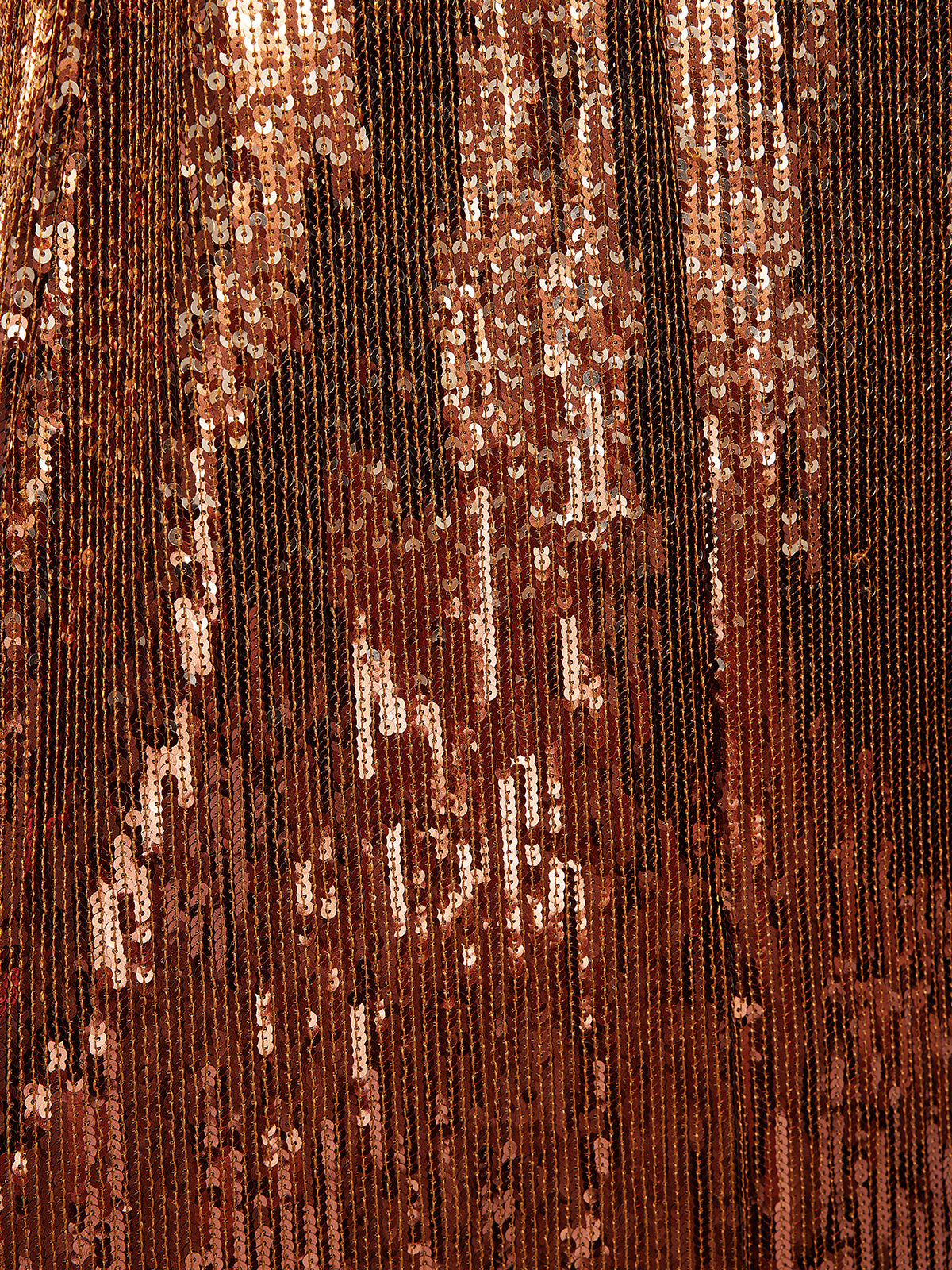 Gradient sequins from light gold to deep brown, layered with subtle fringed edges that sway with each step. Sequins offer firm texture, fringe adds fluidity. Square placket frames the neckline; classic trench-inspired silhouette adds structure. Movement creates gentle sound and dynamic visual interest.