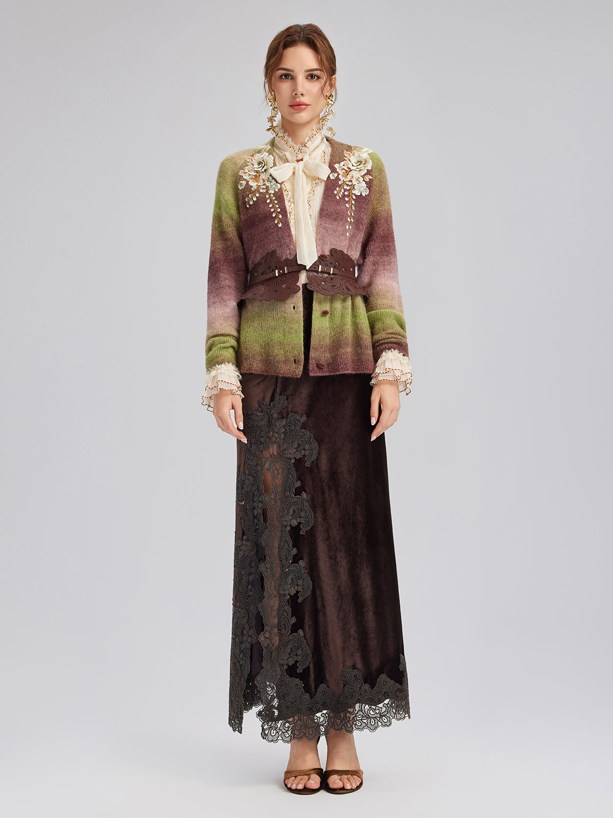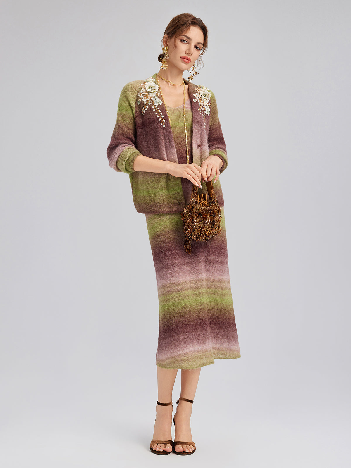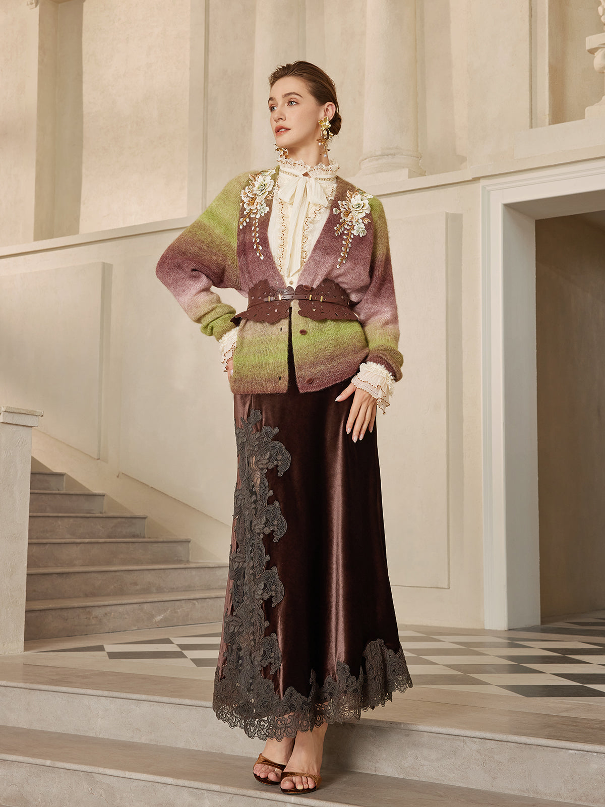Made from a soft wool blend in natural green-to-brown gradient, this piece features artisan-crafted floral embellishments. Each flower and leaf is hand-stitched petal by petal, accented with beadwork, creating a unique “gradient knit + dimensional floral” texture — no two are ever alike.
