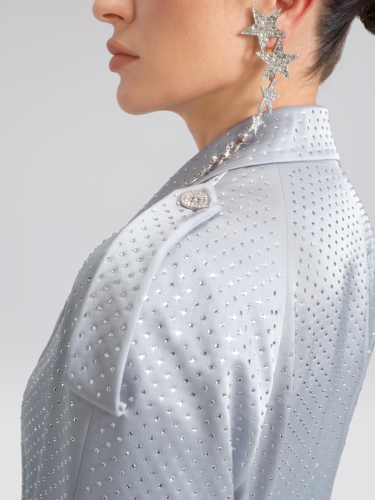 Hand-applied rhinestones arranged in precise rows create a refined shimmering effect. Lustrous satin fabric drapes smoothly with a subtle liquid sheen, while the cool light gray-blue tone enhances complexion and adds an effortlessly elegant, sophisticated presence.