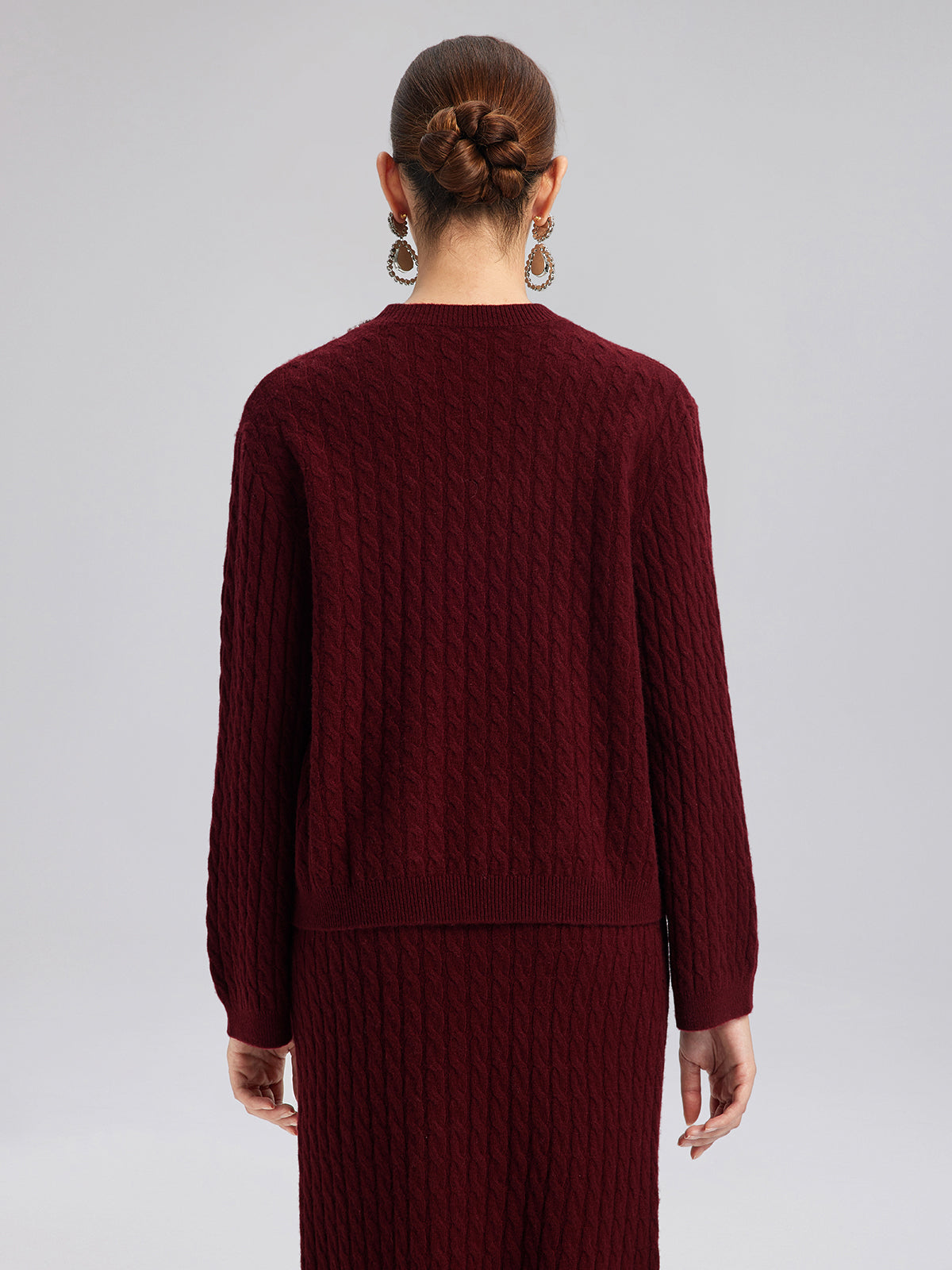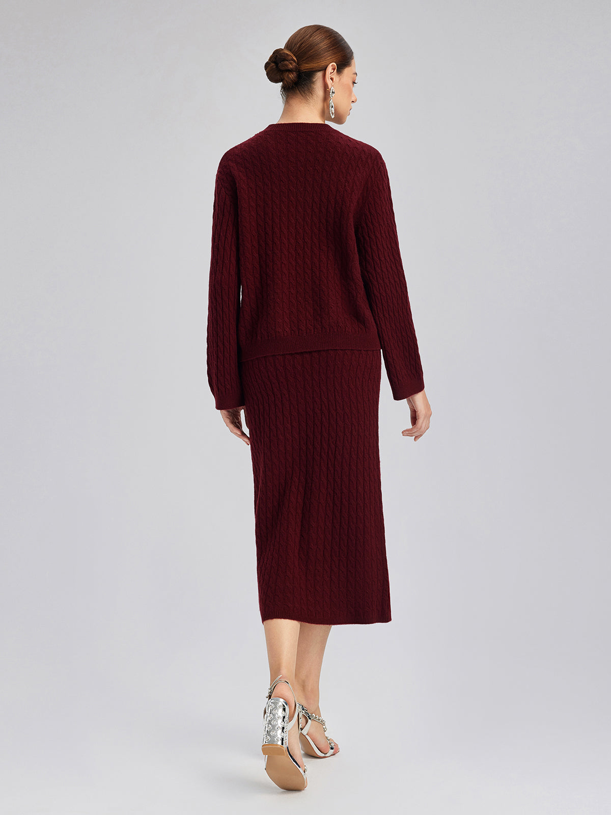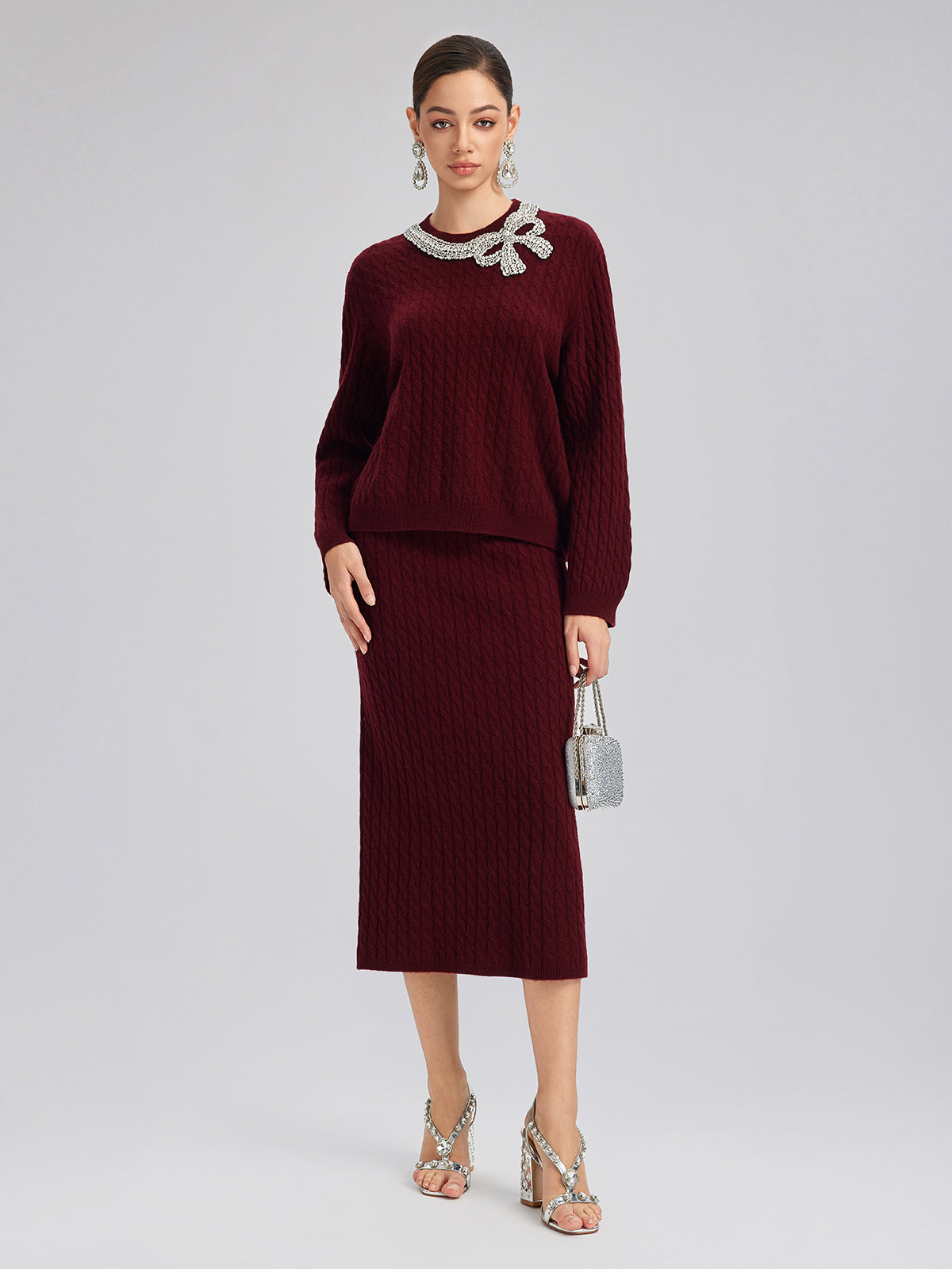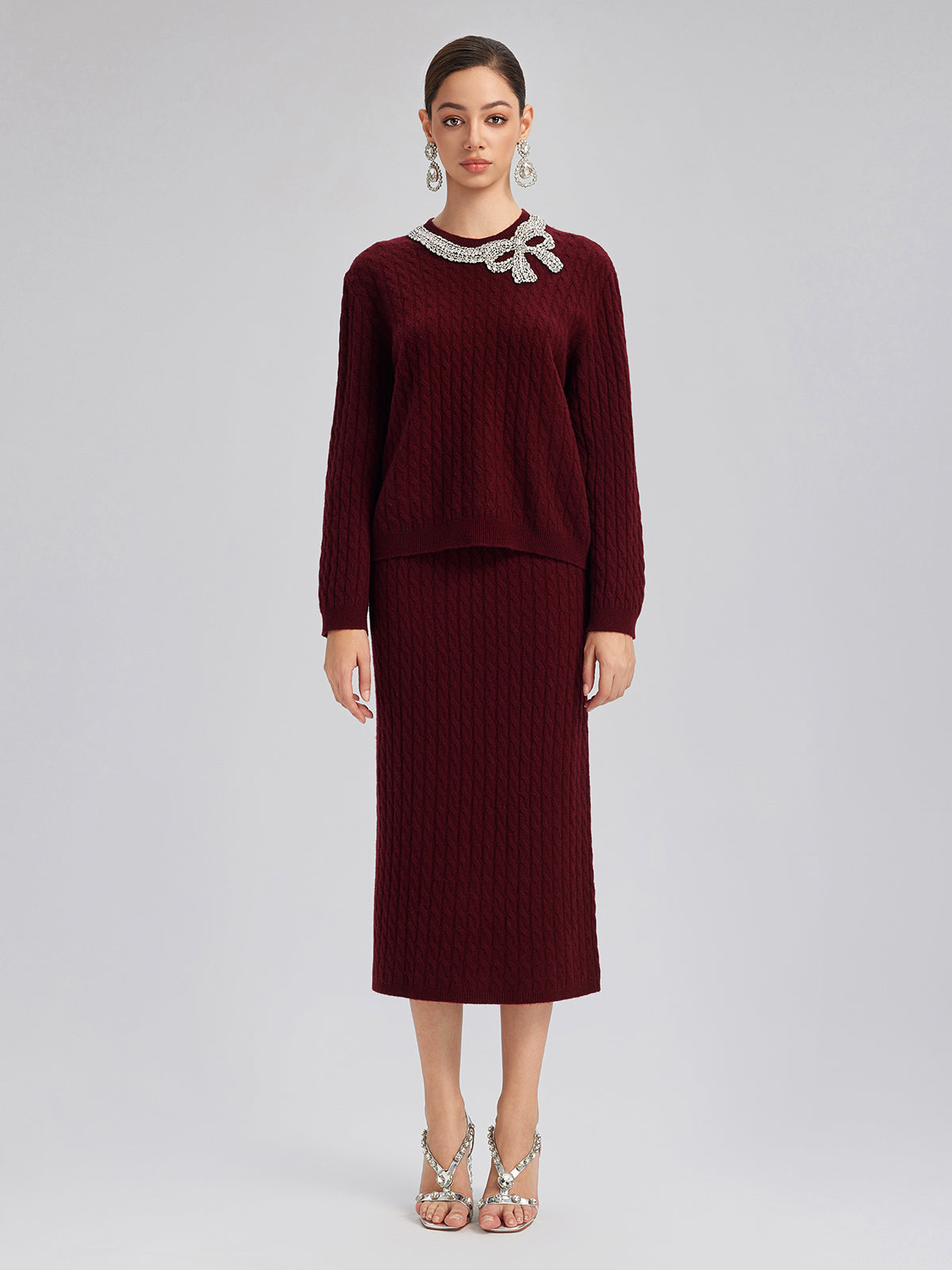 Crafted from premium wool-blend, this set is soft, warm, and drapes beautifully, embodying an “elegant limited” aesthetic. A hand-applied crystal bow adorns the chest, blending subtlety with sparkle as a focal point. The sweater features a relaxed crew neck, while the straight-cut skirt sculpts the waist and hips for a polished, refined silhouette.