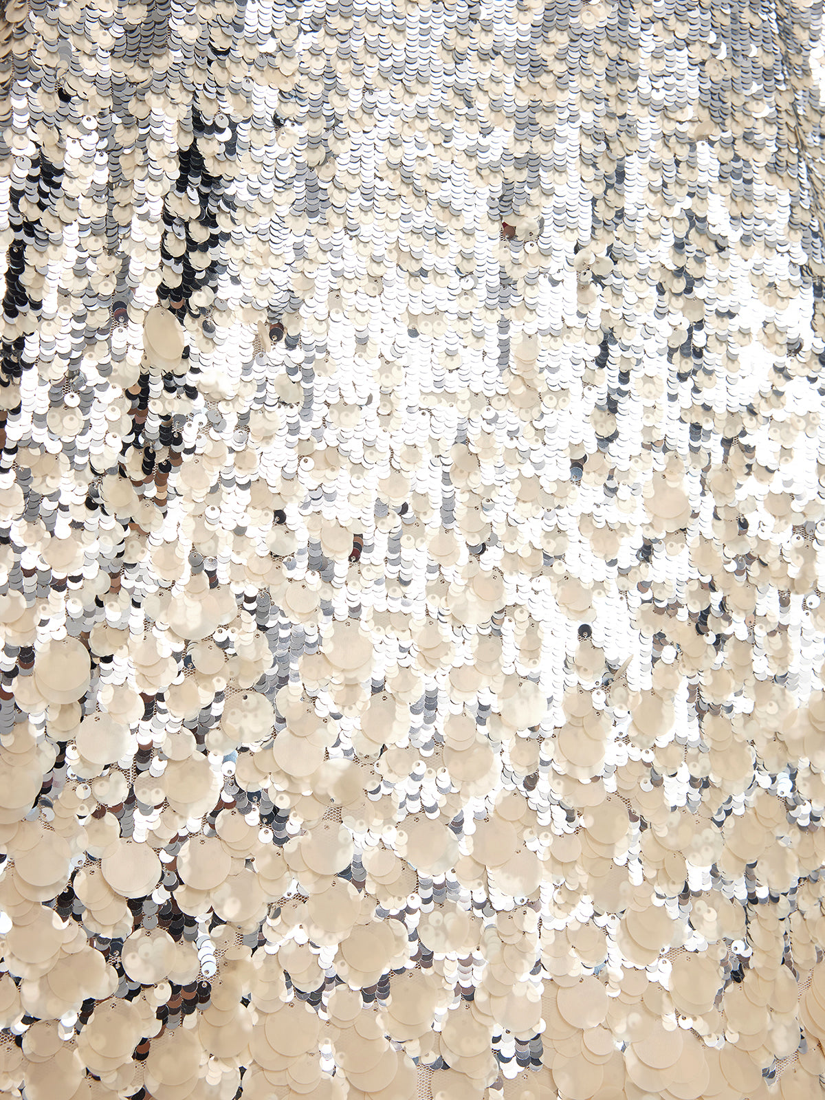 Silver sequins at the collar gradually transition to large ivory-gold sequins at the hem, shimmering like a flowing galaxy. The front closure is adorned with handwoven silver fringe that sways with movement, secured with convenient hooks for easy wear. The A-line silhouette offers comfort and elegant sophistication.