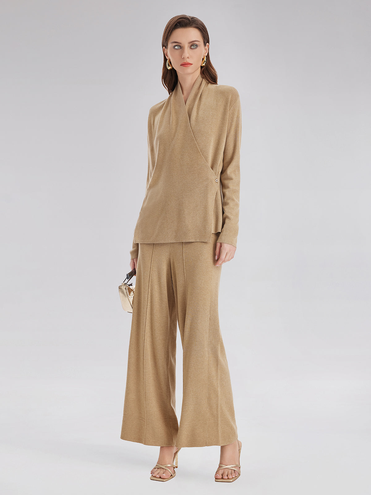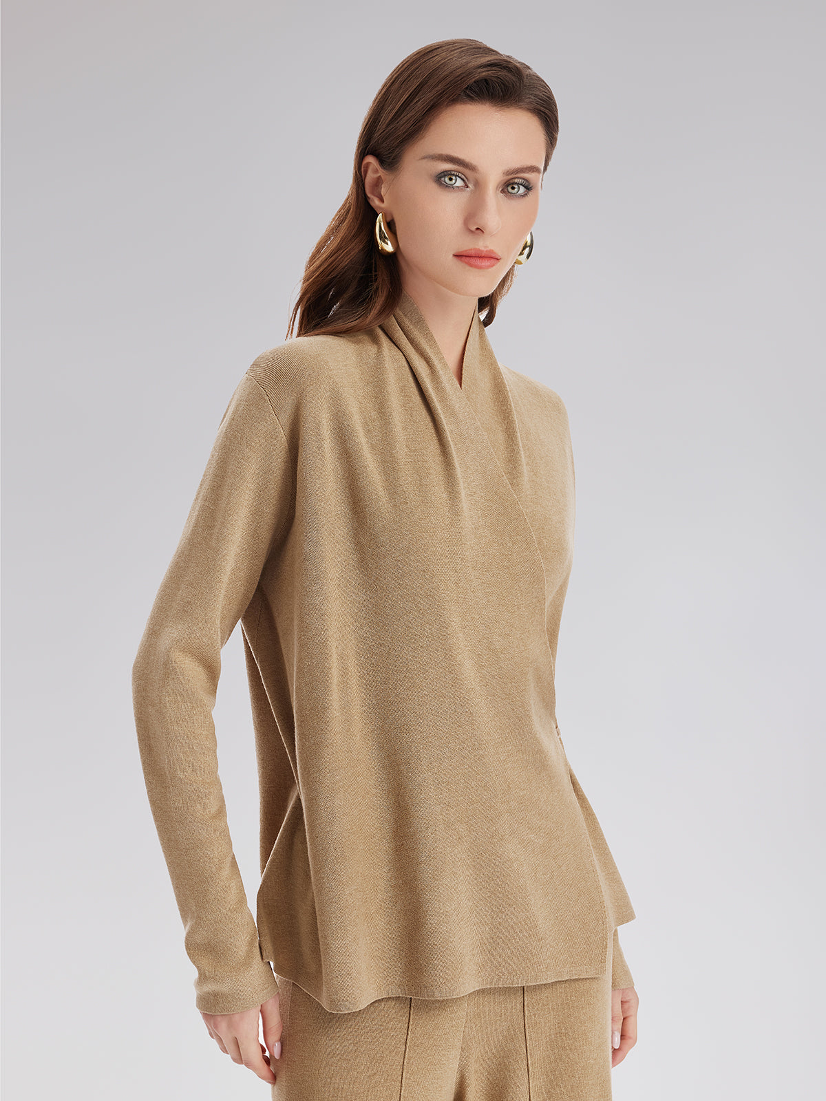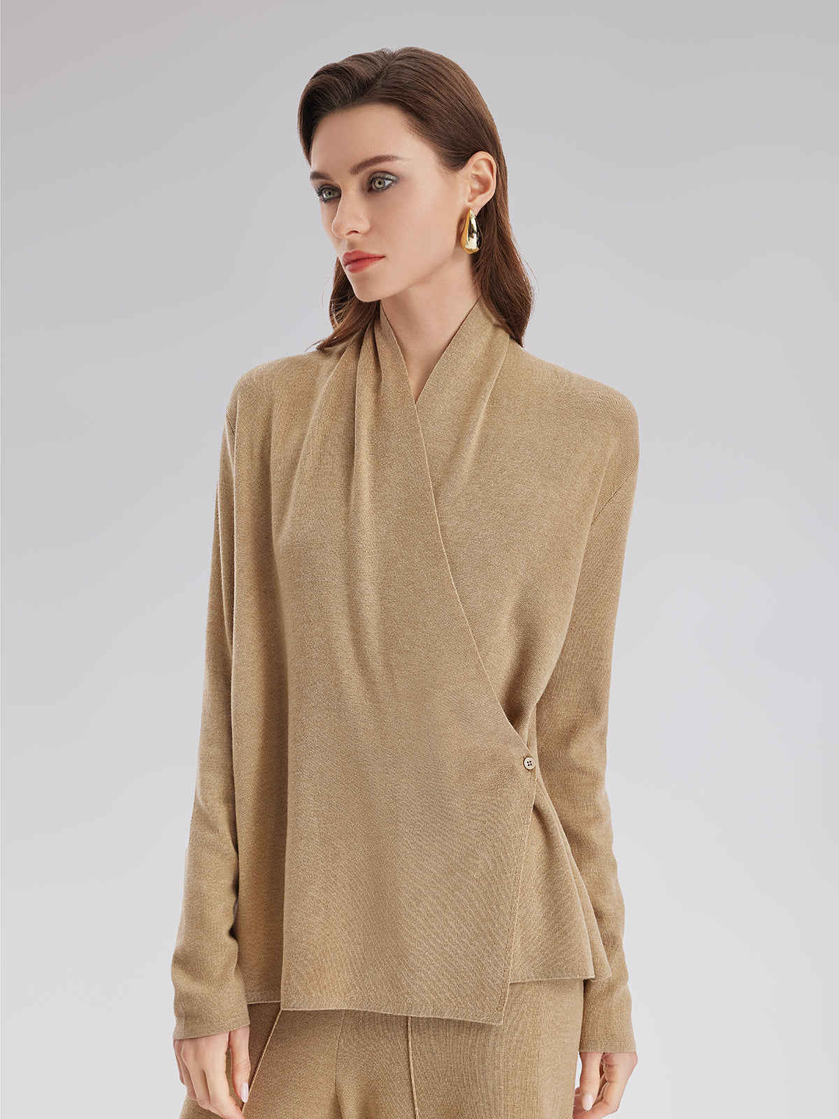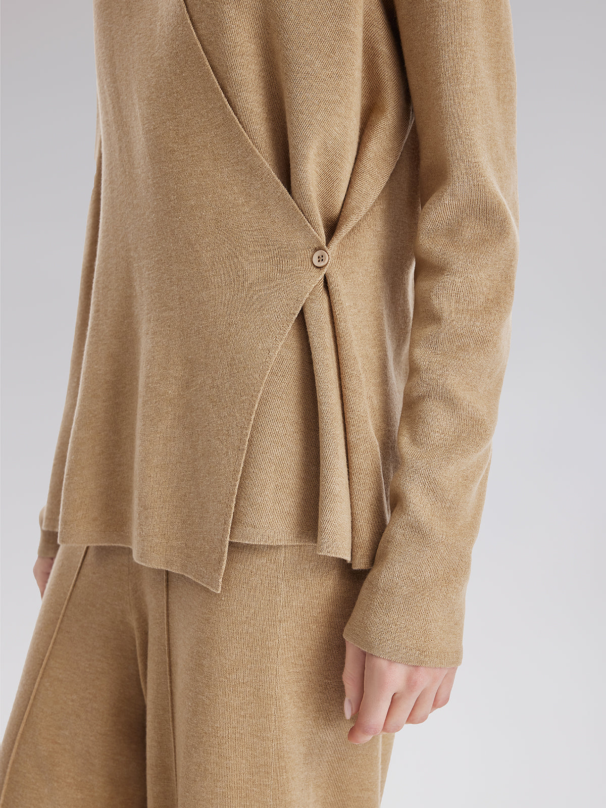 Crafted from luxurious cashmere, this top offers exceptional warmth and softness. The cross-neck design adds a touch of elegance, enhancing the neckline for a feminine look. Hidden side buttons provide a secure fit, while the relaxed cut ensures comfort and ease of movement. The simple cuffs and hem create a clean, sophisticated finish, perfect for pairing with various bottoms.