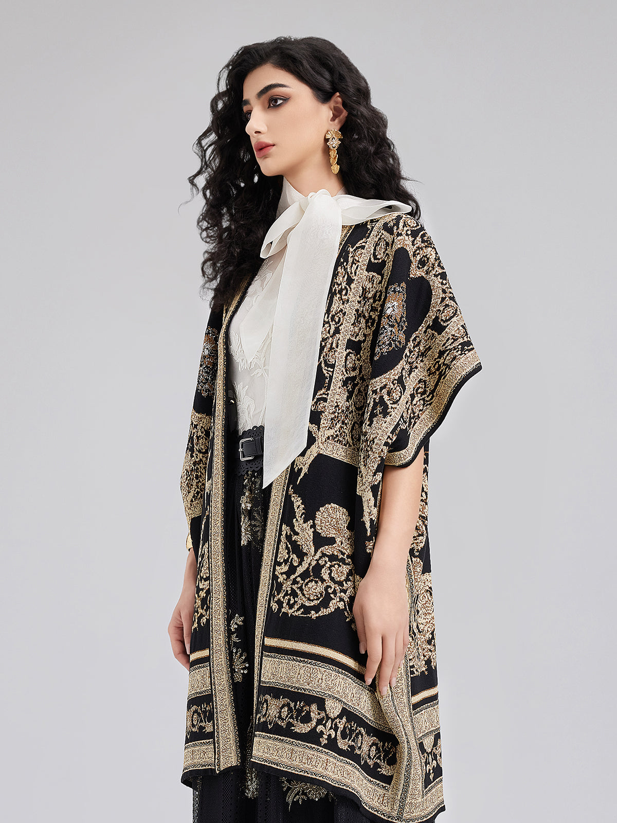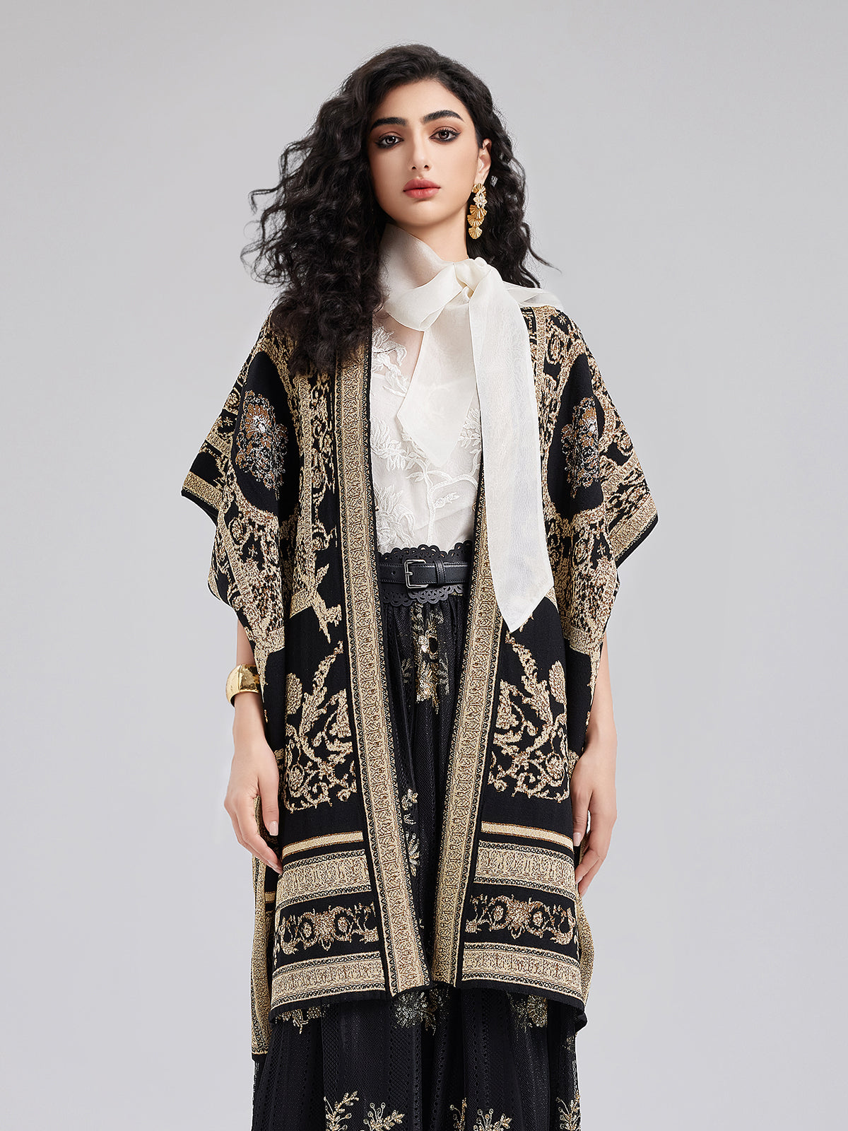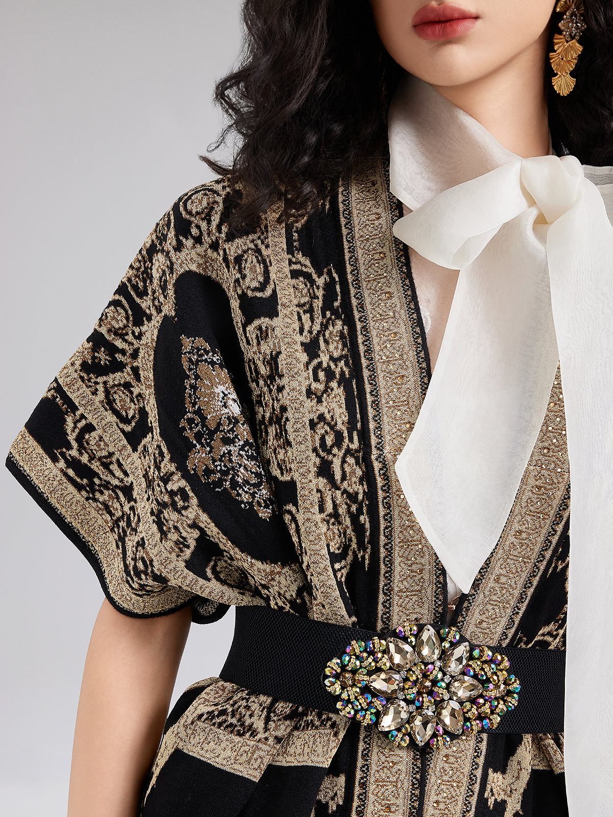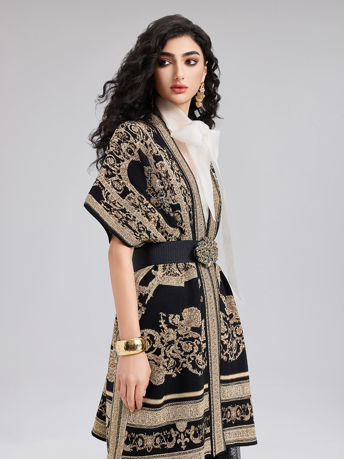 Featuring an elegant, royal-inspired pattern, this cardigan combines luxurious details with high-quality knit fabric for a soft, breathable feel. The chic short-sleeve design offers a modern twist, perfect for both casual and formal occasions, showcasing effortless sophistication.