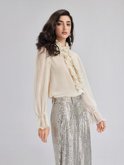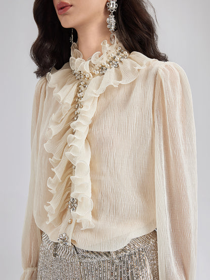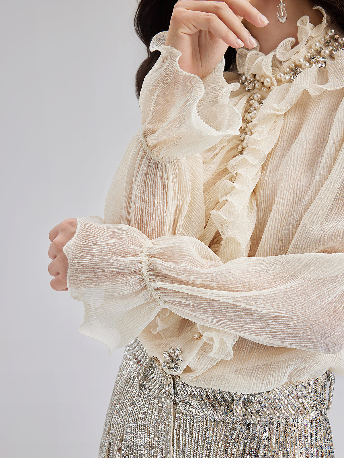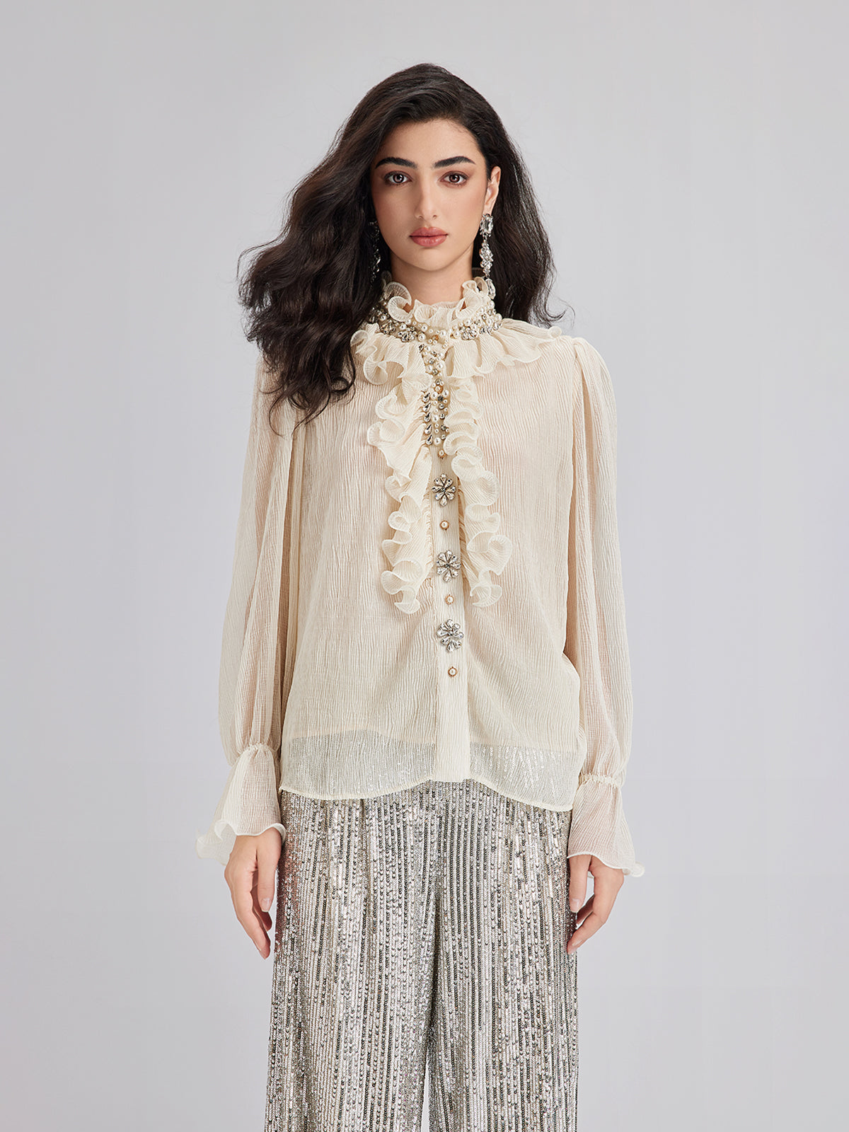 Ruffled Stand Collar Beaded Shirt - Chic Style
