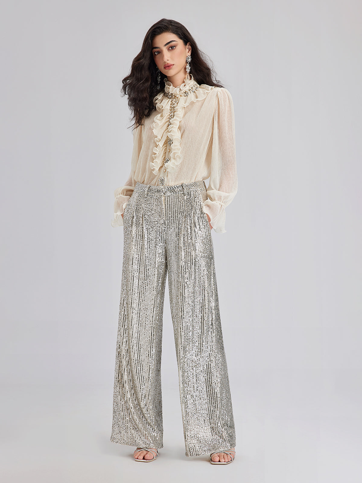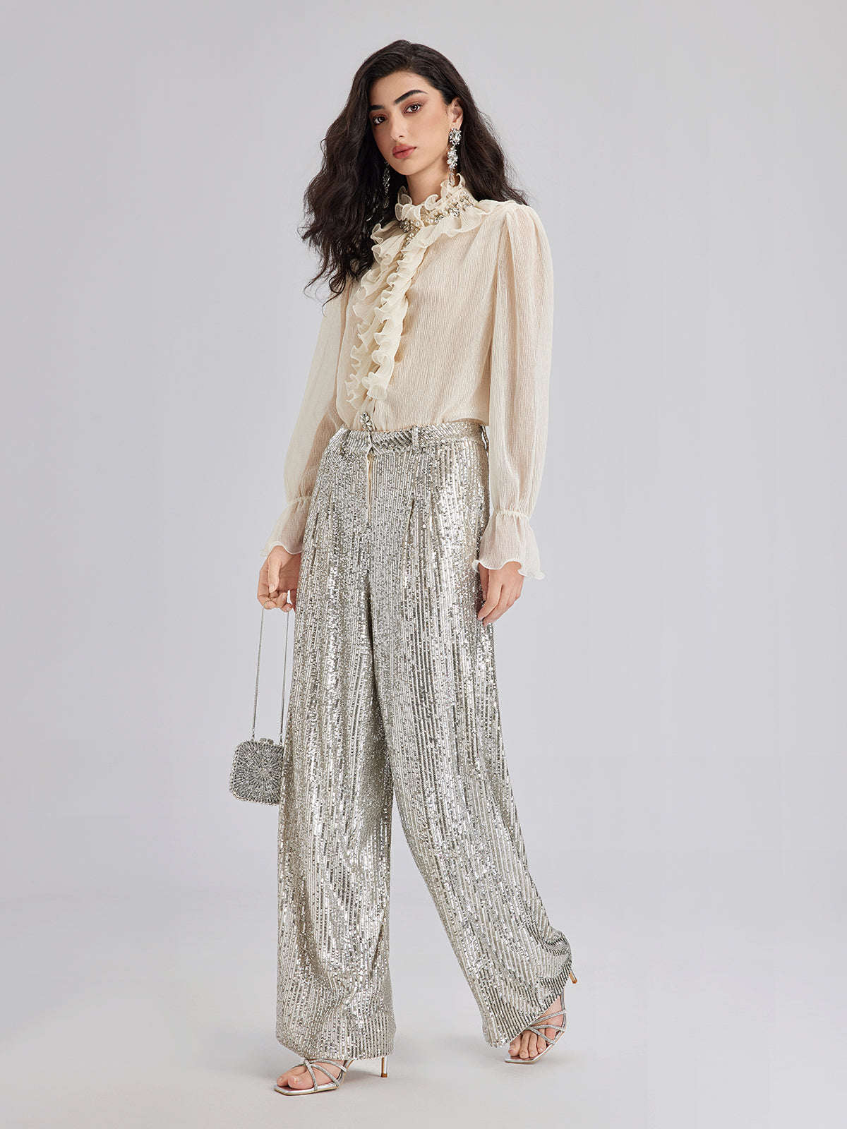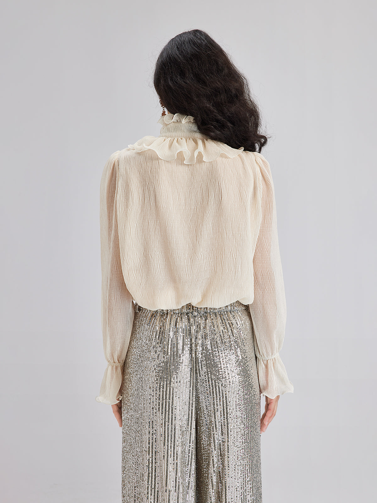 Ruffled Stand Collar Beaded Shirt - Chic Style