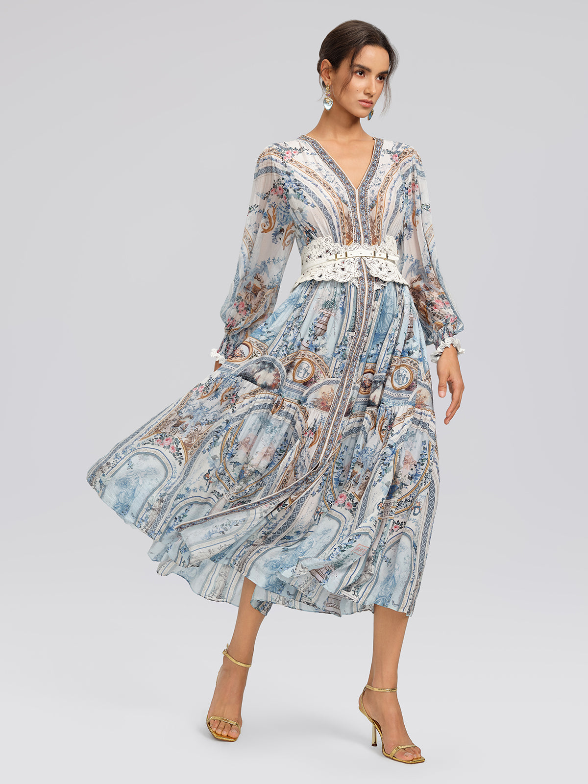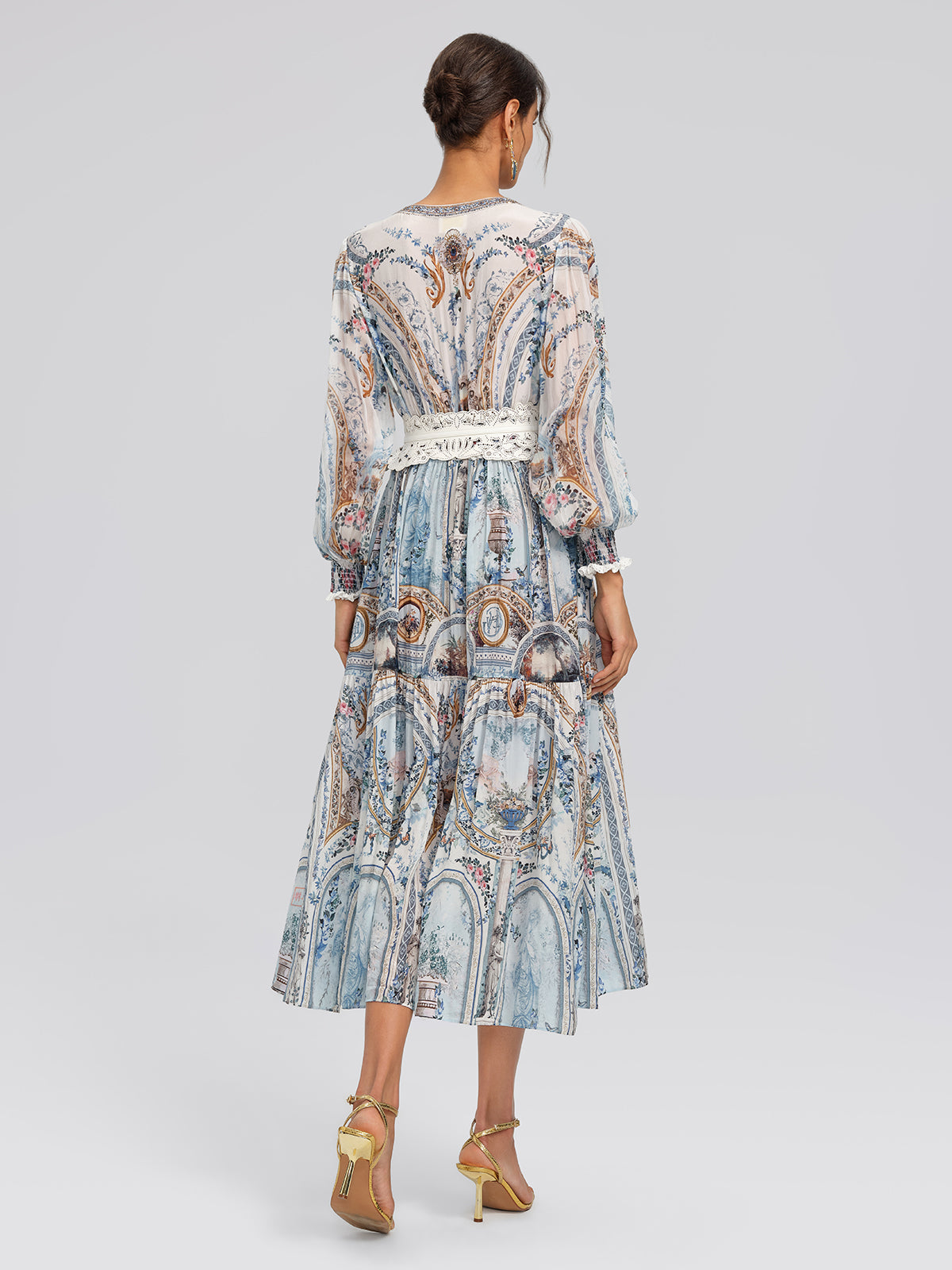 Made from lightweight printed silk, this dress feels soft and fluid against the skin. Smocked elastic detailing at the waist and cuffs offers comfort and flexibility. Rhinestones along the neckline and placket add a refined shimmer—perfect for sunlit holidays, seaside dinners, and effortless resort escapes.