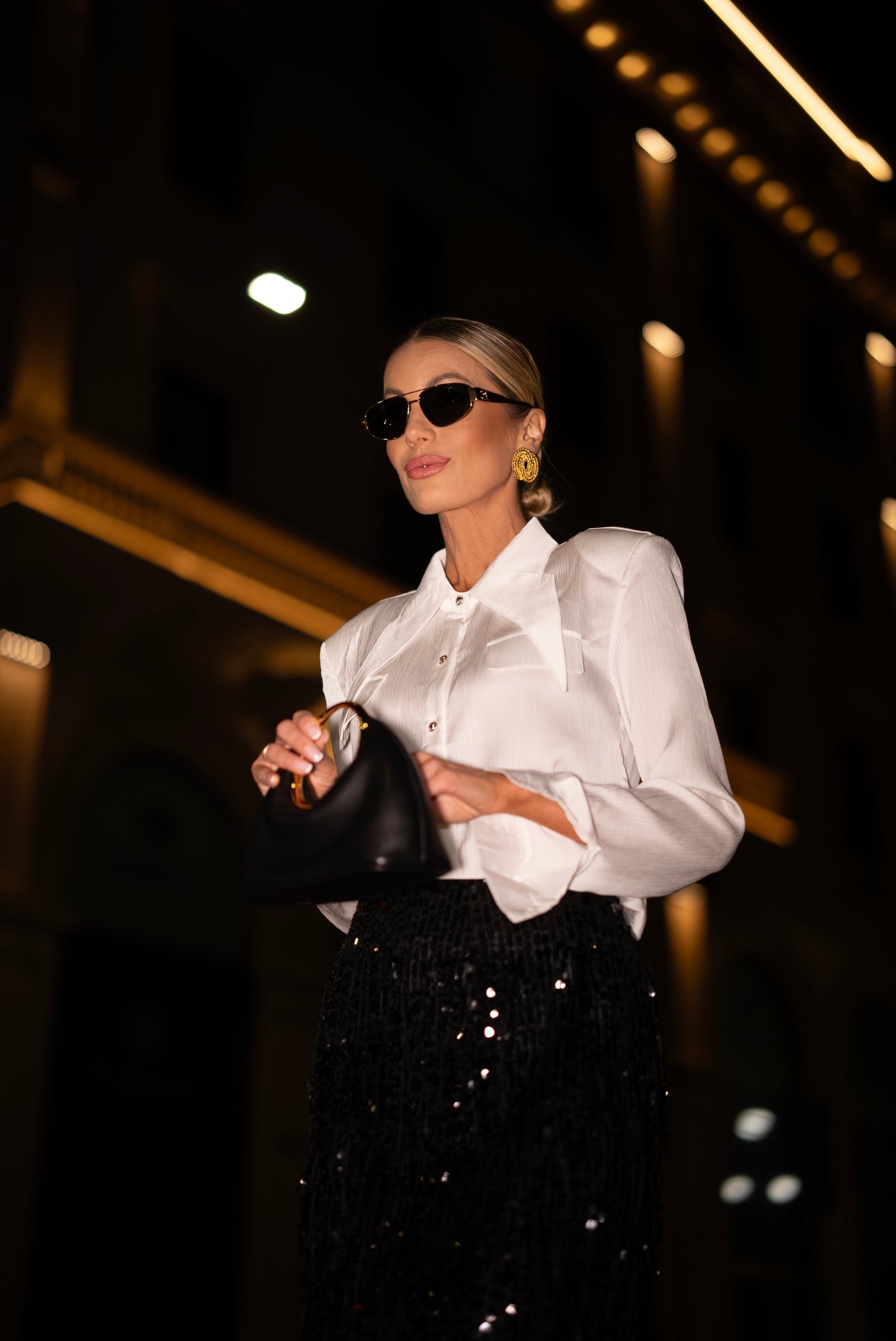 Elegant pleated asymmetrical pointed collar shirt, showcasing a unique design style. Sleek and refined, it exudes confidence and charm for any occasion.