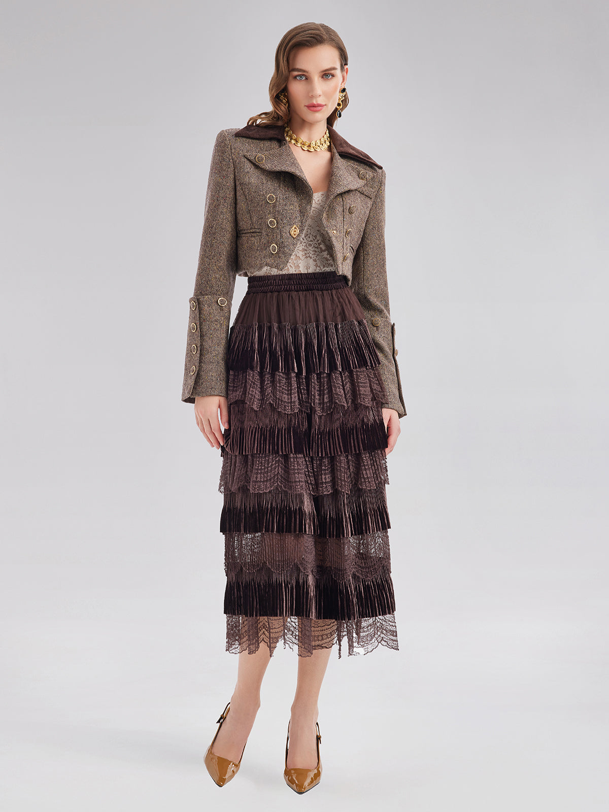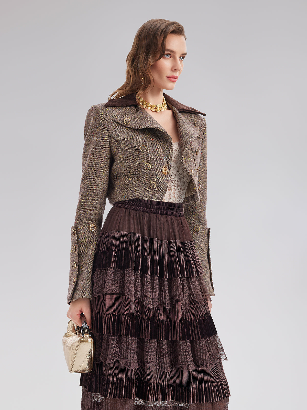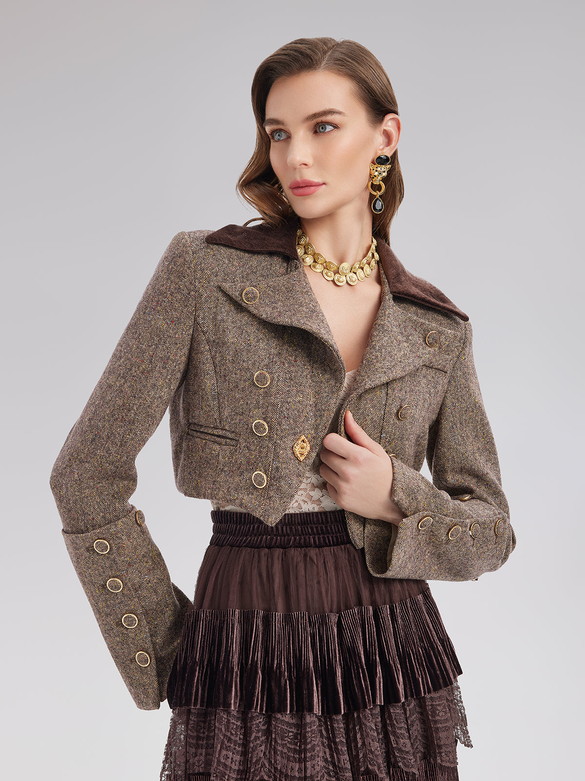 This blazer is inspired by vintage military uniforms, featuring a double-breasted design that adds a touch of glamour. The cropped cut accentuates the waistline, showcasing elongated legs. The three-dimensional wide collar and contrasting color panels enhance depth, while the wide cuffs and metal accents emphasize the military aesthetic, offering unique and refined details.