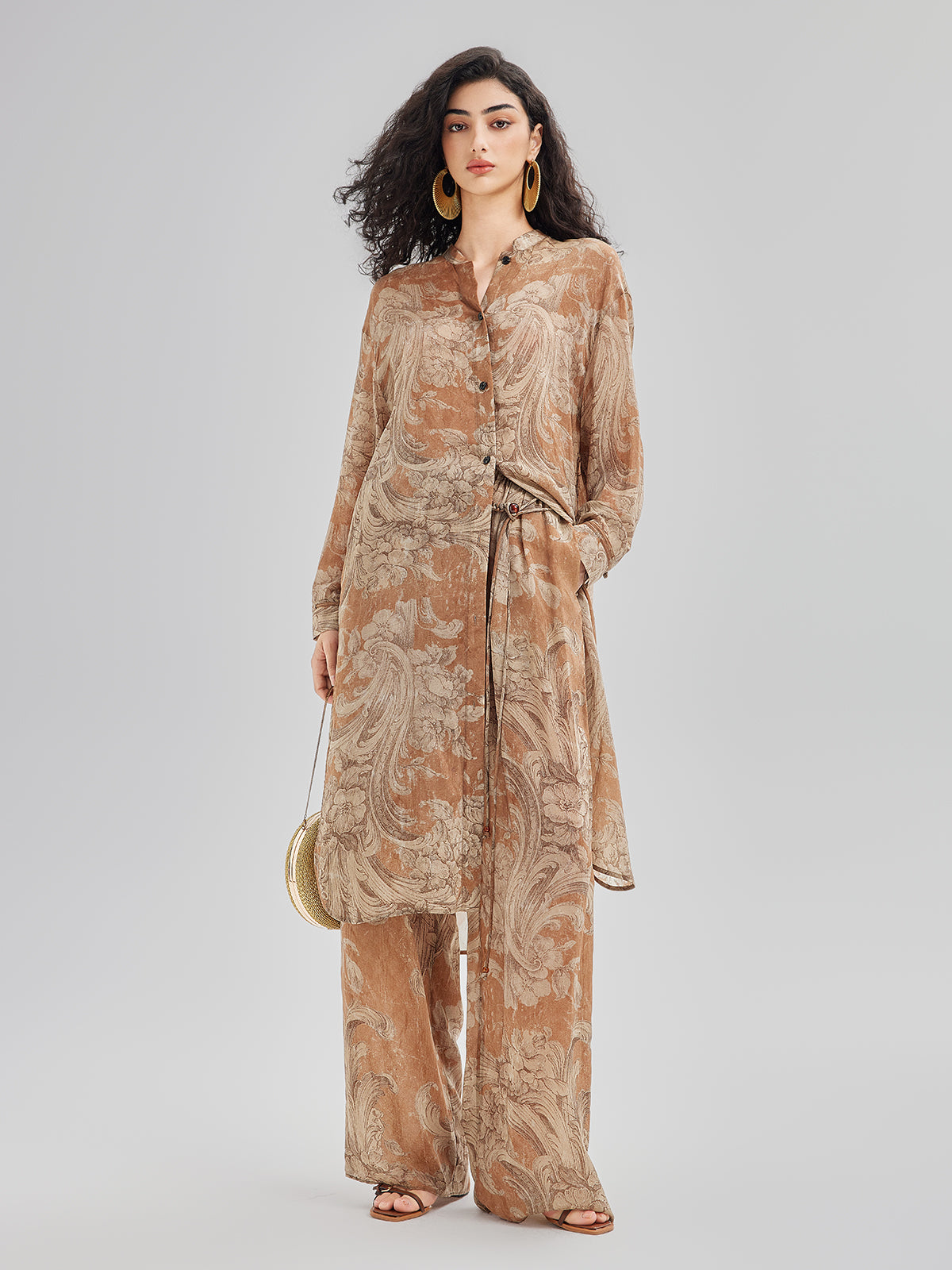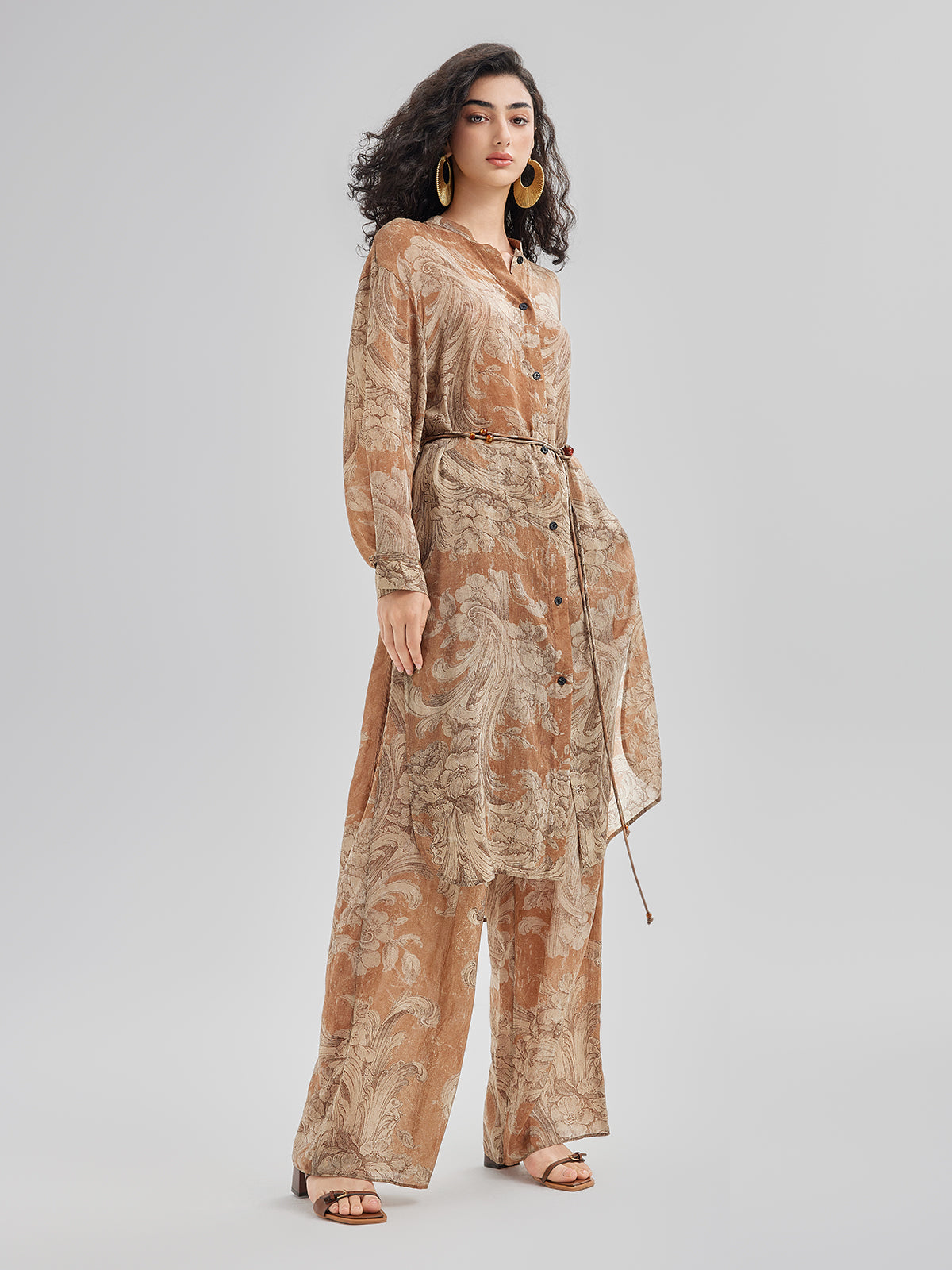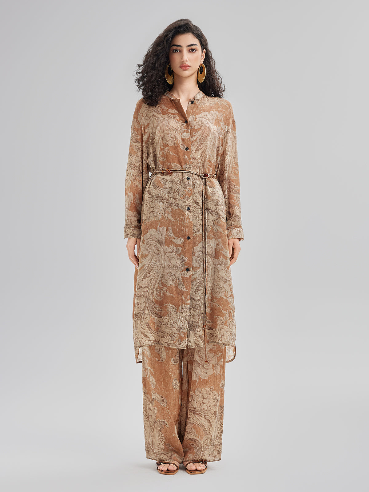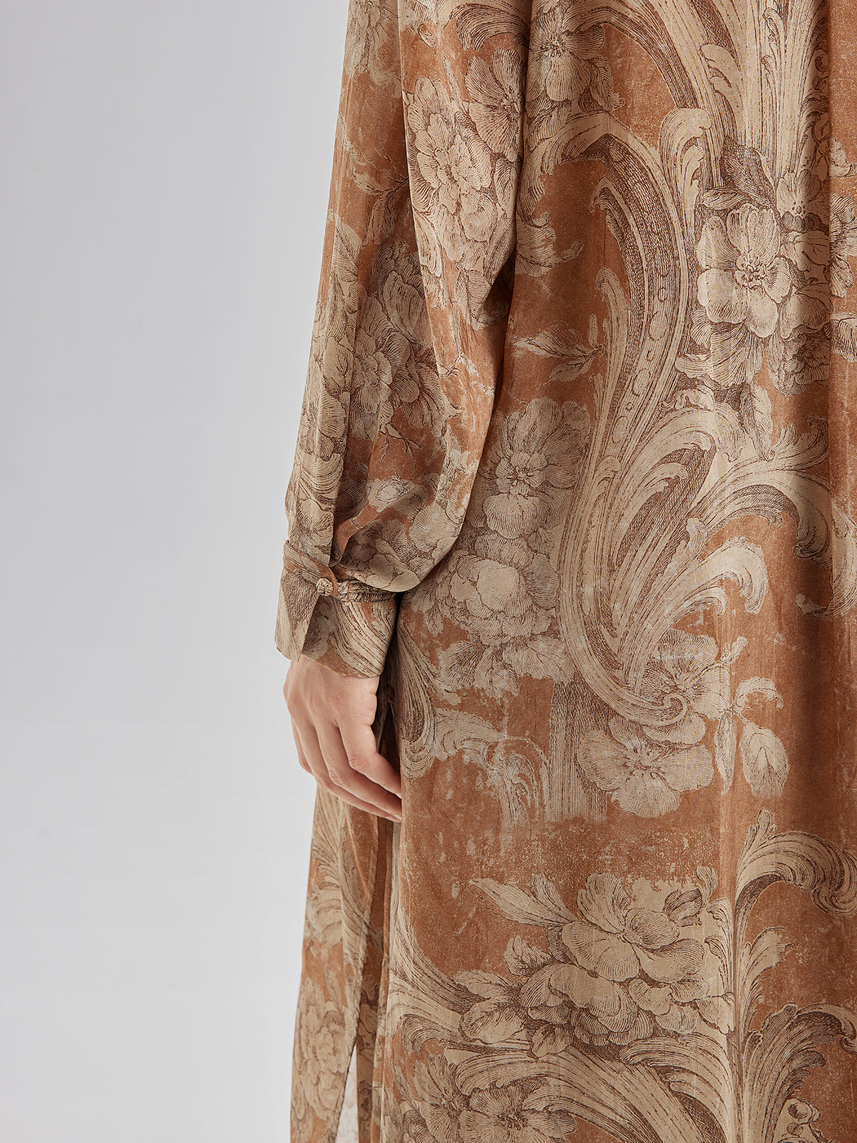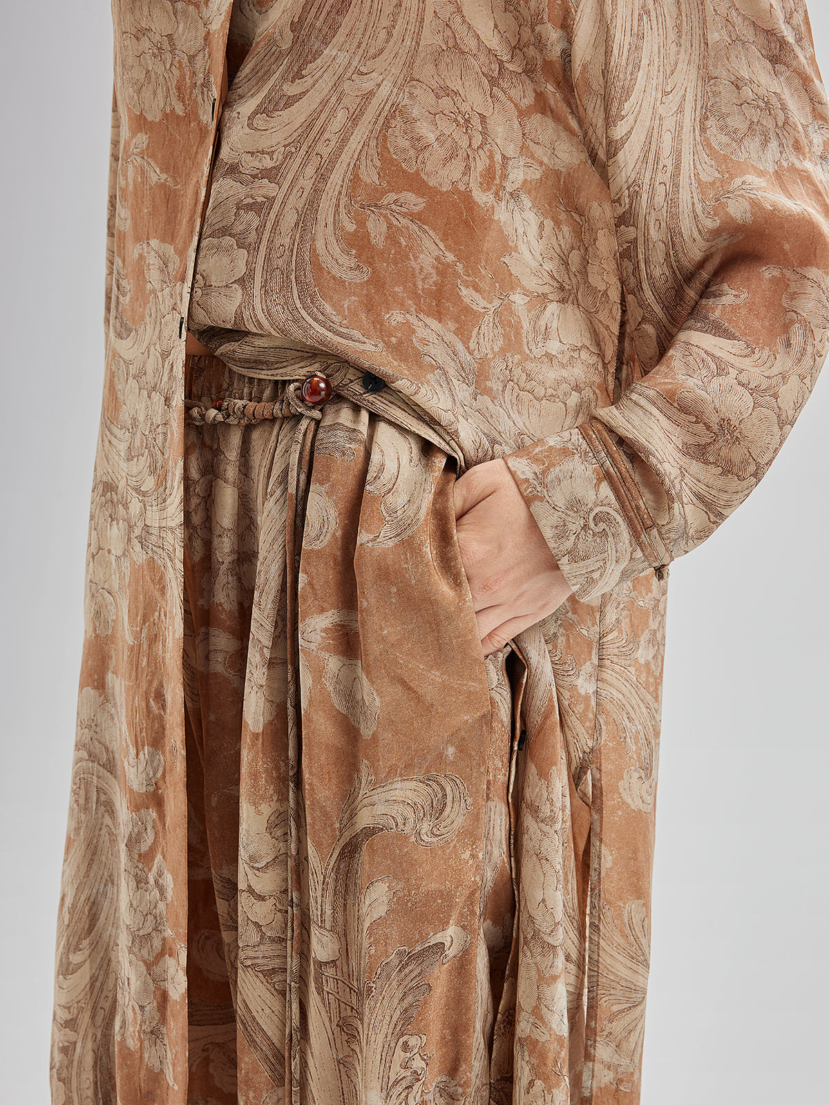 Crafted from cupro with a silk-like feel—soft, wrinkle-resistant, and gentle on the skin. Baroque print that brings an artistic flair. Designed in a relaxed silhouette that suits all body types and allows for versatile styling. (Comes with a waist rope to define the waist or switch up the look. )