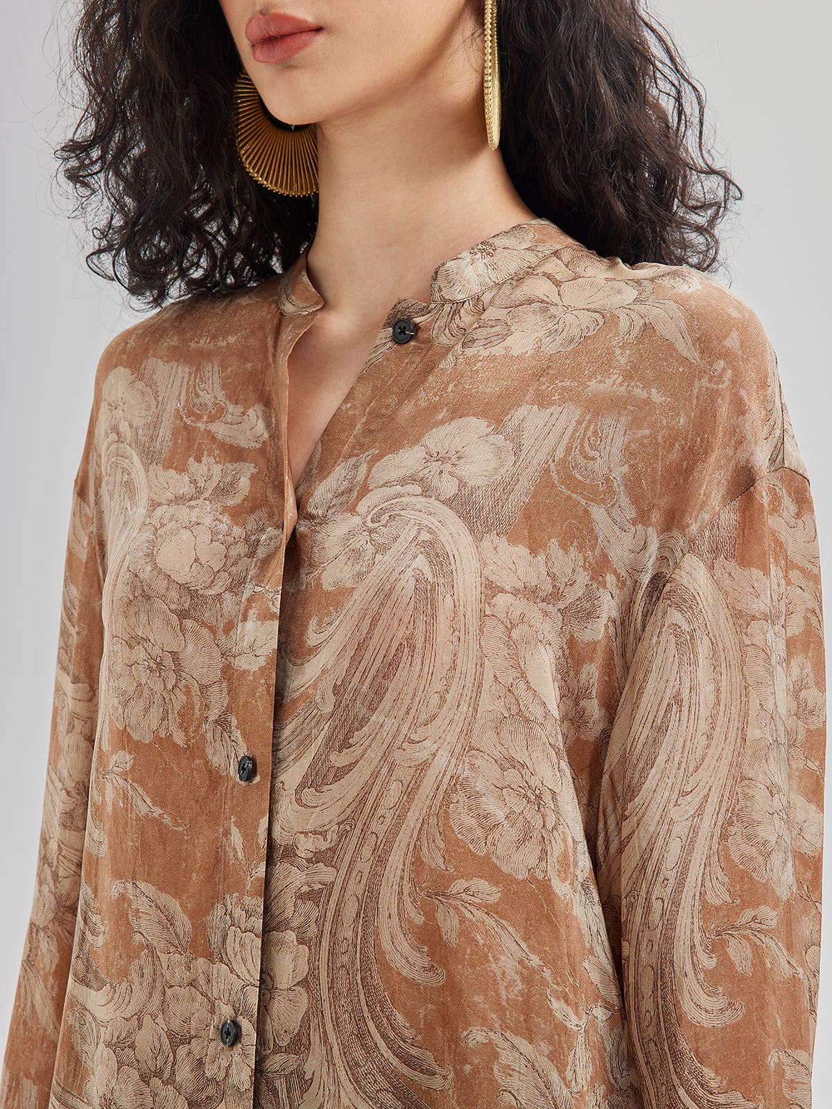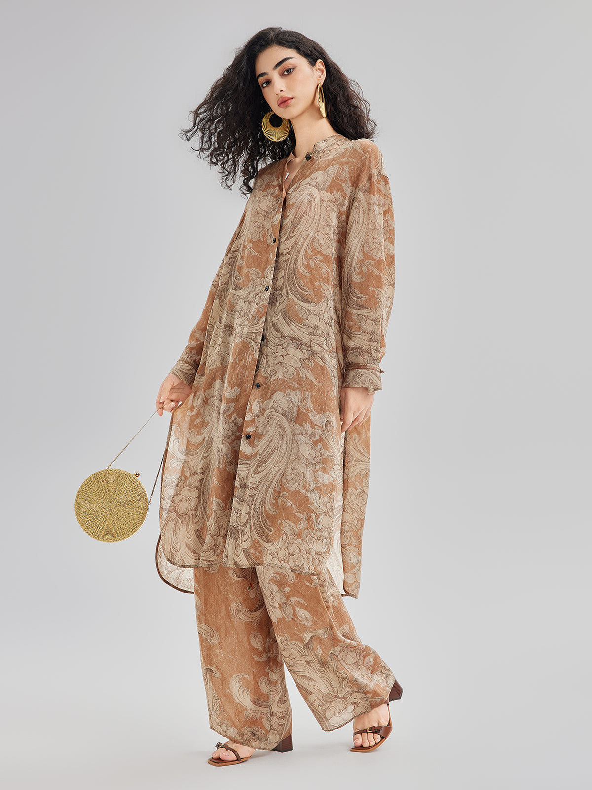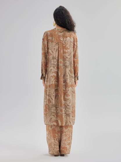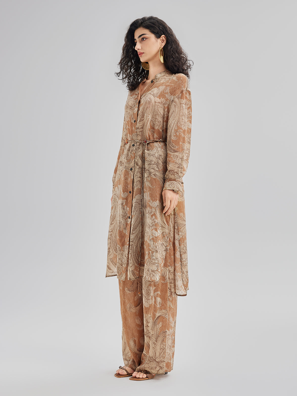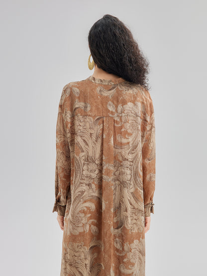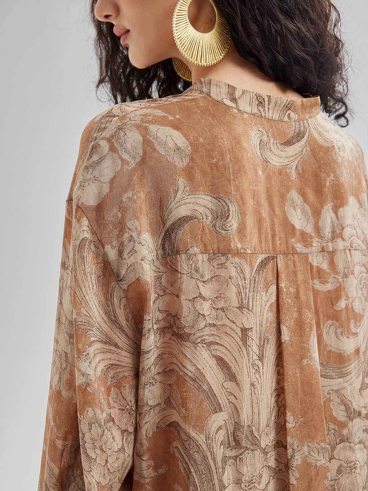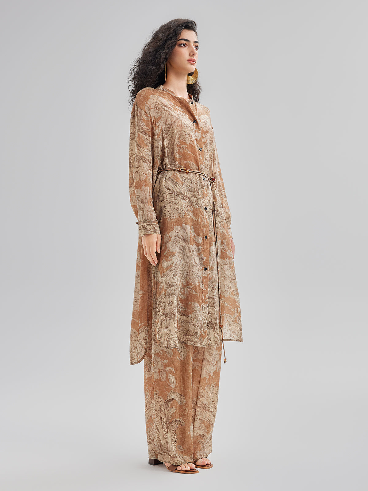 Crafted from cupro with a silk-like feel—soft, wrinkle-resistant, and gentle on the skin. Baroque print that brings an artistic flair. Designed in a relaxed silhouette that suits all body types and allows for versatile styling. (Comes with a waist rope to define the waist or switch up the look. )