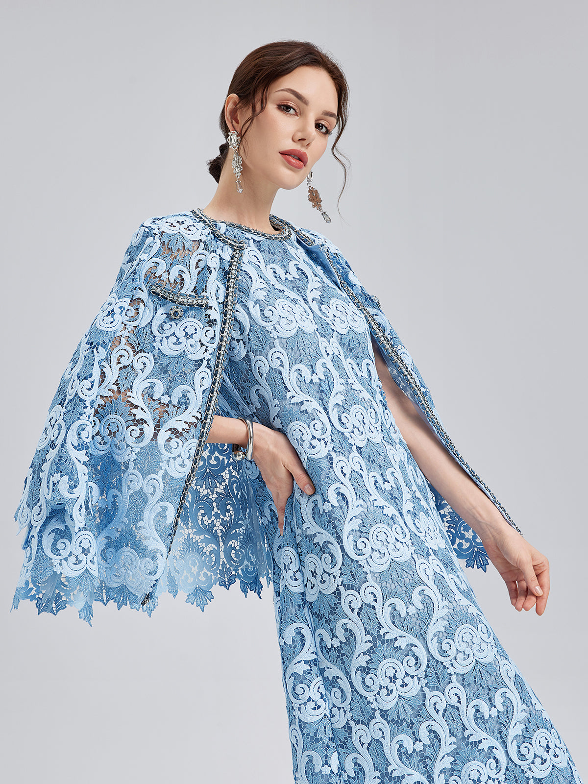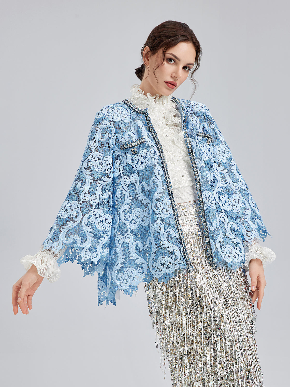 Made from high-density two-tone lace, this jacket holds a structured Baroque silhouette without collapsing. Custom shimmering trims on collar, placket, and pockets reflect light with movement. Vintage buttons are hand-sewn for durability. Relaxed fit flatters all shapes.