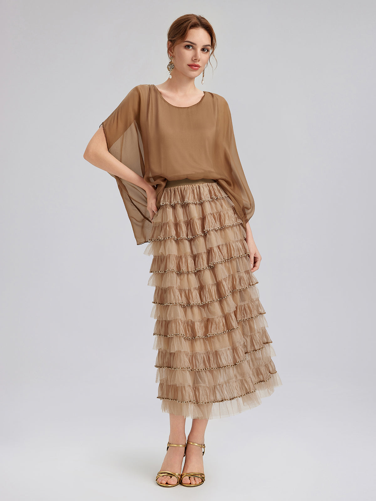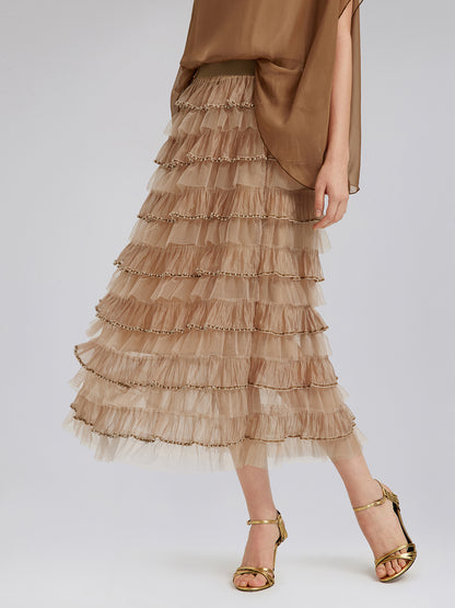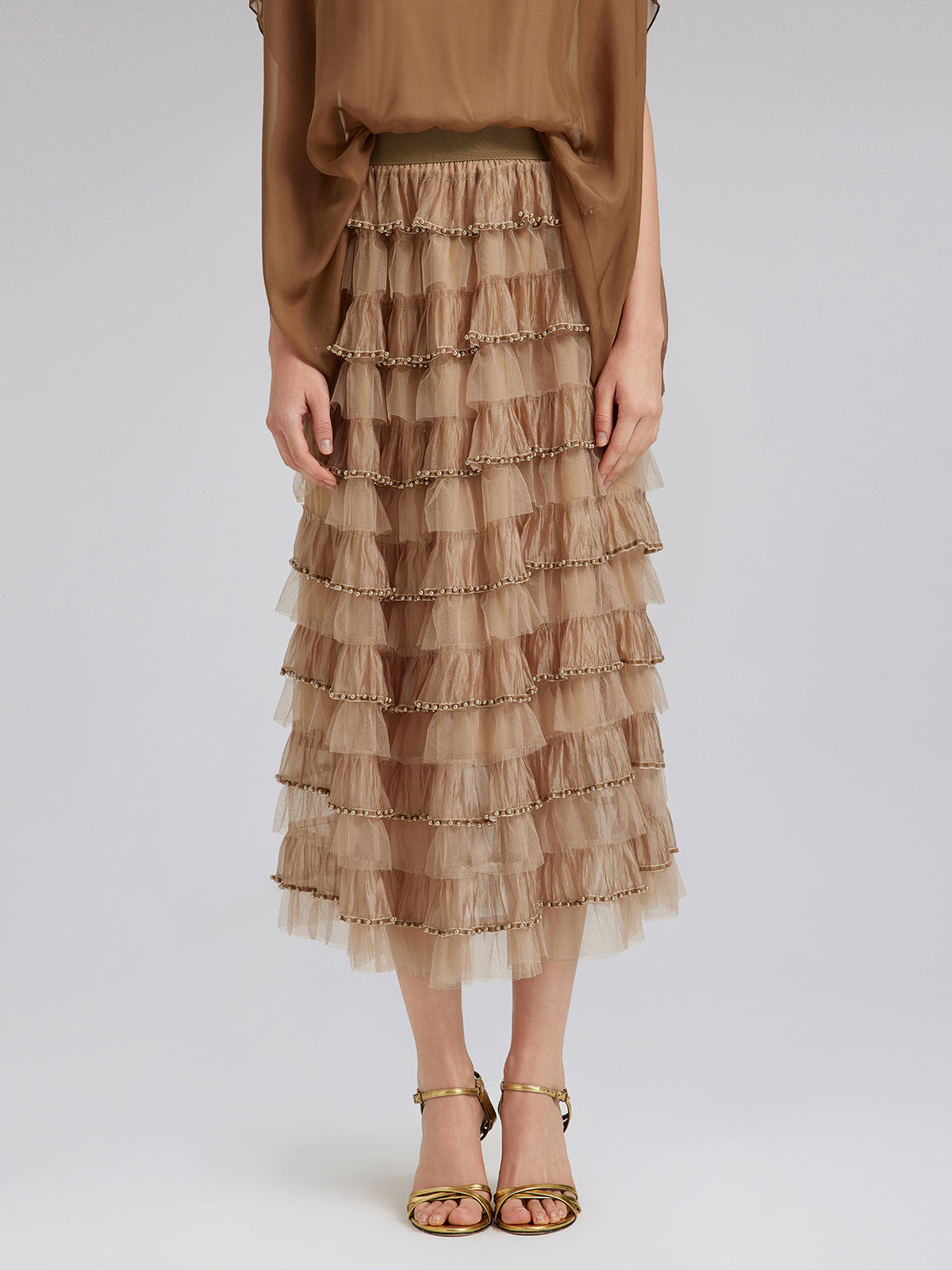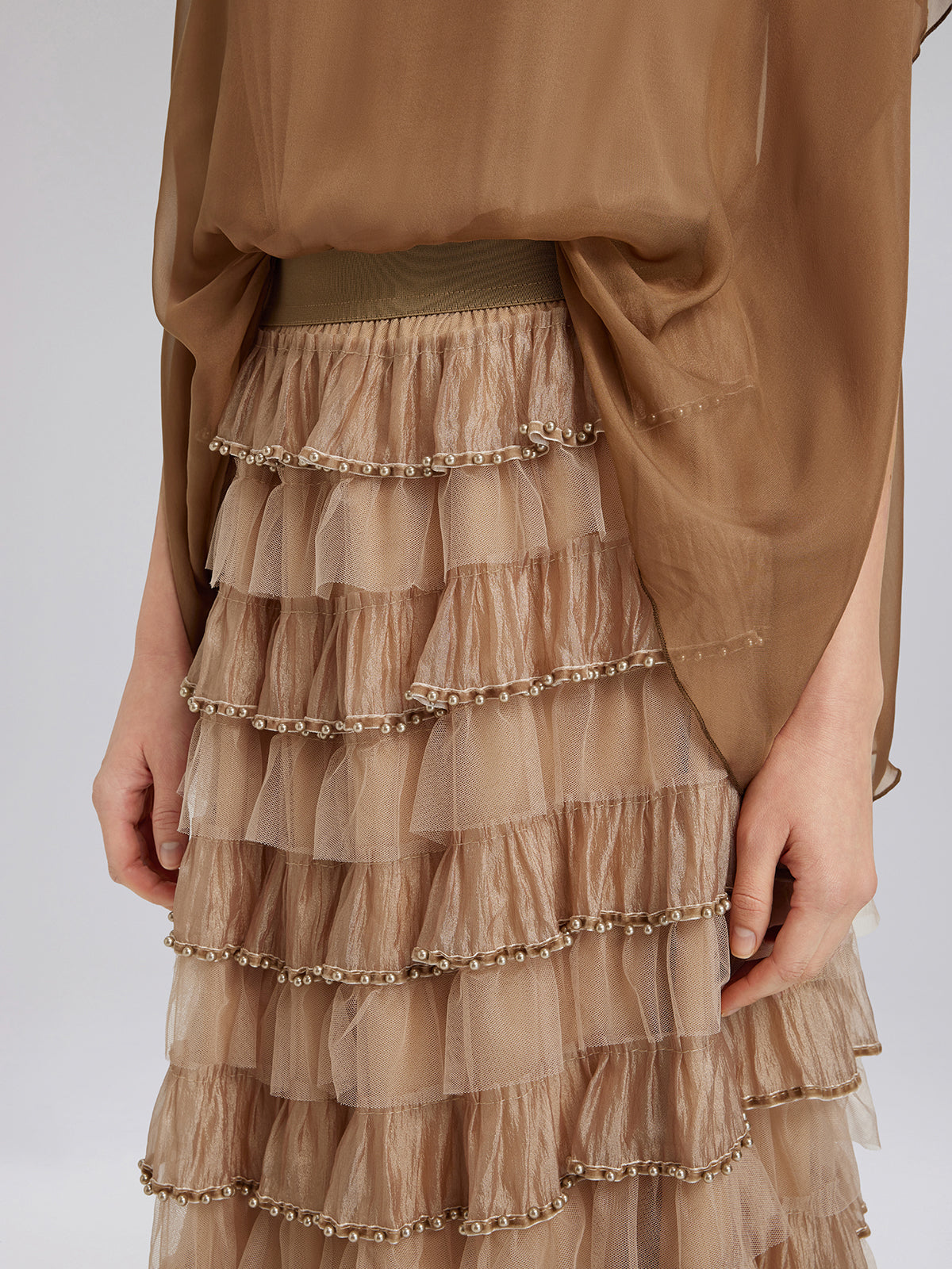 Featuring multiple layers of sheer fabric for rich texture and dimension, this skirt adds an elegant, sculpted look. Delicate bead embellishments trim each tier, enhancing detail and sophistication. The elastic waistband ensures easy wear and all-day comfort.