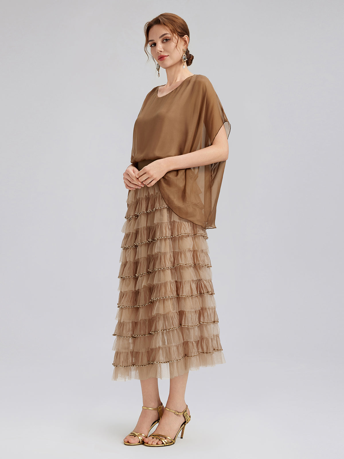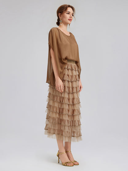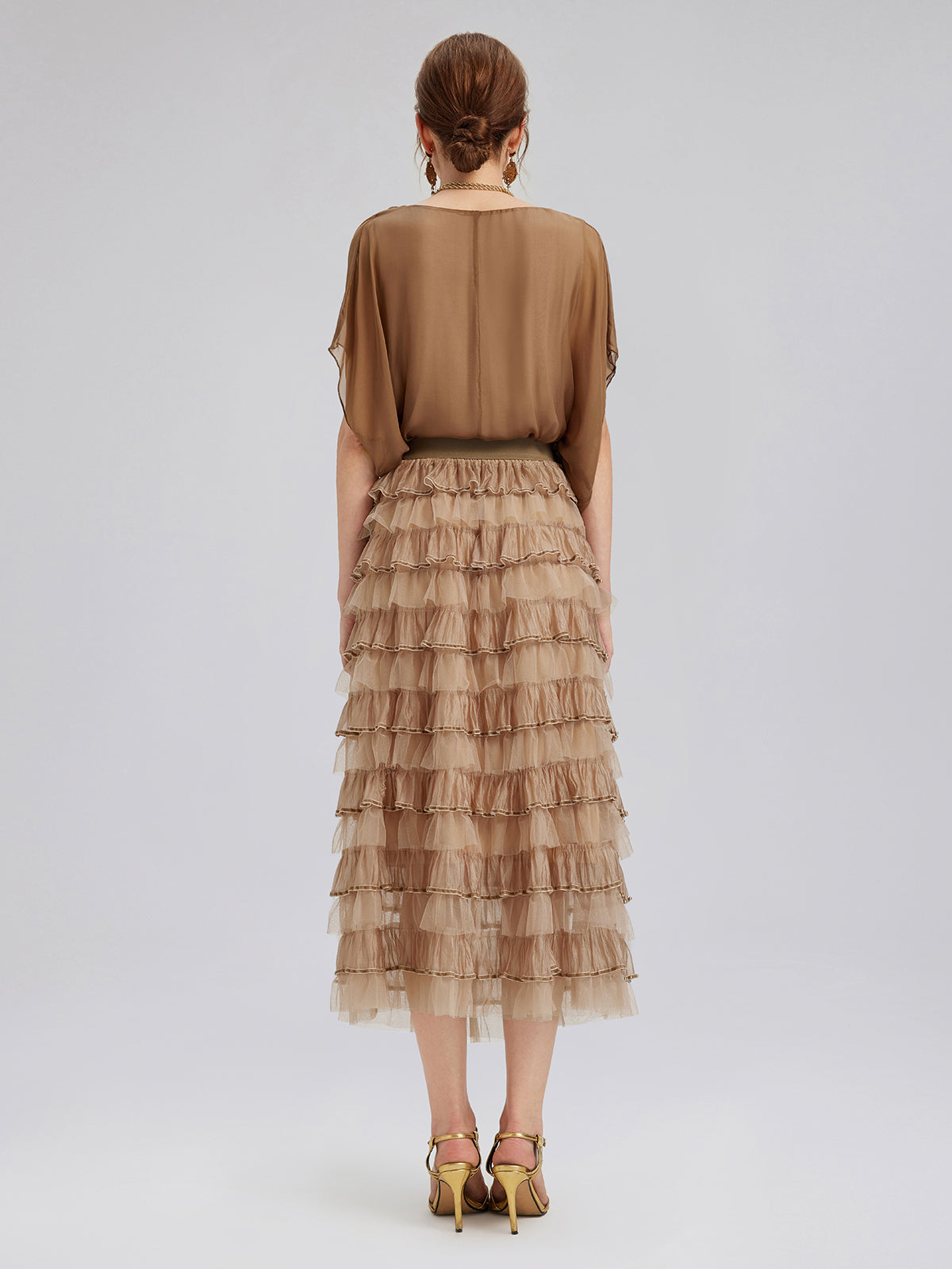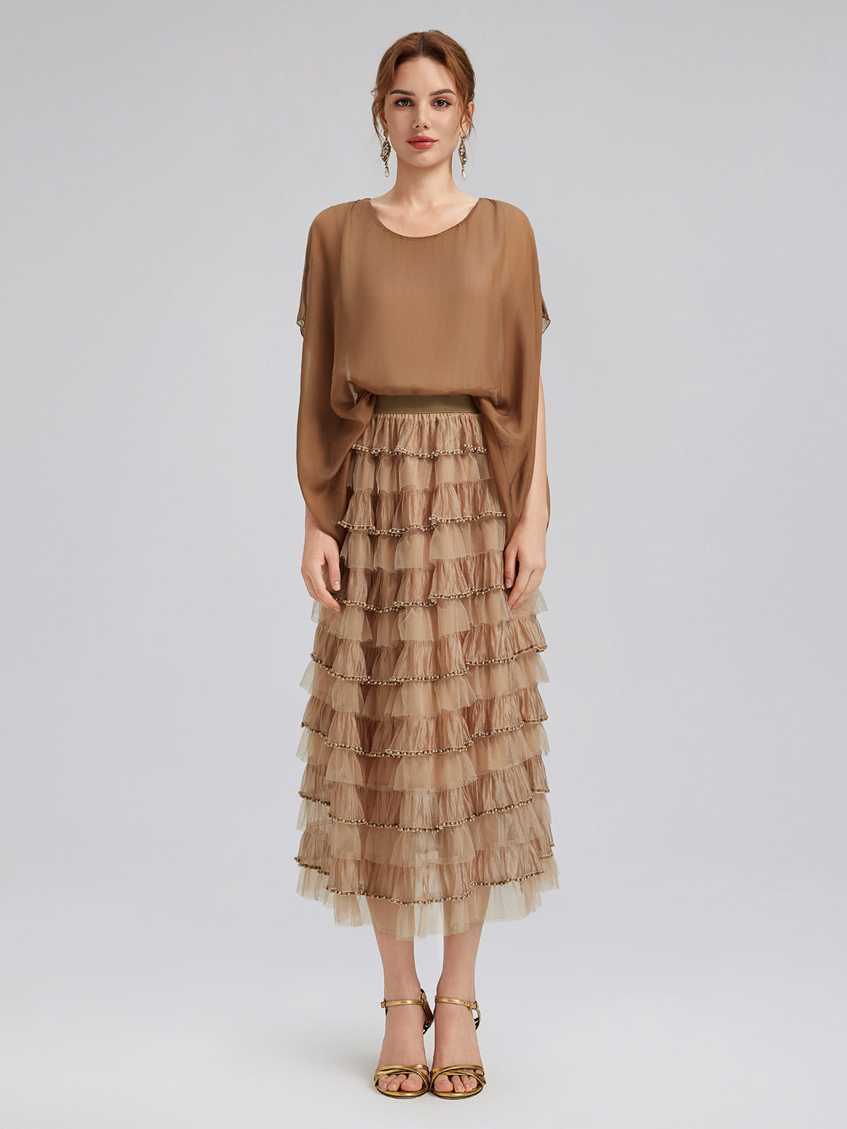 Featuring multiple layers of sheer fabric for rich texture and dimension, this skirt adds an elegant, sculpted look. Delicate bead embellishments trim each tier, enhancing detail and sophistication. The elastic waistband ensures easy wear and all-day comfort.