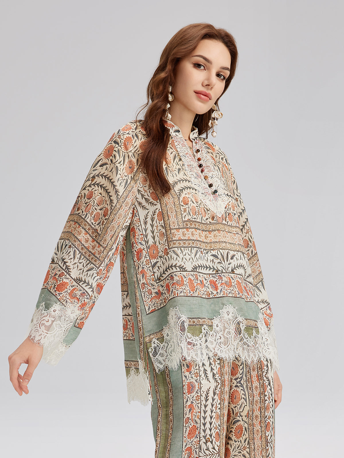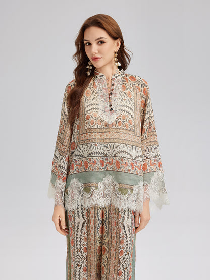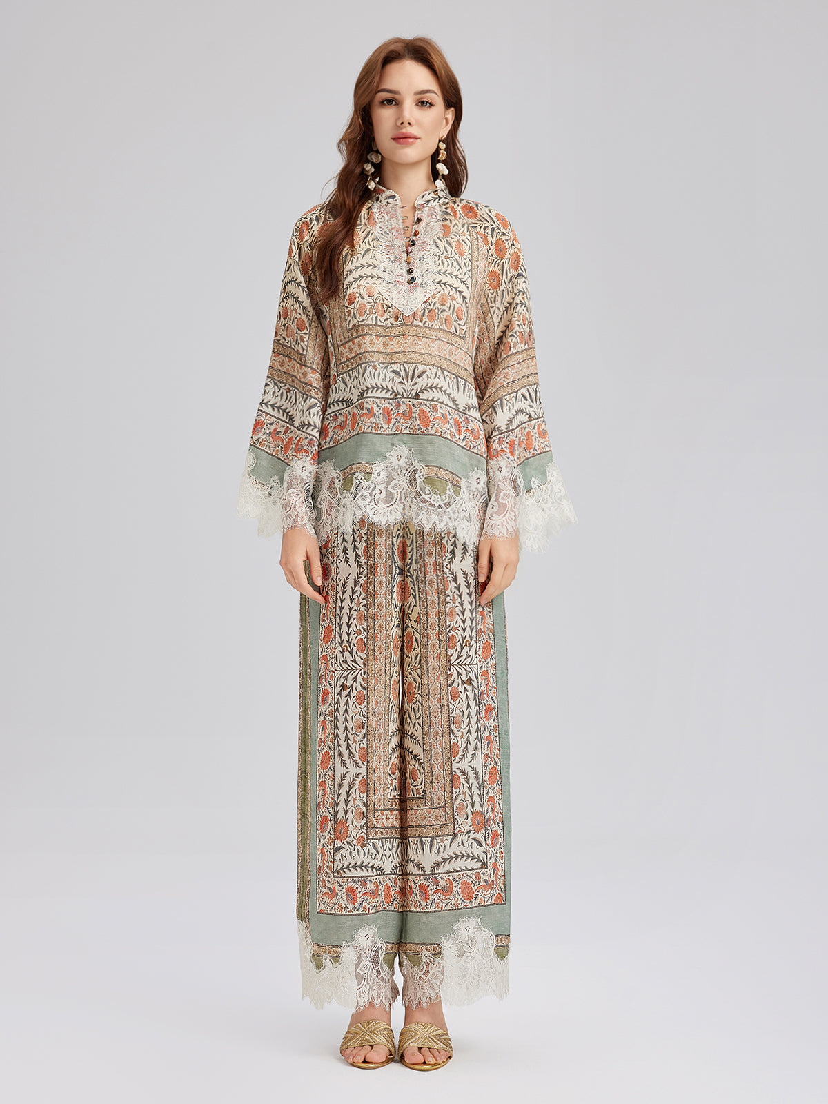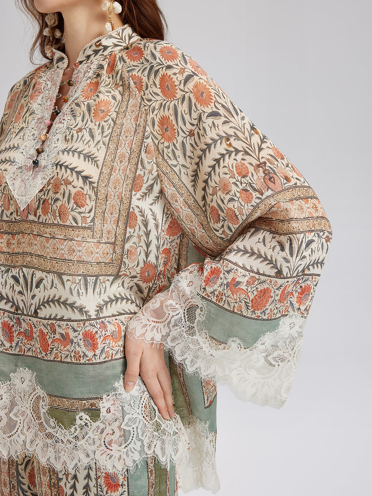 Faded botanical prints whisper of vintage tales, paired with a gently reimagined Victorian collar and intricate lace-trimmed cuffs. Handcrafted lace at the hem reveals delicate artistry. And as you move, these details subtly unfold, bringing timeless elegance to life.