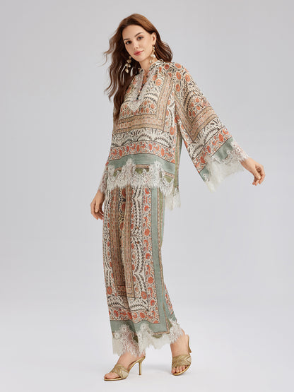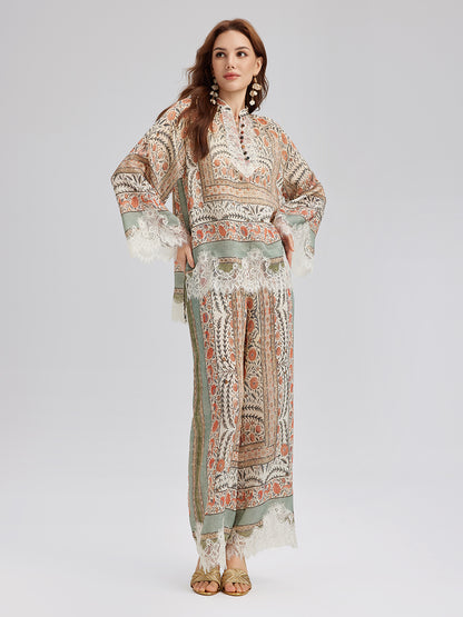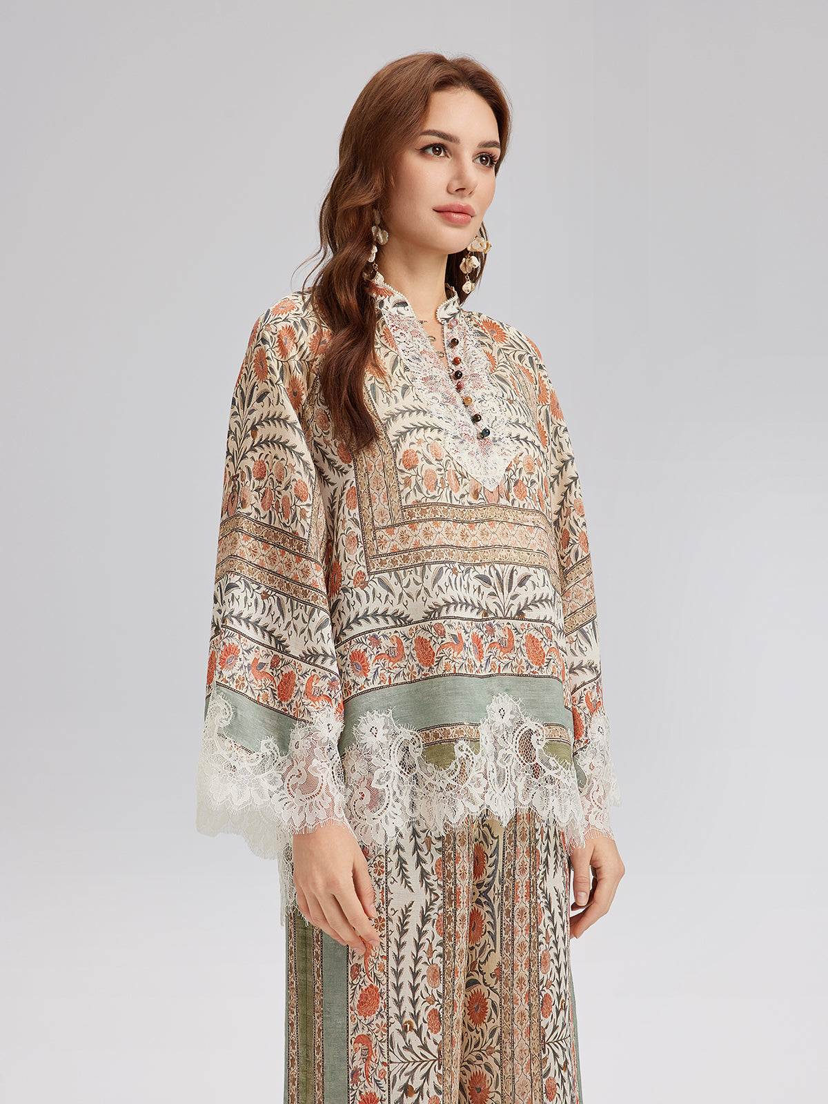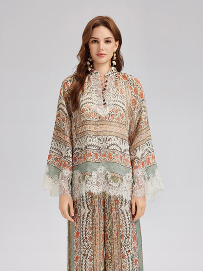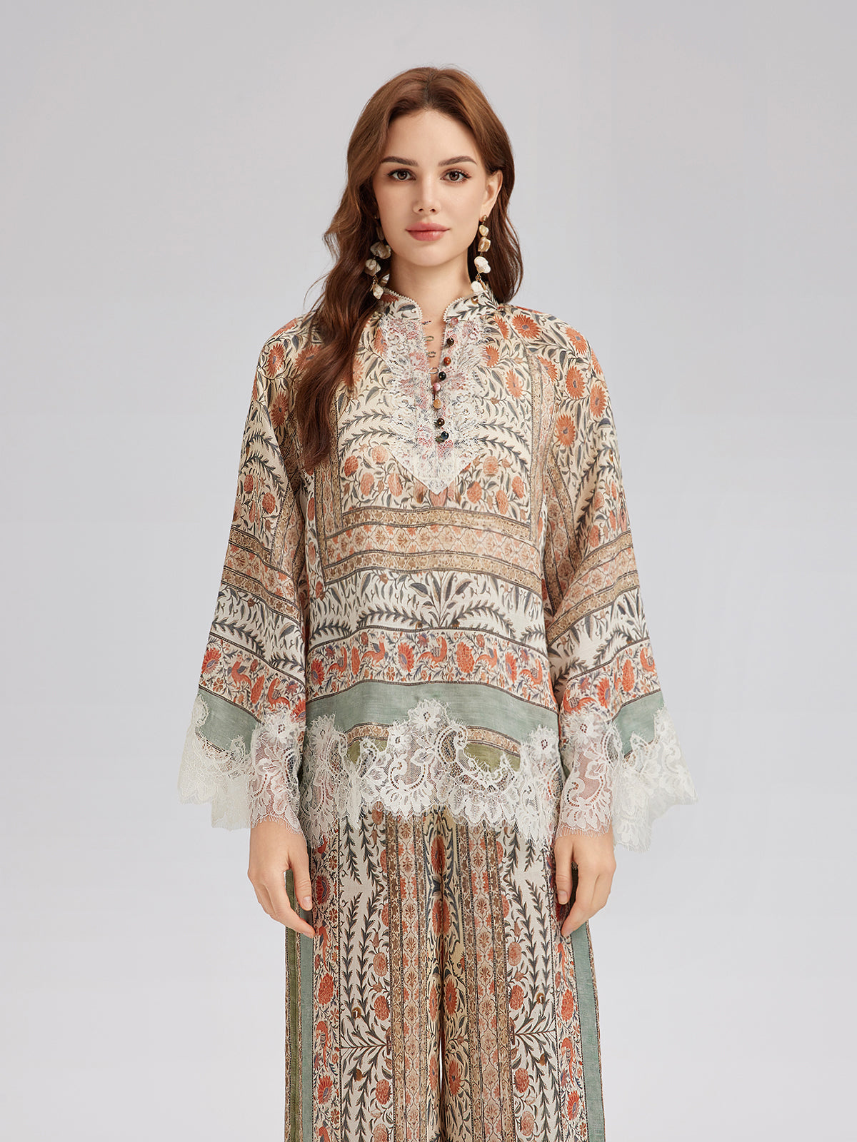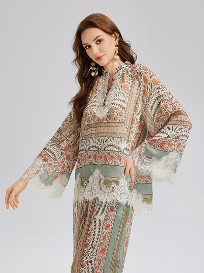 Faded botanical prints whisper of vintage tales, paired with a gently reimagined Victorian collar and intricate lace-trimmed cuffs. Handcrafted lace at the hem reveals delicate artistry. And as you move, these details subtly unfold, bringing timeless elegance to life.