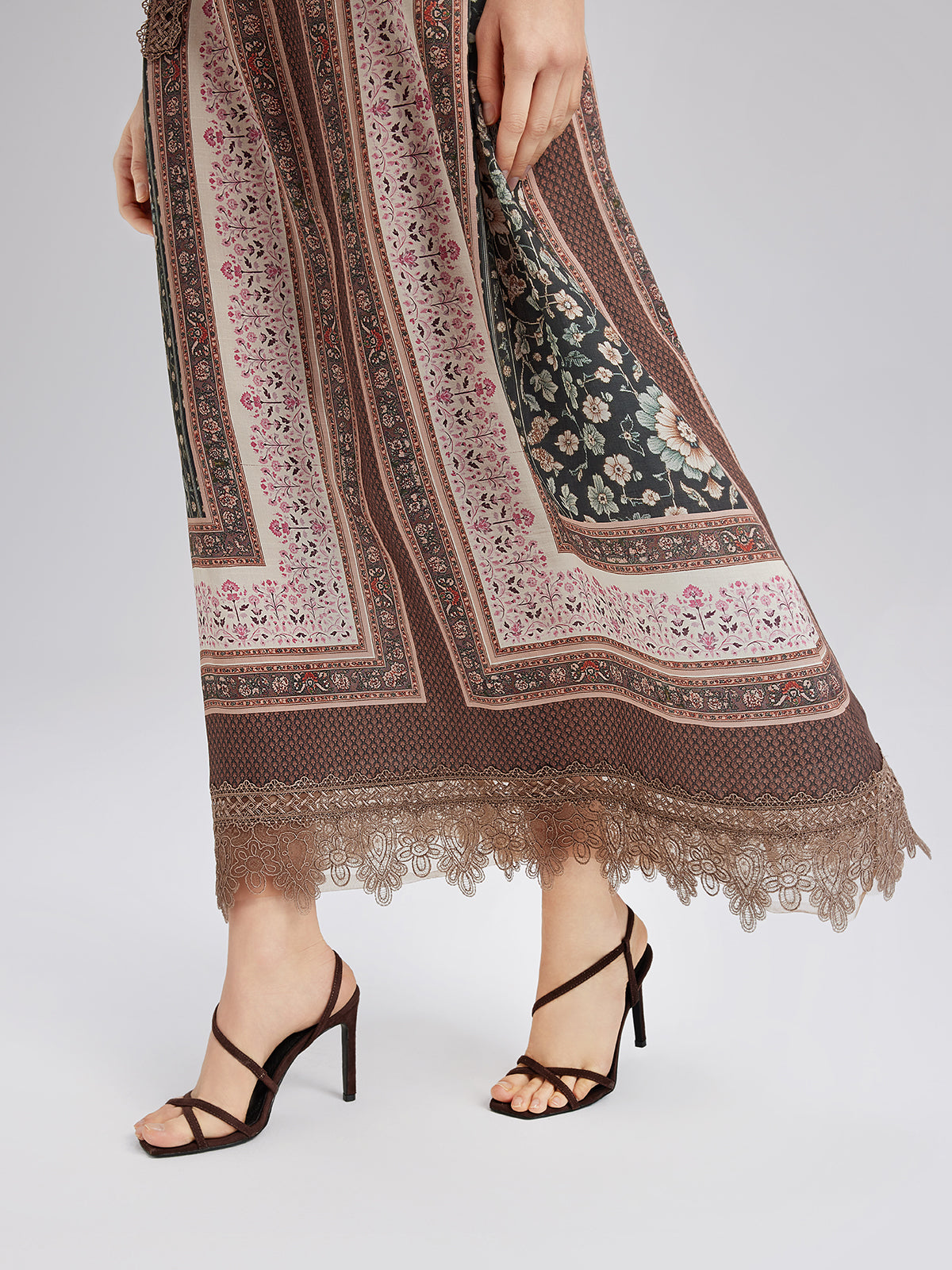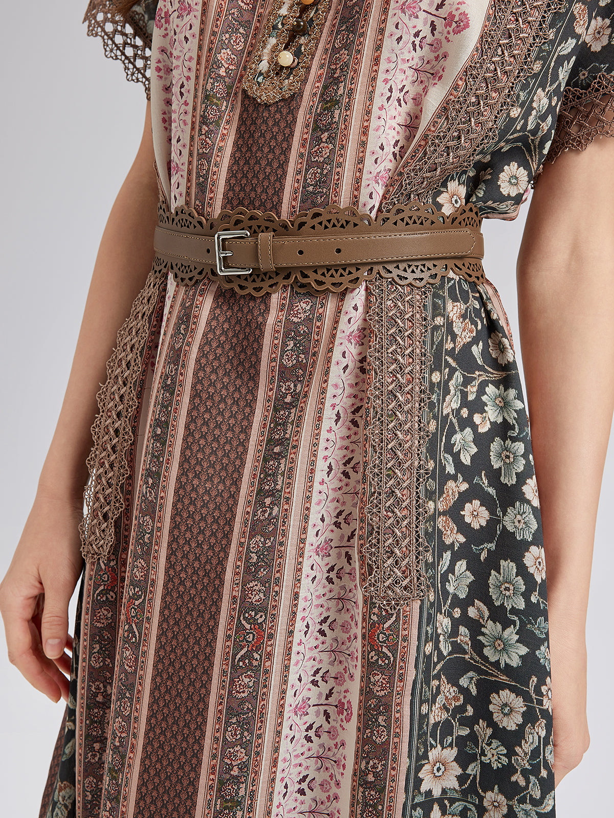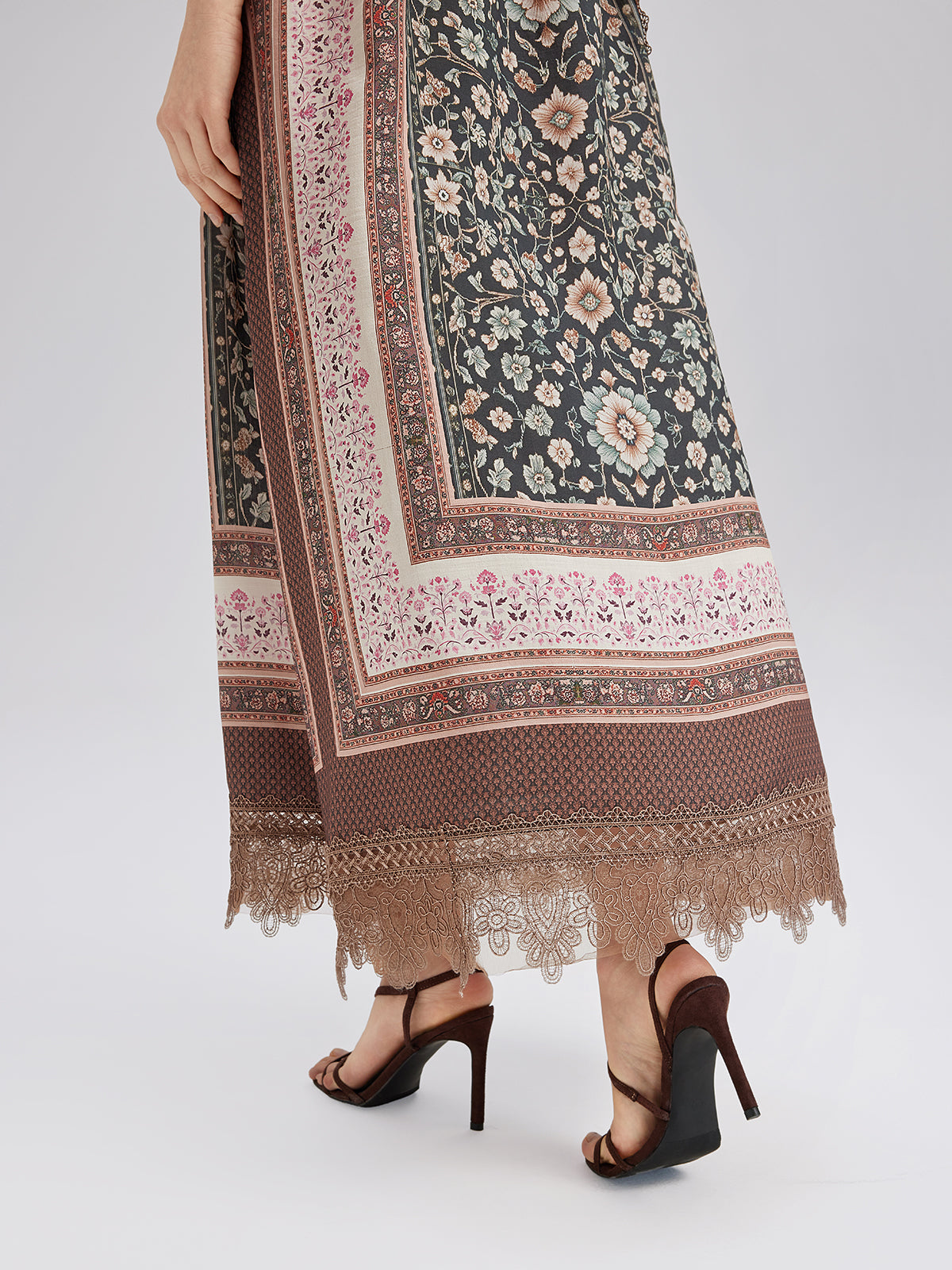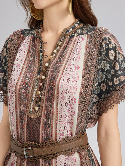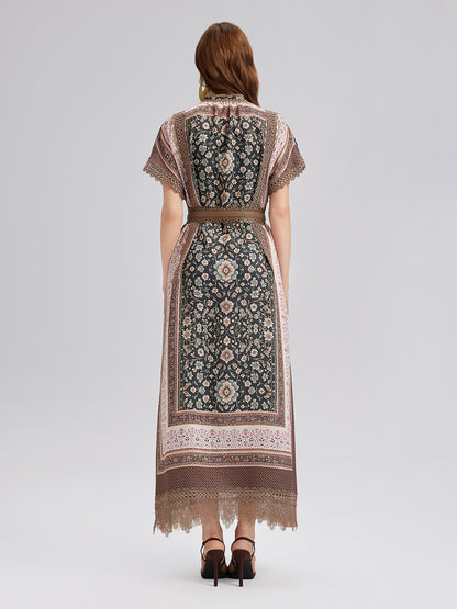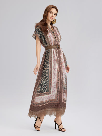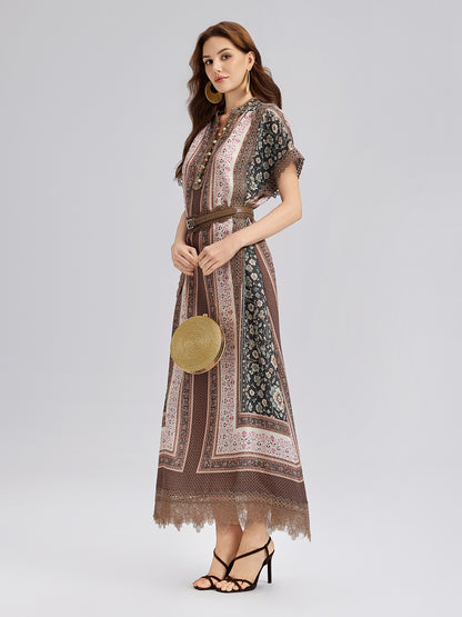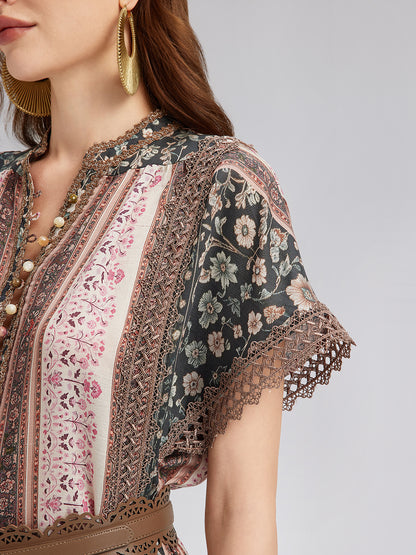 Botanical Print Lace-Trimmed Dress