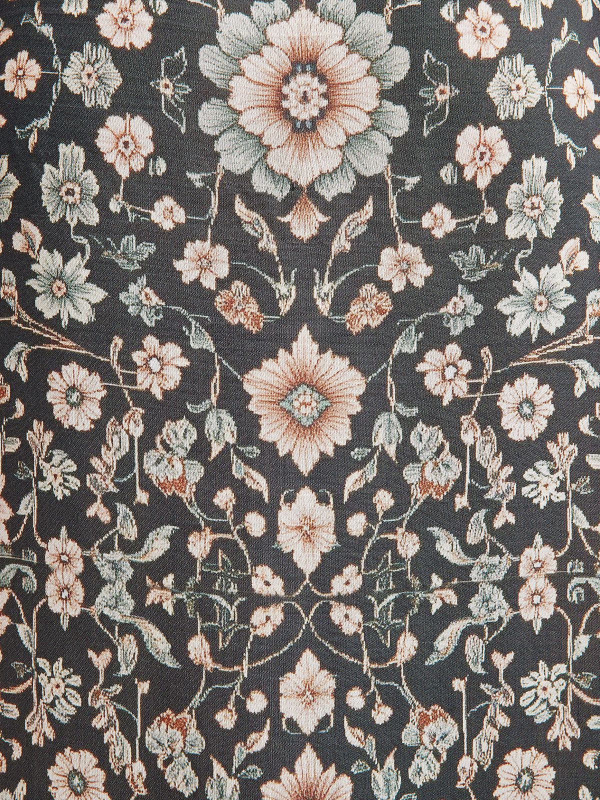 Made from crisp lyocell blend with a fluid drape. Hand-placed botanical prints pair with lace trim for rich texture. Embossed lace flows from the shoulders and waist to the cuffs and hem. Jewel-like front buttons add a refined touch. Relaxed silhouette flatters with ease.