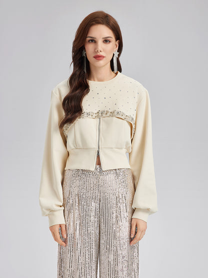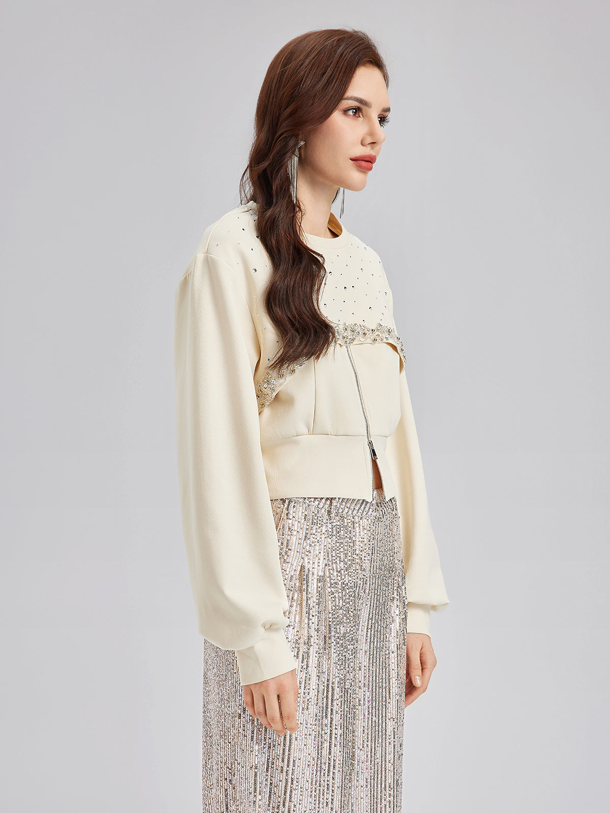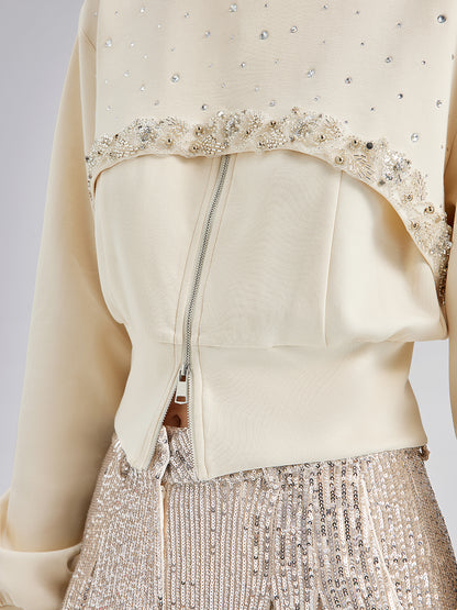 Diamond-Embellished Zipper Vest & Non-hooded Set