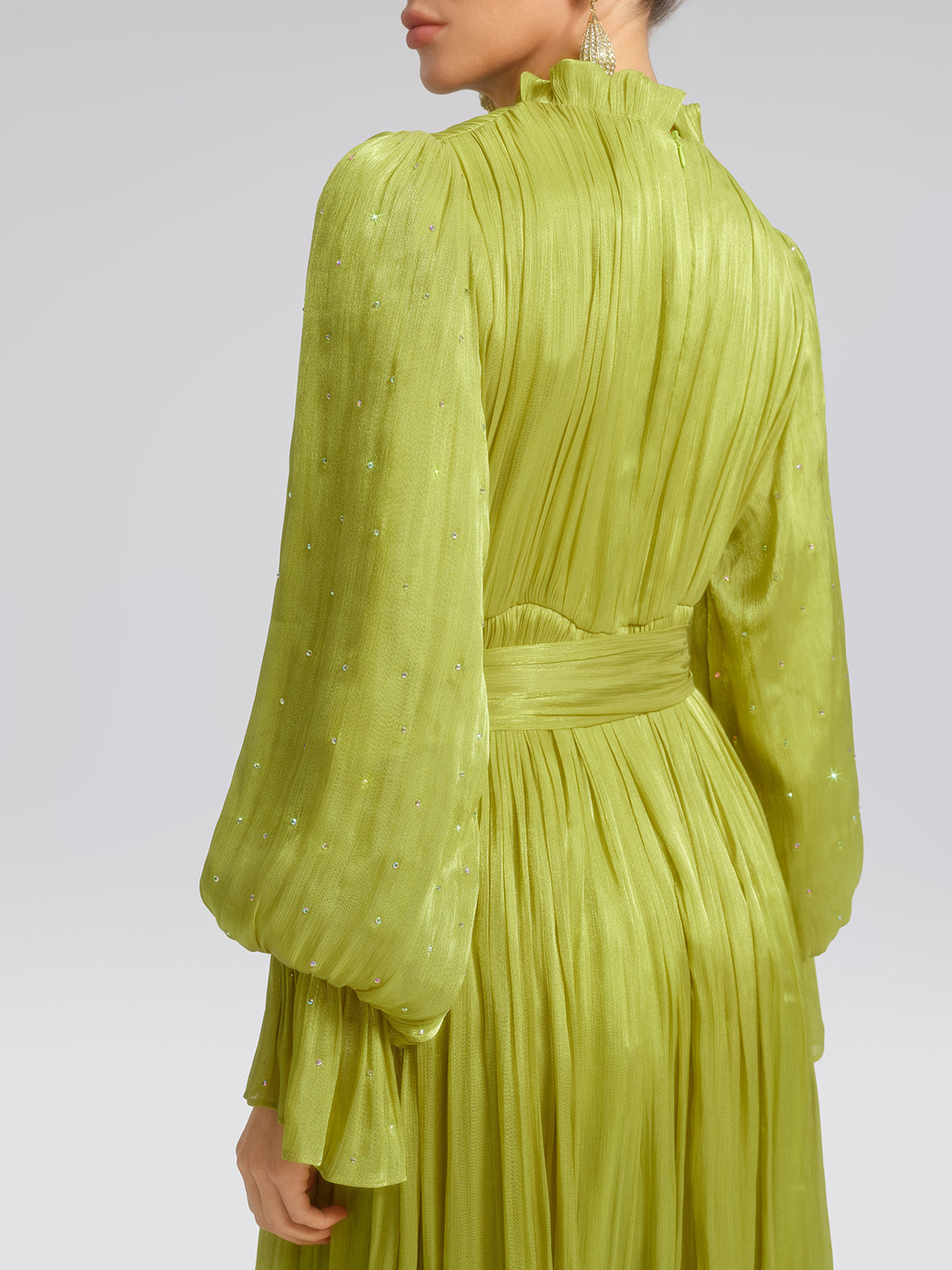 Soft pleating adds depth and dimension to the flowing silhouette. Balloon-sleeved garments add a sense of lightness and movement, while the included green belt defines the waist for a refined, balanced look.