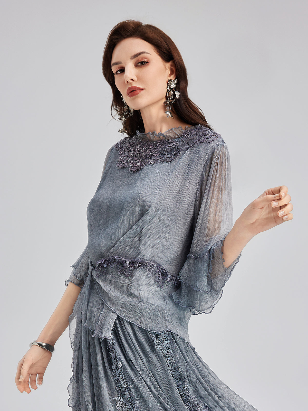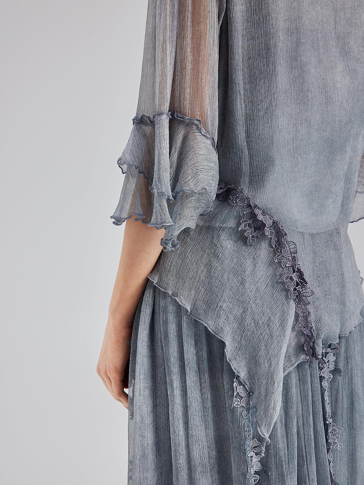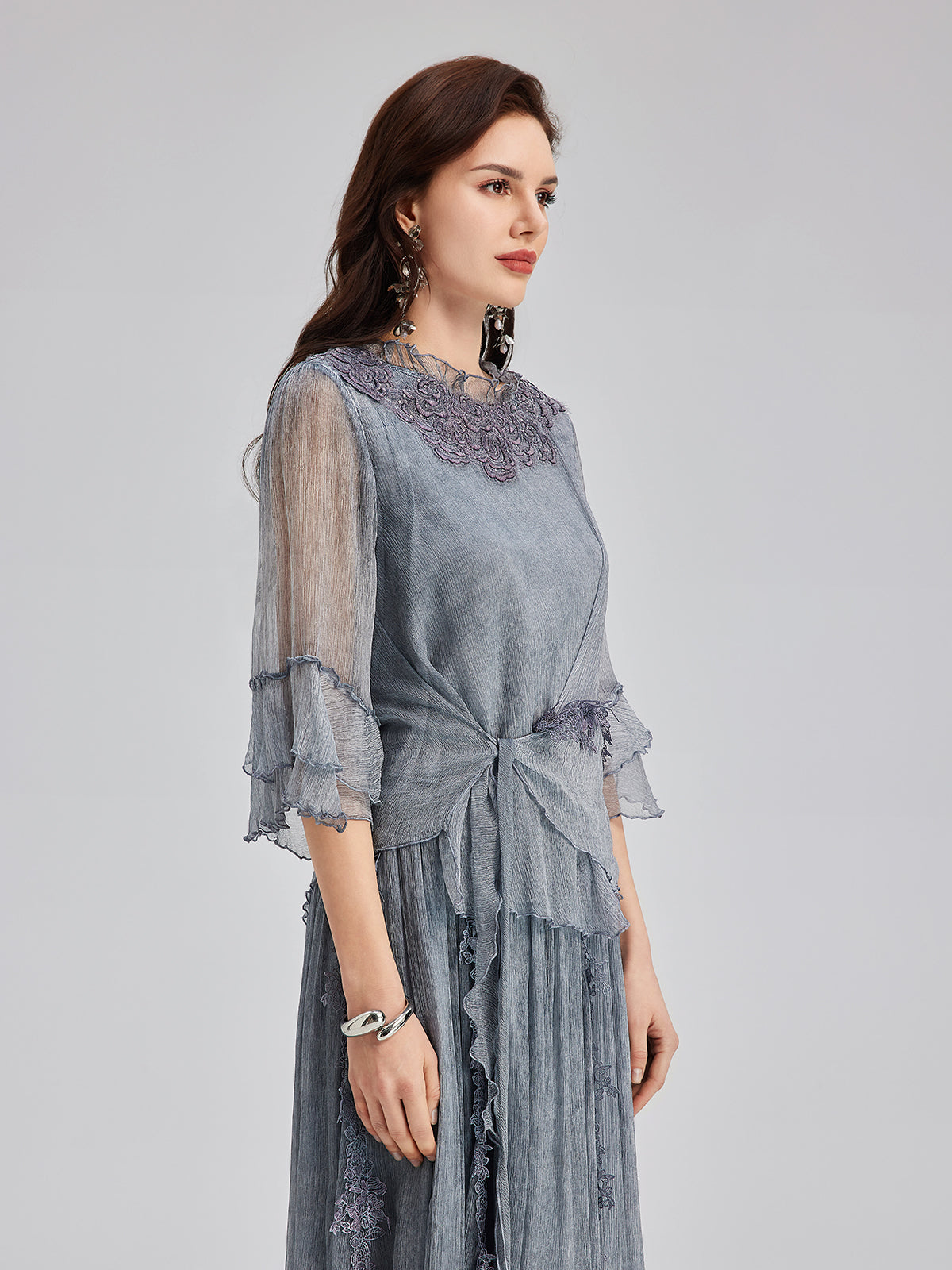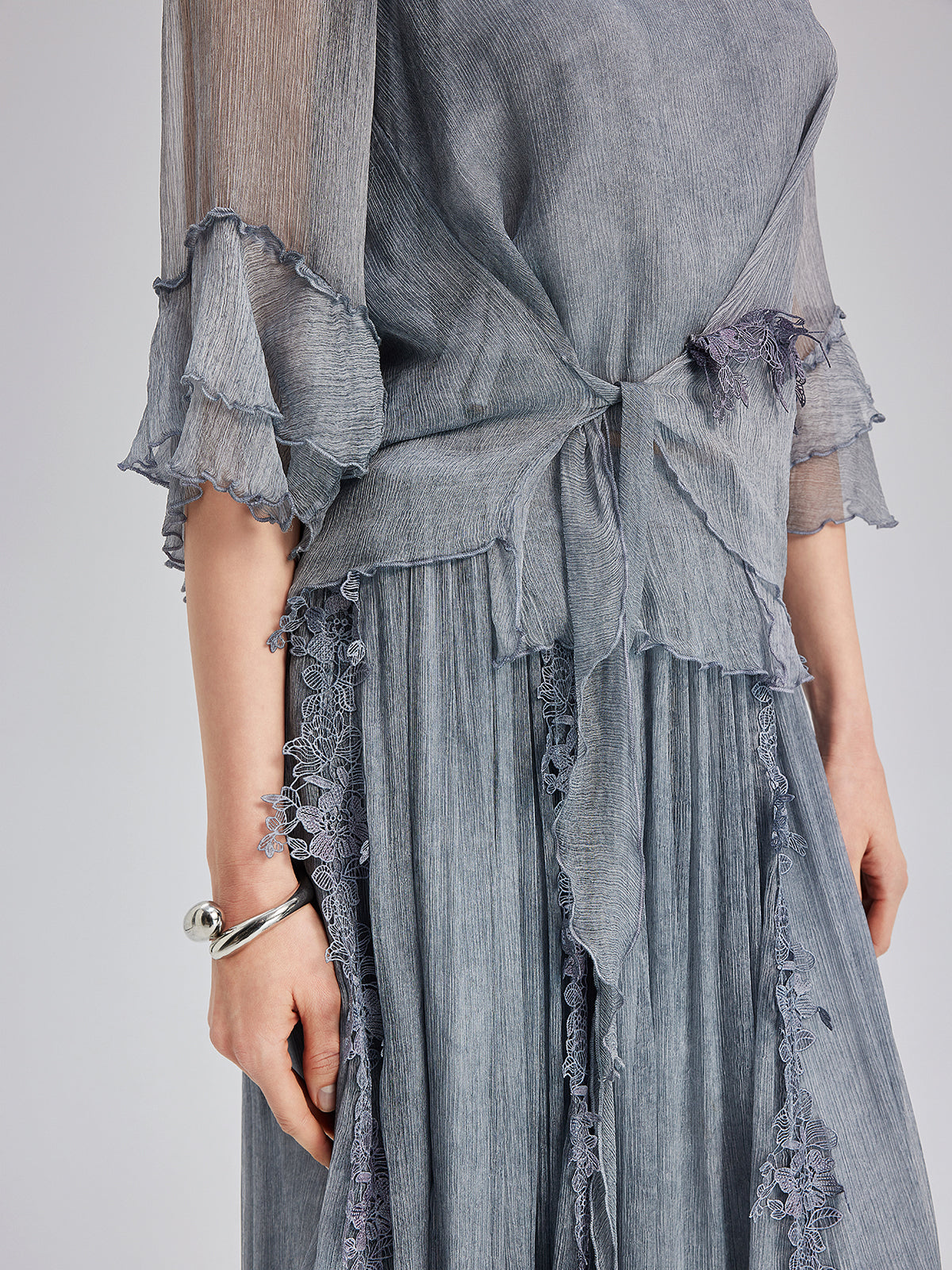 Made from silk with a natural, plant-dye technique, perfect for spring and summer. The neckline is adorned with delicate lace, adding layzer. The mid-length sleeves feature lace trims that complement the neckline. The asymmetrical hem has an adjustable tie for added style and flexibility.