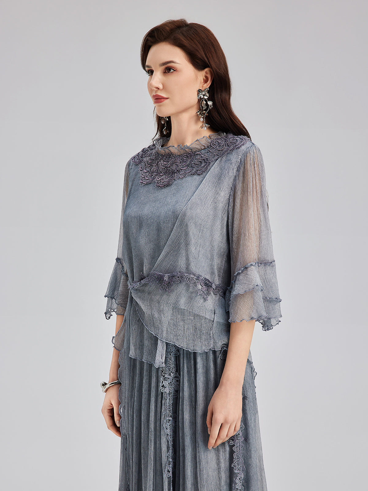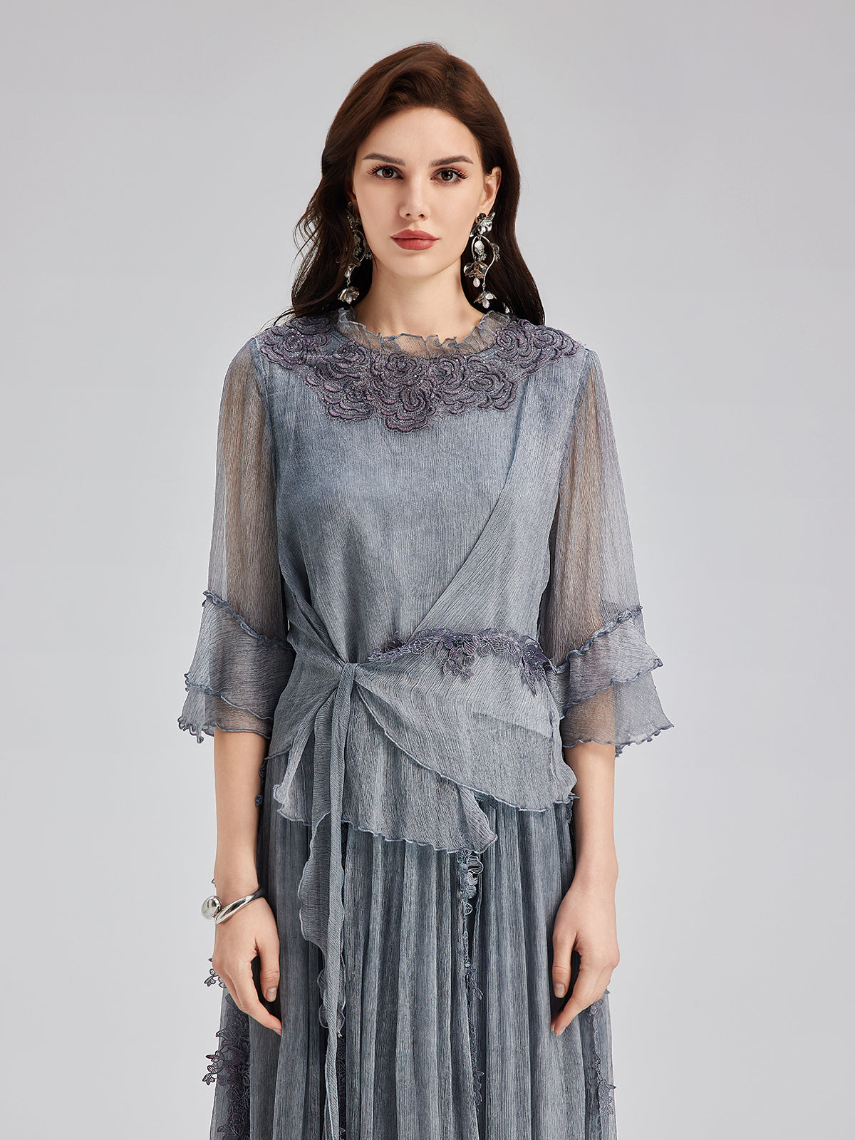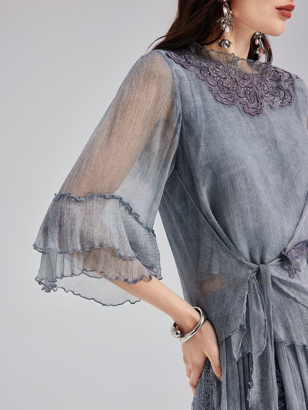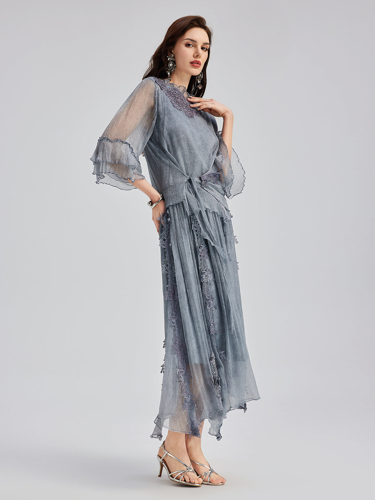 Made from silk with a natural, plant-dye technique, perfect for spring and summer. The neckline is adorned with delicate lace, adding layzer. The mid-length sleeves feature lace trims that complement the neckline. The asymmetrical hem has an adjustable tie for added style and flexibility.