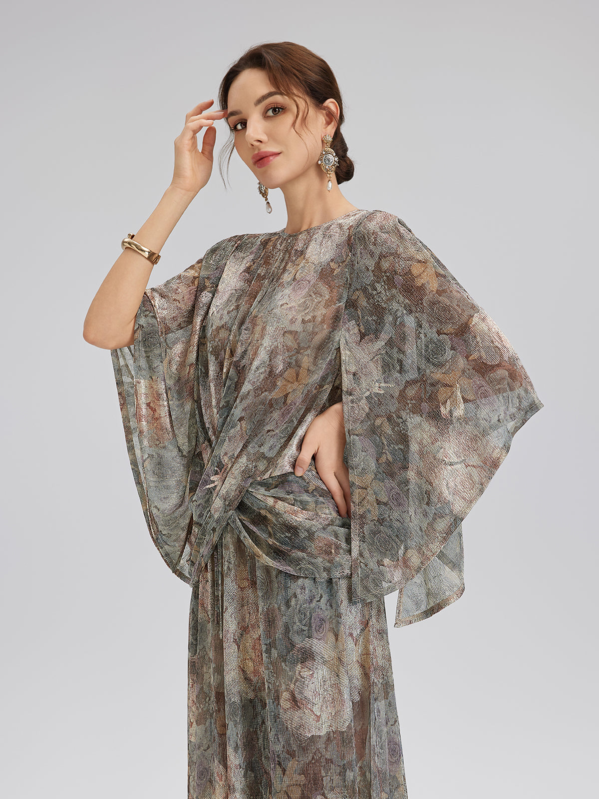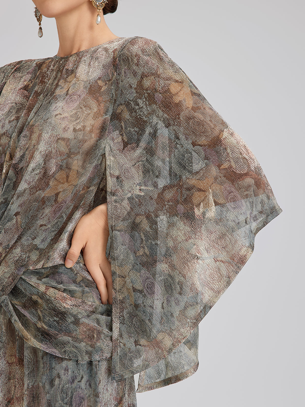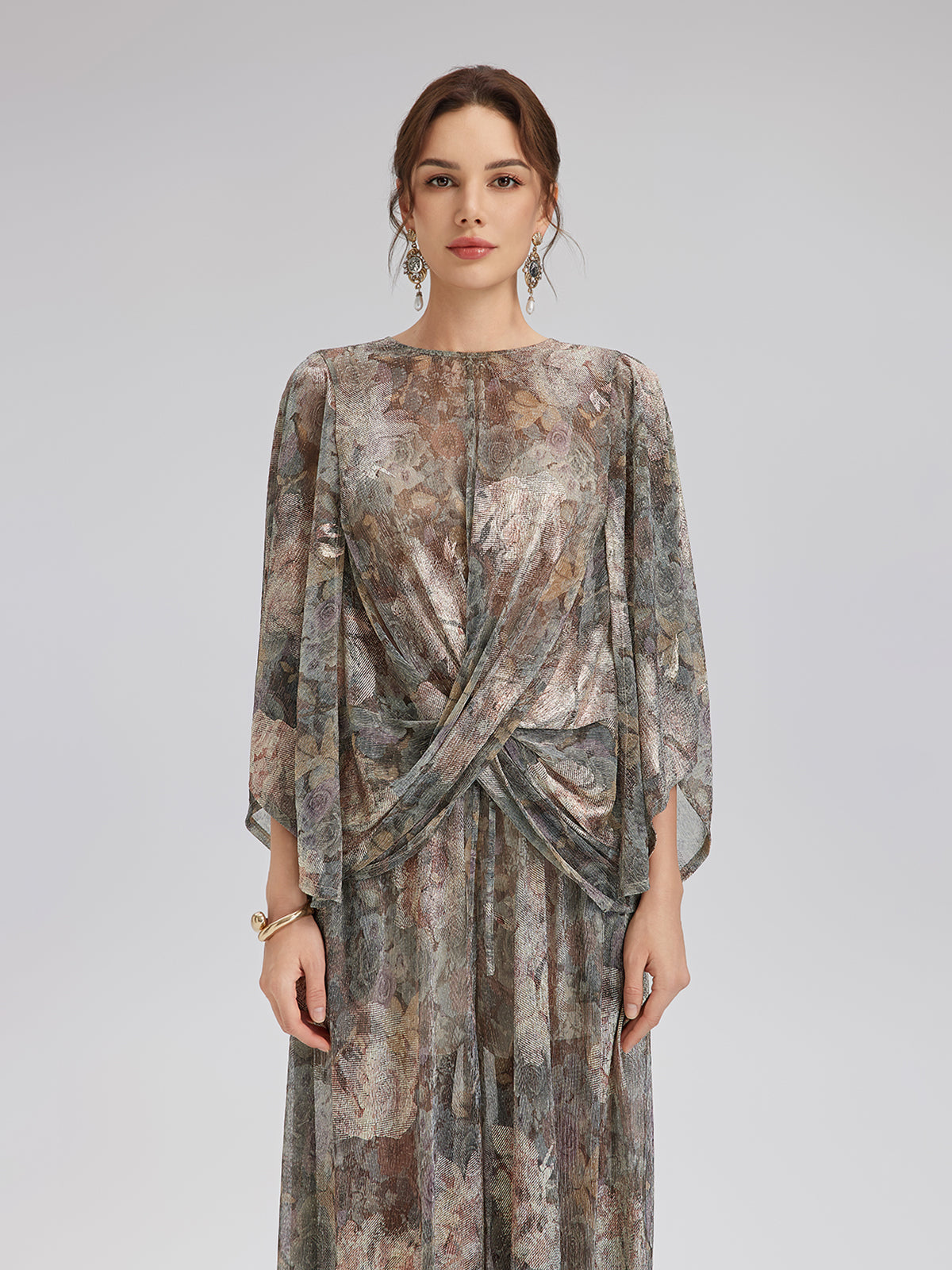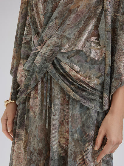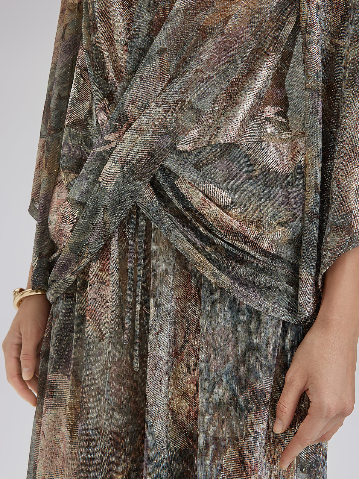 Made from lurex knit with subtle stretch, combining purple-brown floral print and gold foil detailing. Features an asymmetrical hem with ruched crossover sides, adding a stylish twist. The fabric shimmers with movement, while the back keyhole button makes it easy to slip on and off.