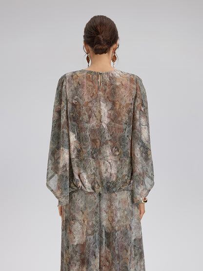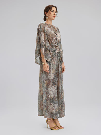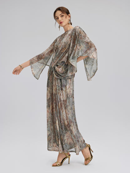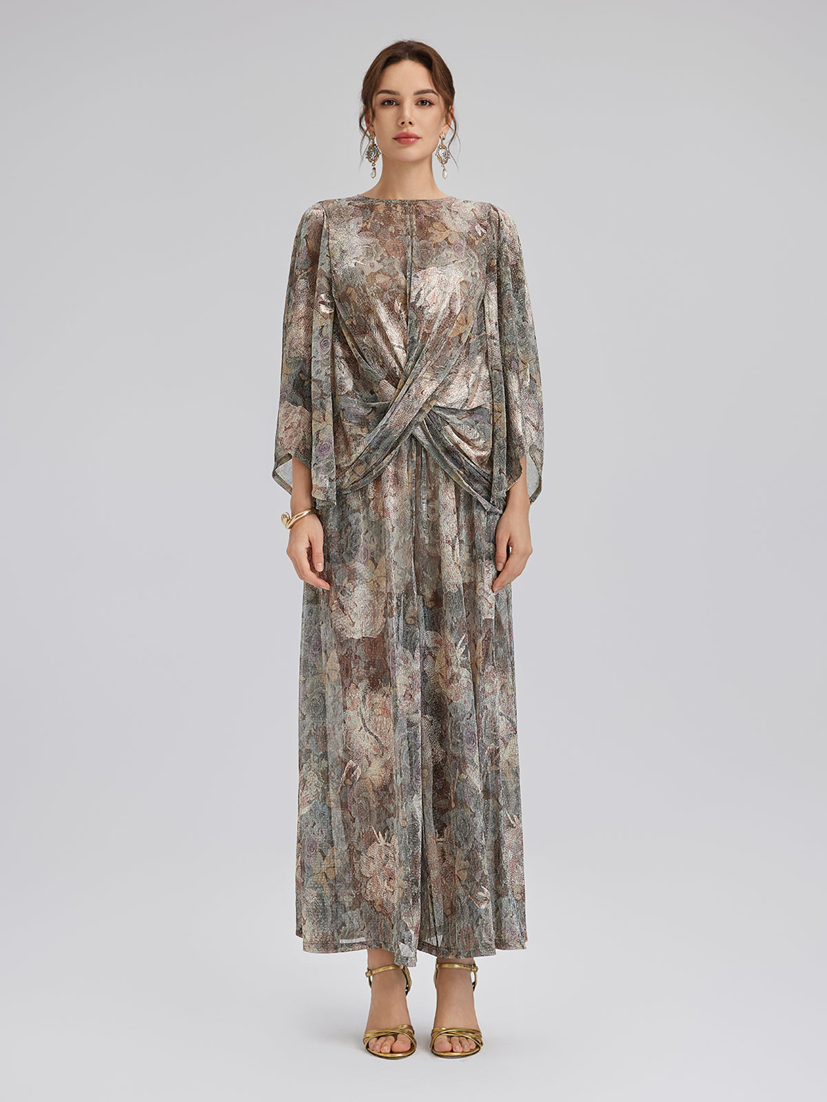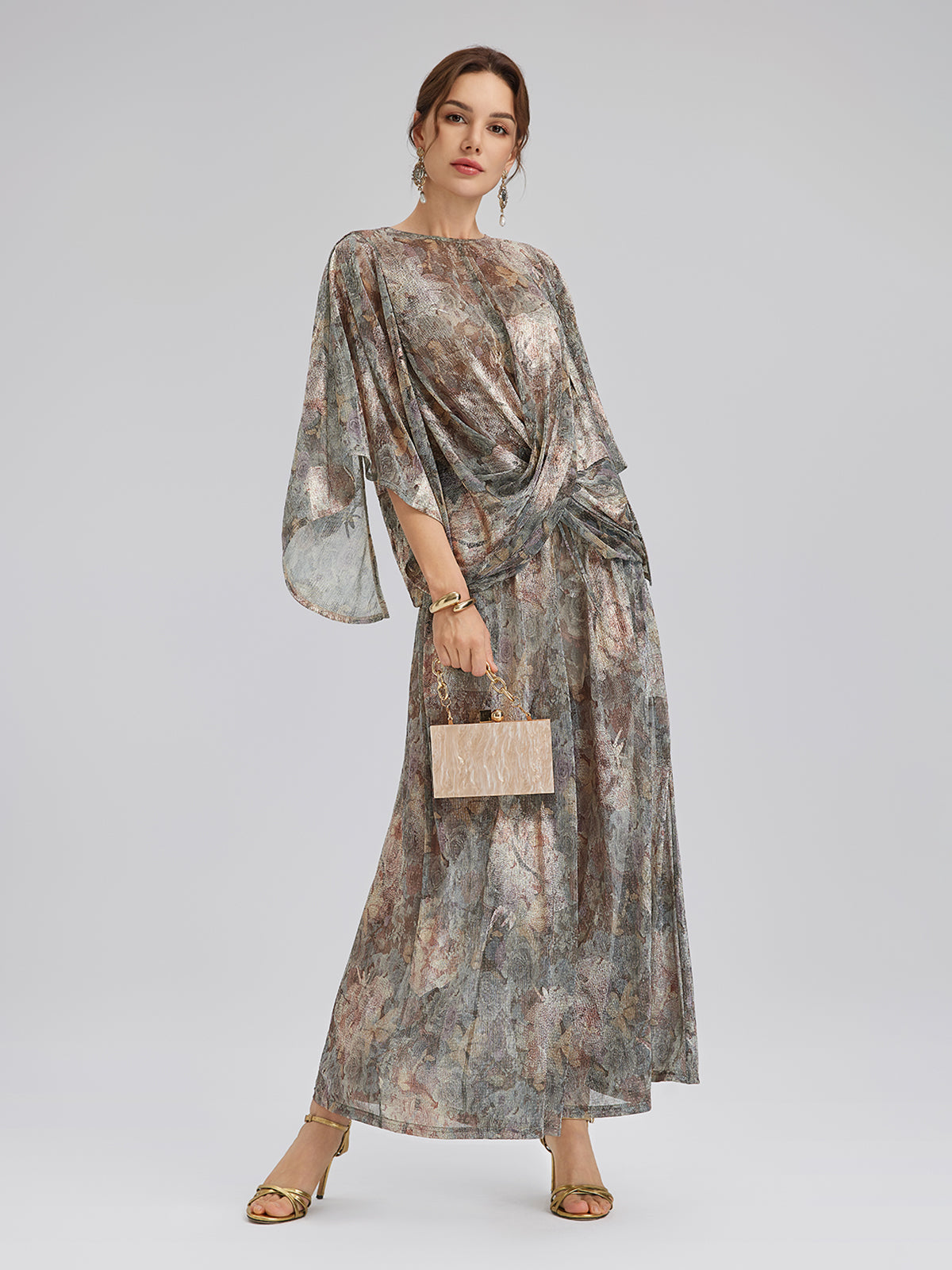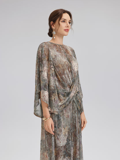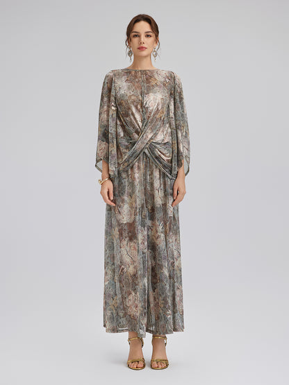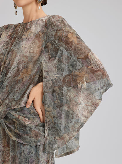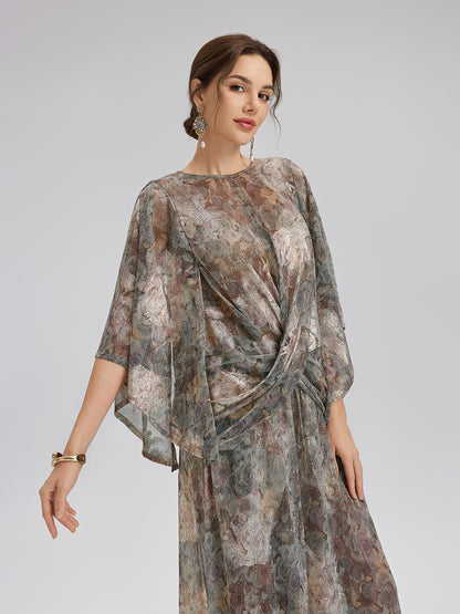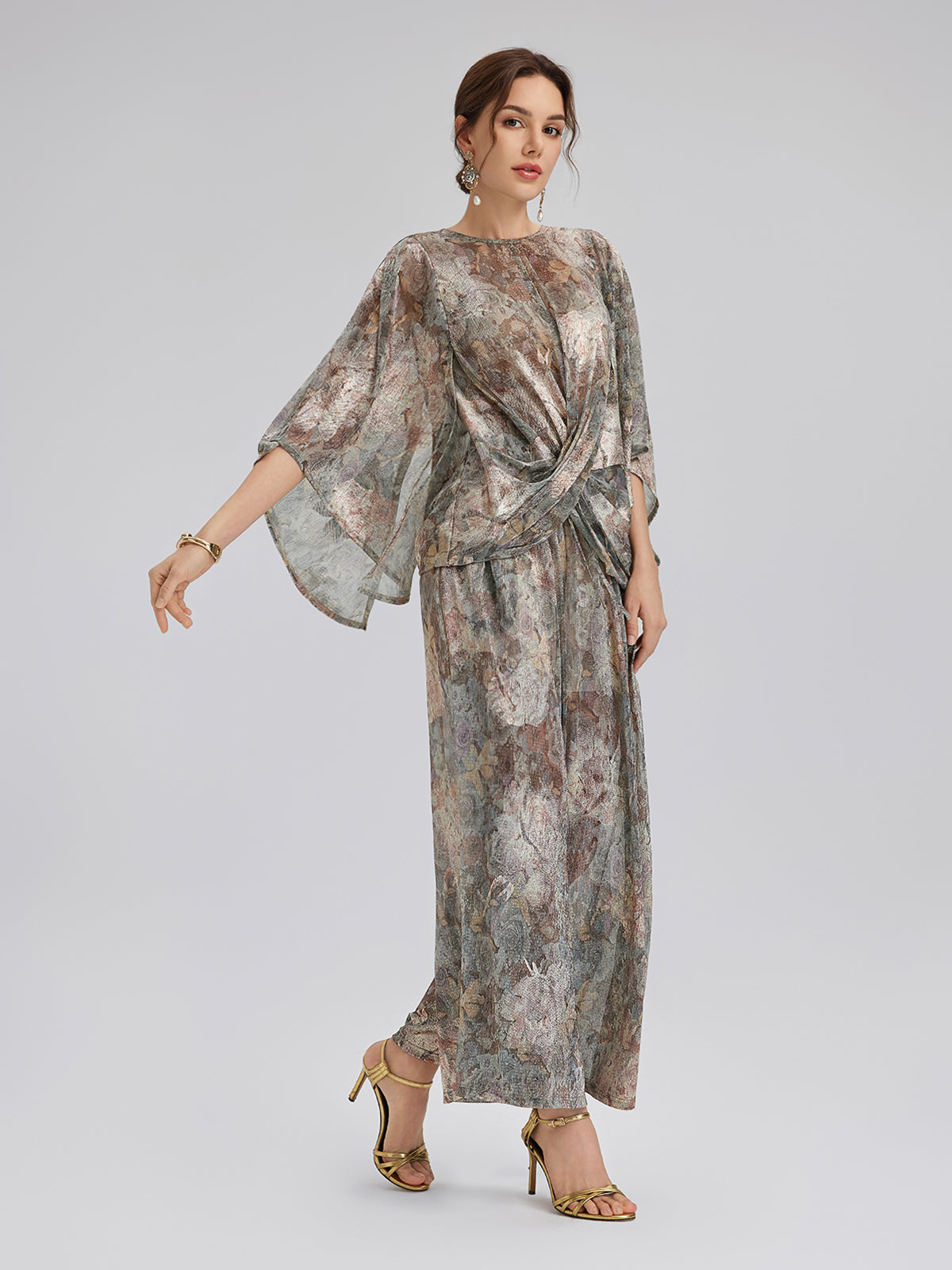 Made from lurex knit with subtle stretch, combining purple-brown floral print and gold foil detailing. Features an asymmetrical hem with ruched crossover sides, adding a stylish twist. The fabric shimmers with movement, while the back keyhole button makes it easy to slip on and off.