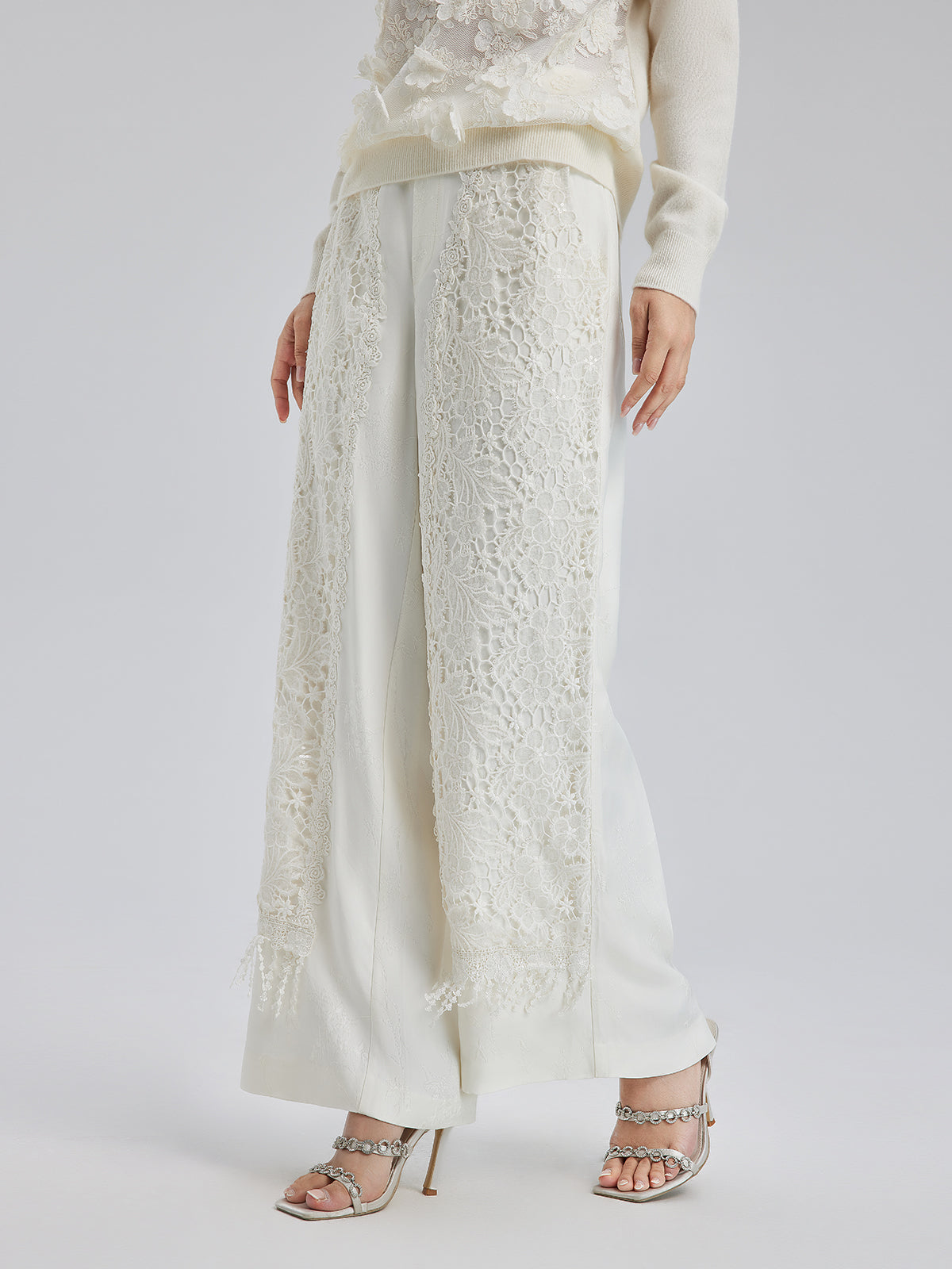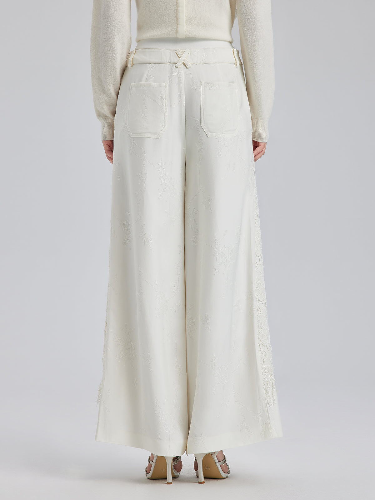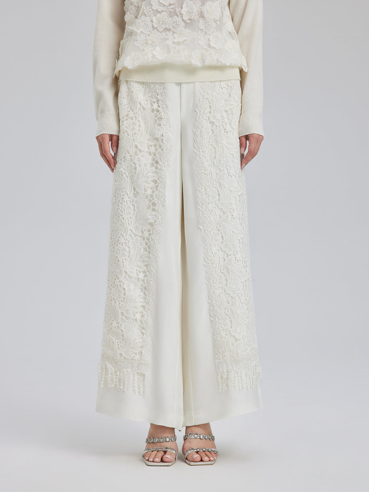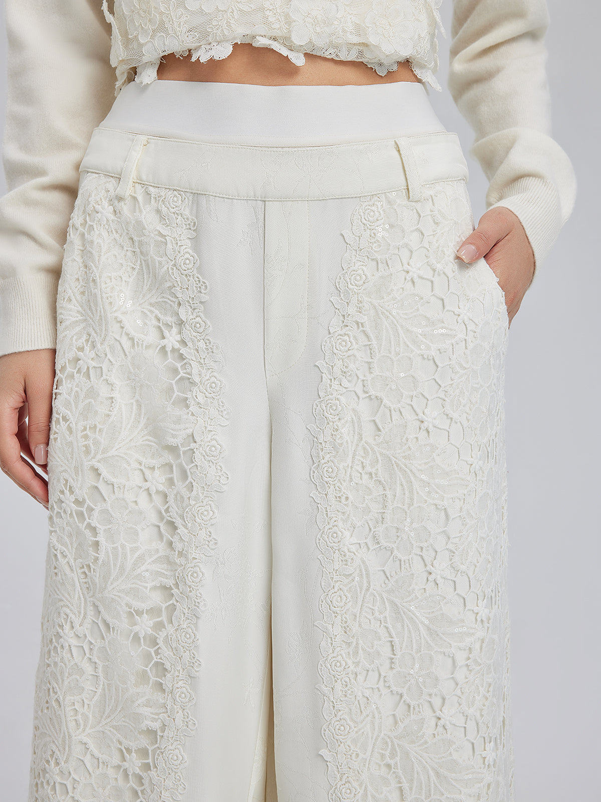 Crafted with high-end textured lace and jacquard satin, it is adorned with sequins for a unique and elegant touch. The double-layer waistband with side zipper ensures comfort and a perfect fit, blending casual and sophisticated style.