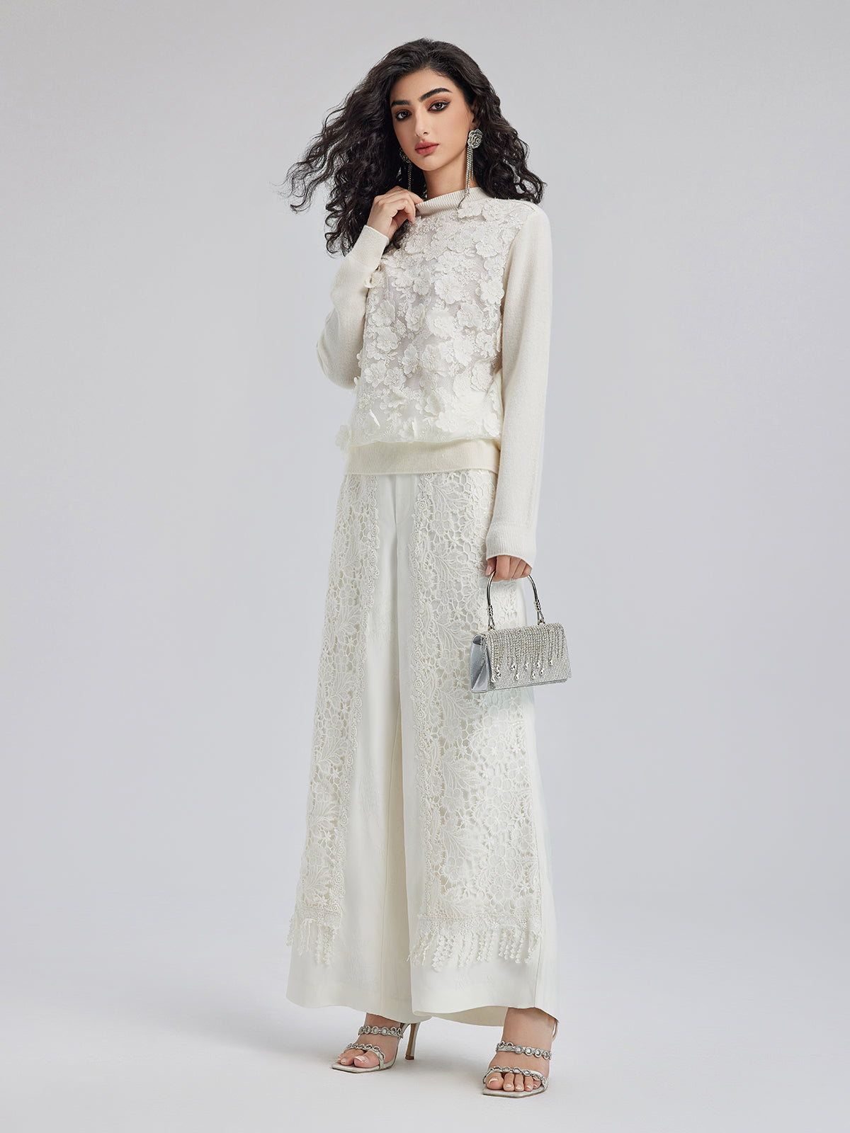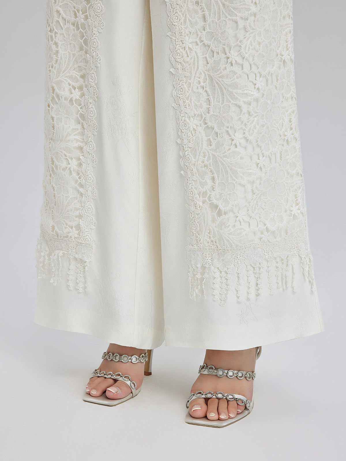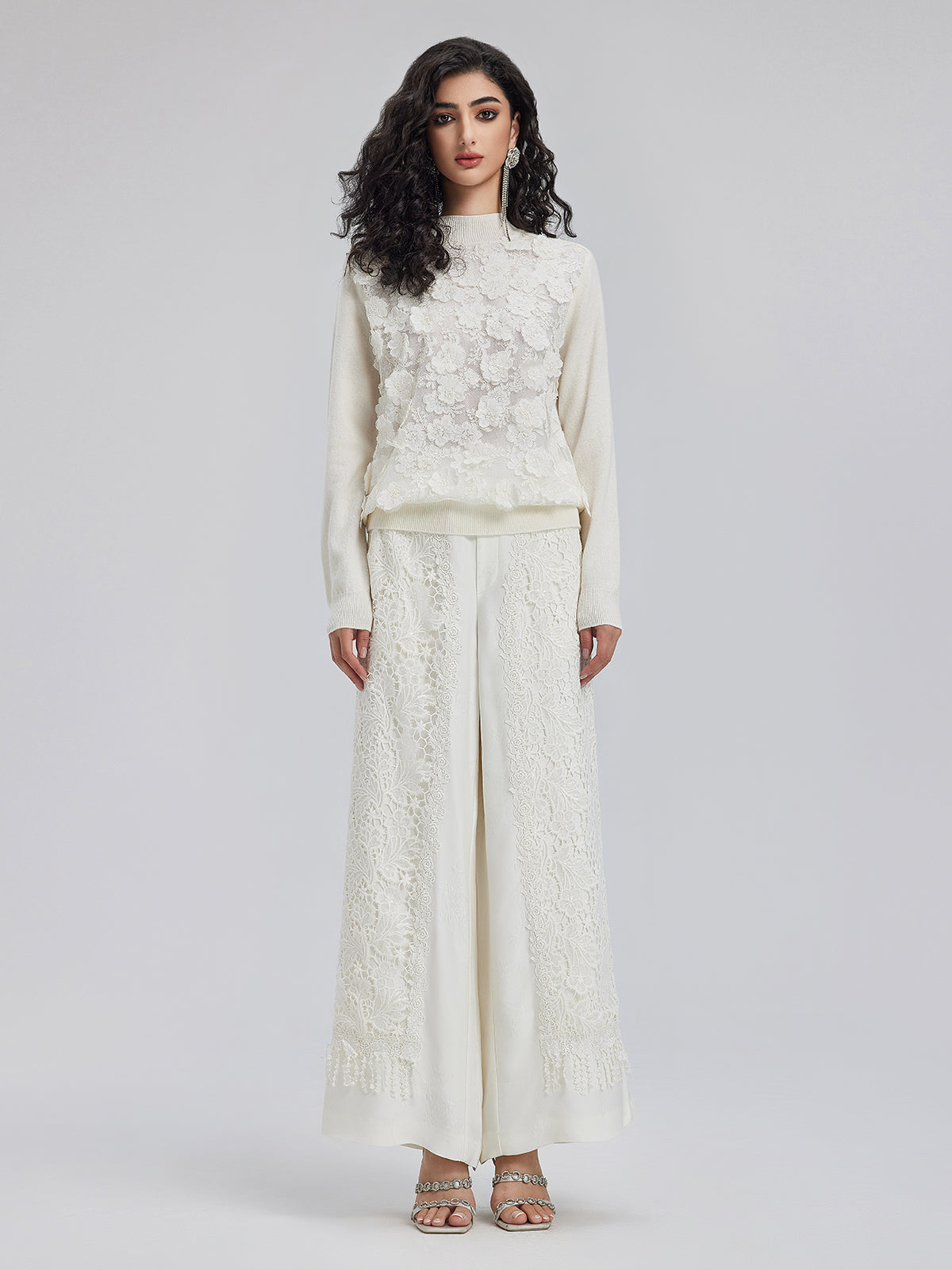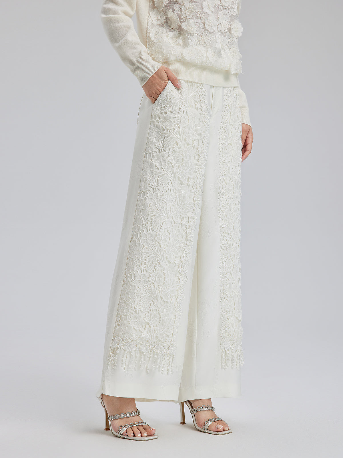 Crafted with high-end textured lace and jacquard satin, it is adorned with sequins for a unique and elegant touch. The double-layer waistband with side zipper ensures comfort and a perfect fit, blending casual and sophisticated style.