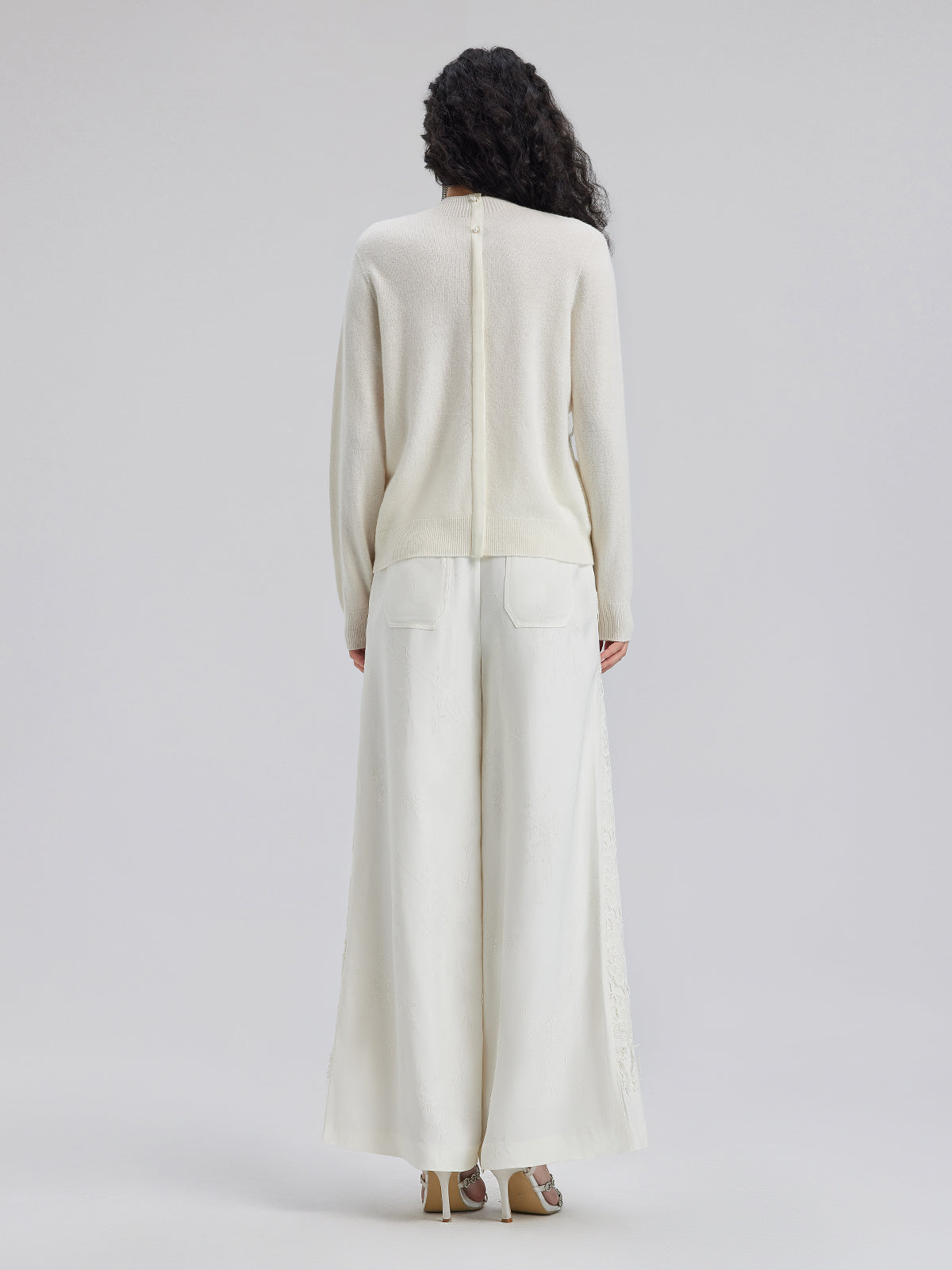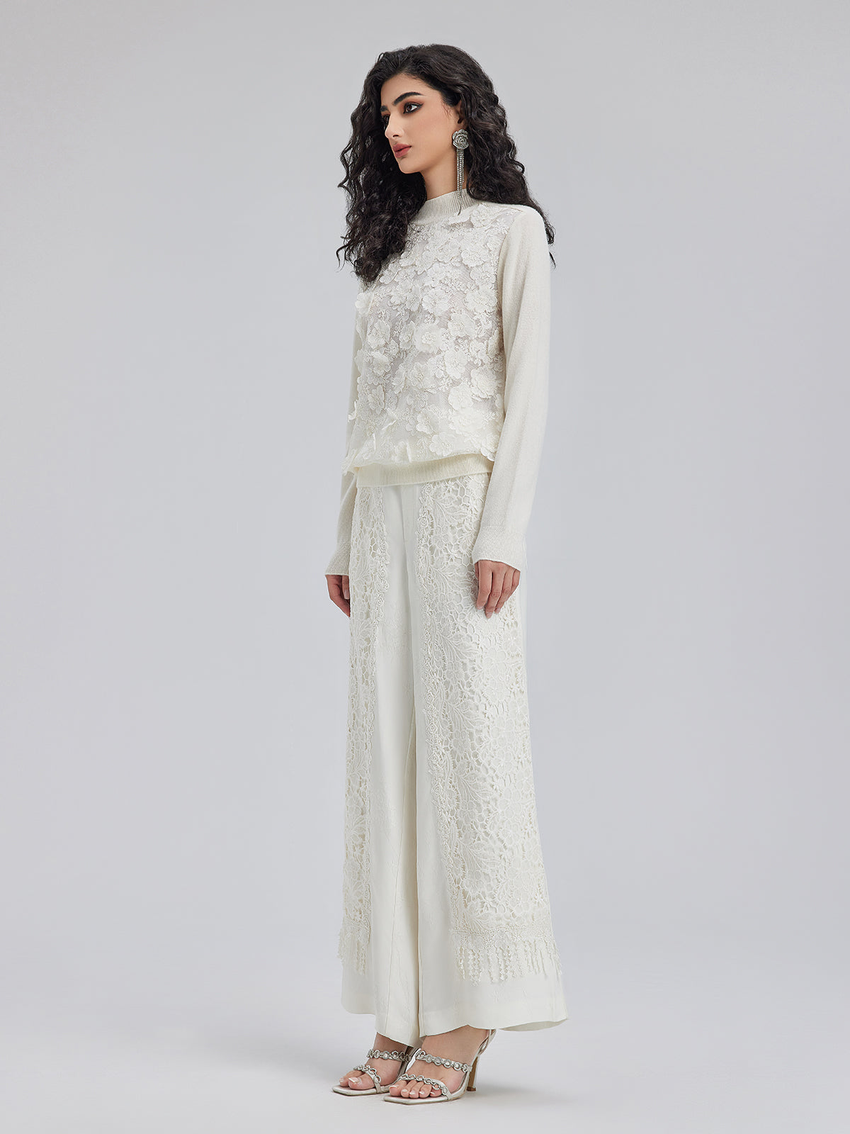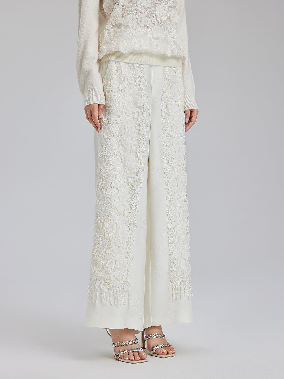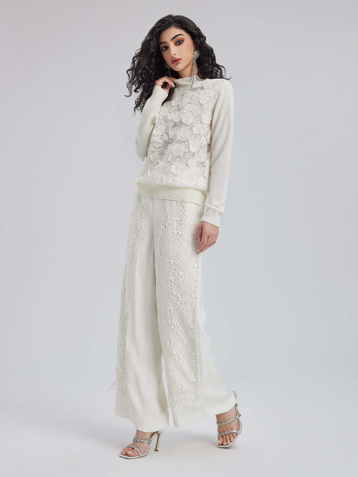 Crafted with high-end textured lace and jacquard satin, it is adorned with sequins for a unique and elegant touch. The double-layer waistband with side zipper ensures comfort and a perfect fit, blending casual and sophisticated style.