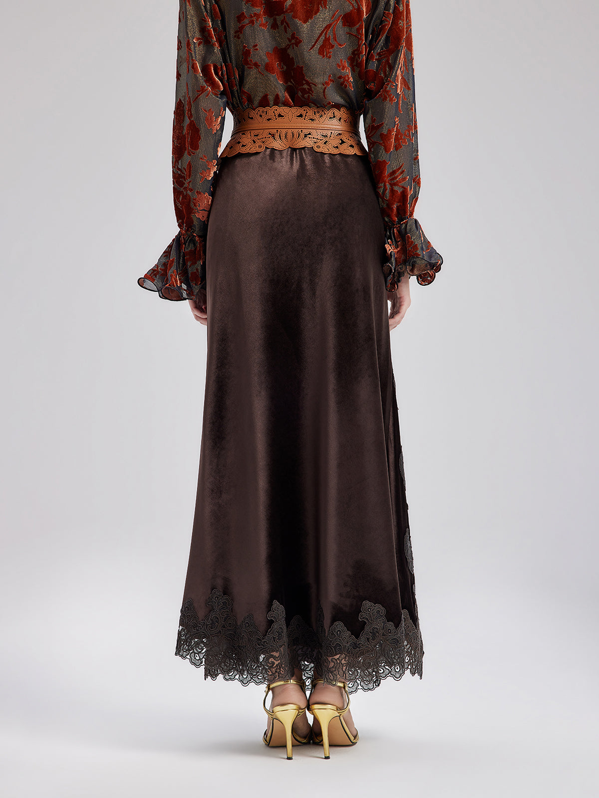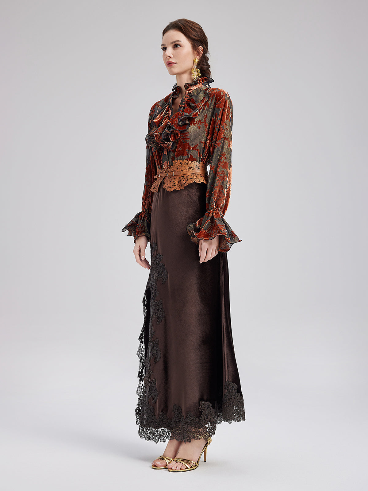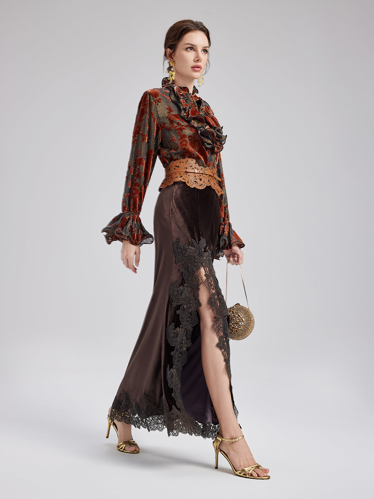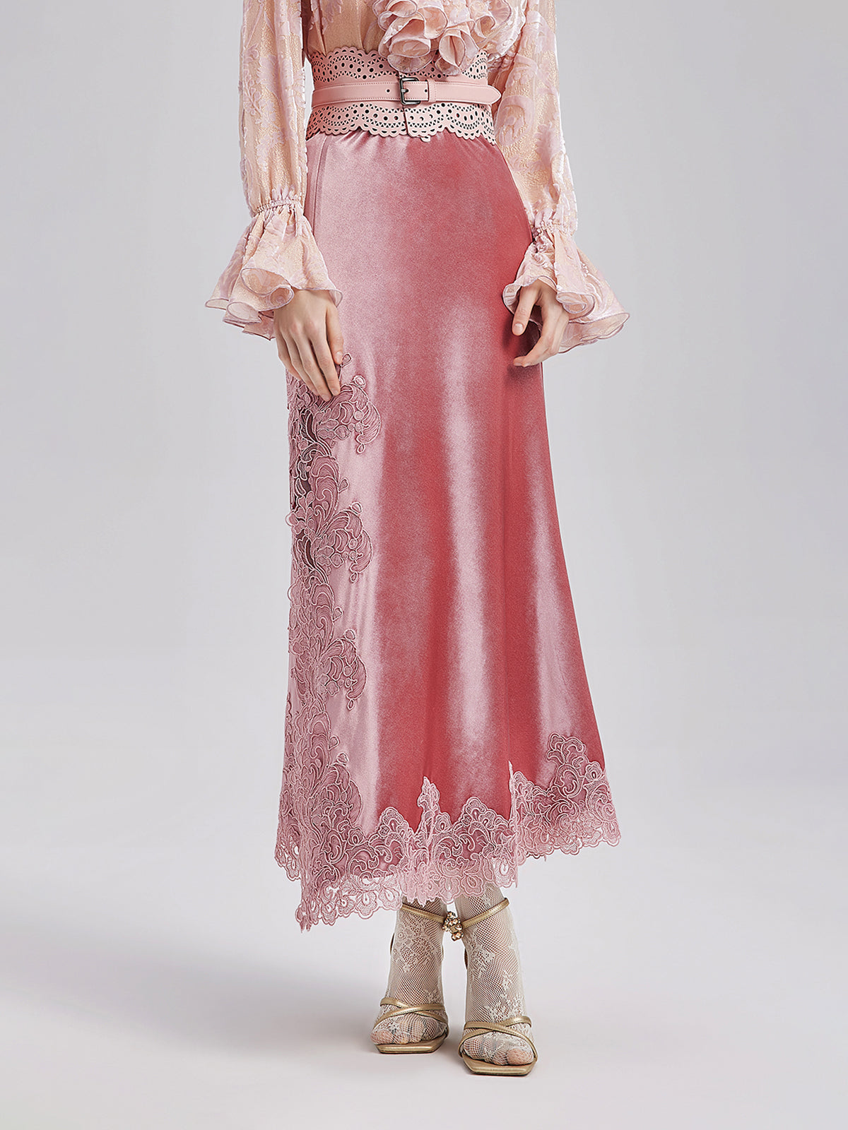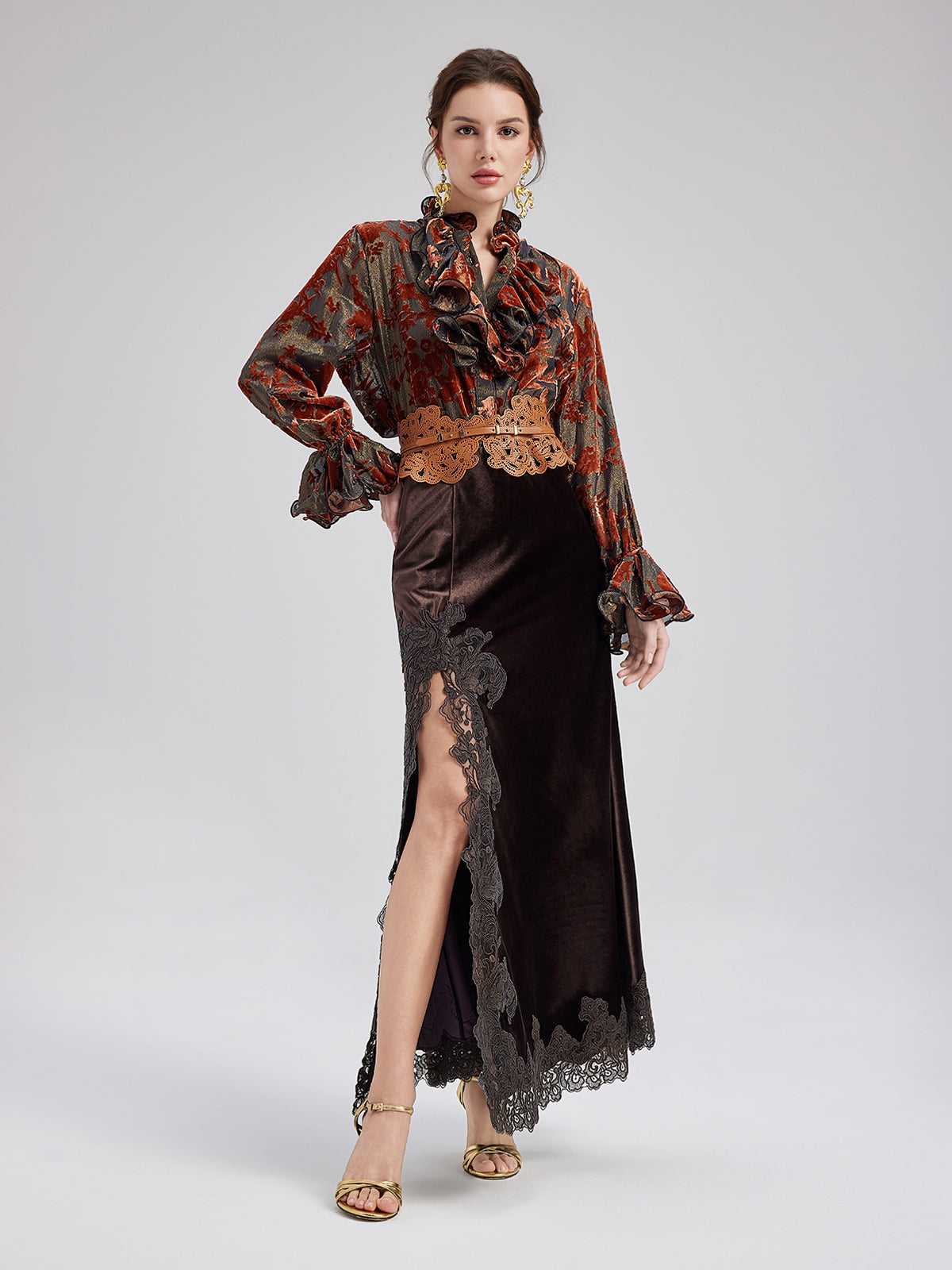 Made from premium velvet, this high-waisted skirt has lace detailing with a subtle side slit. Its draped design flatters the figure, perfect for pairing with heels or flats for an elegant, versatile look.