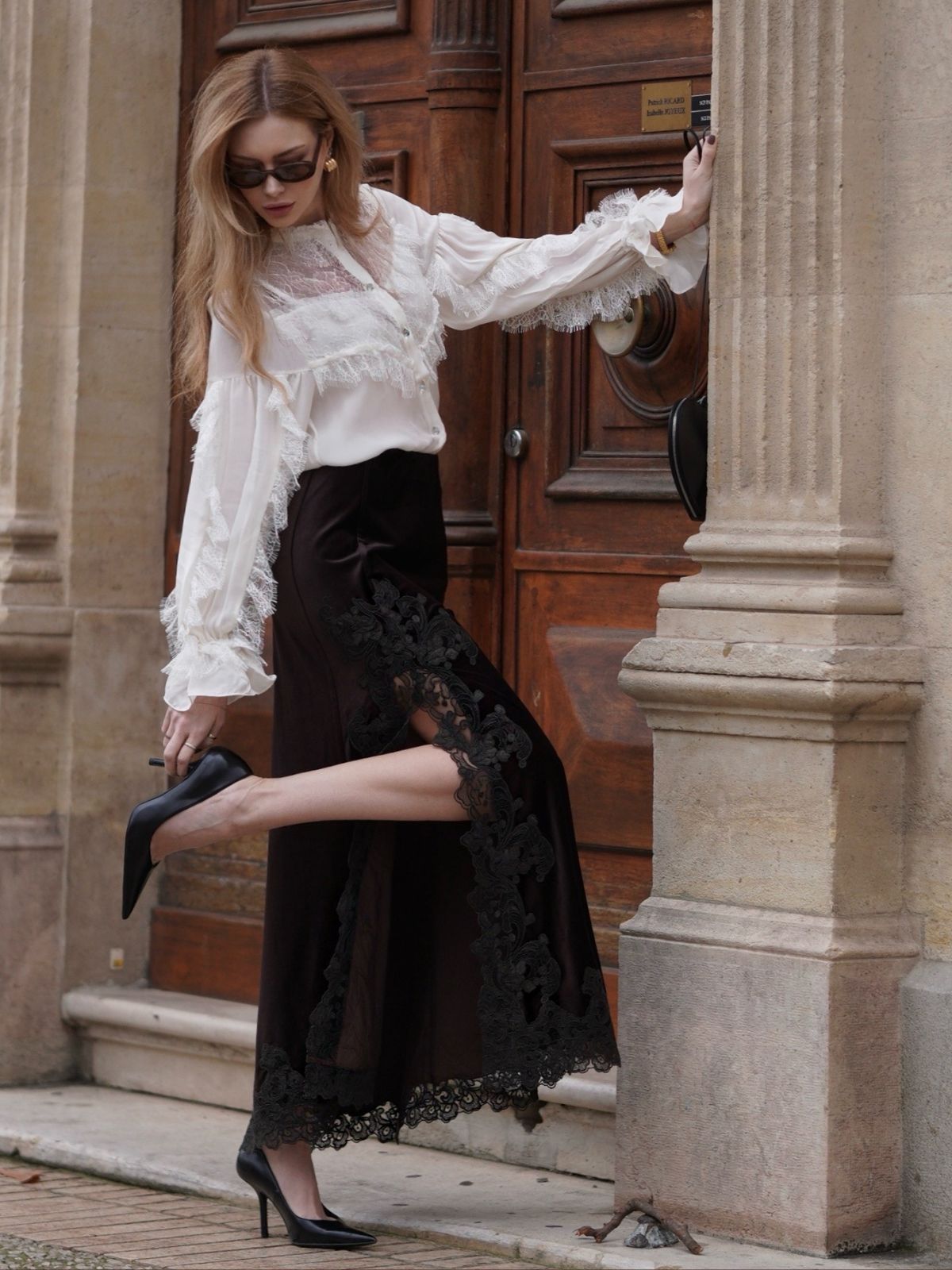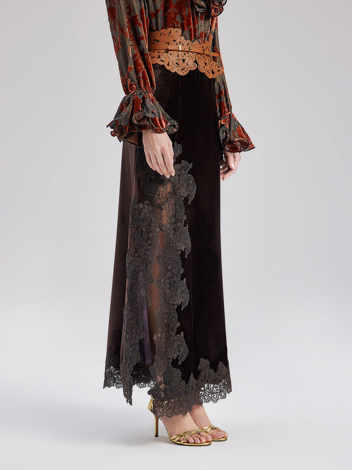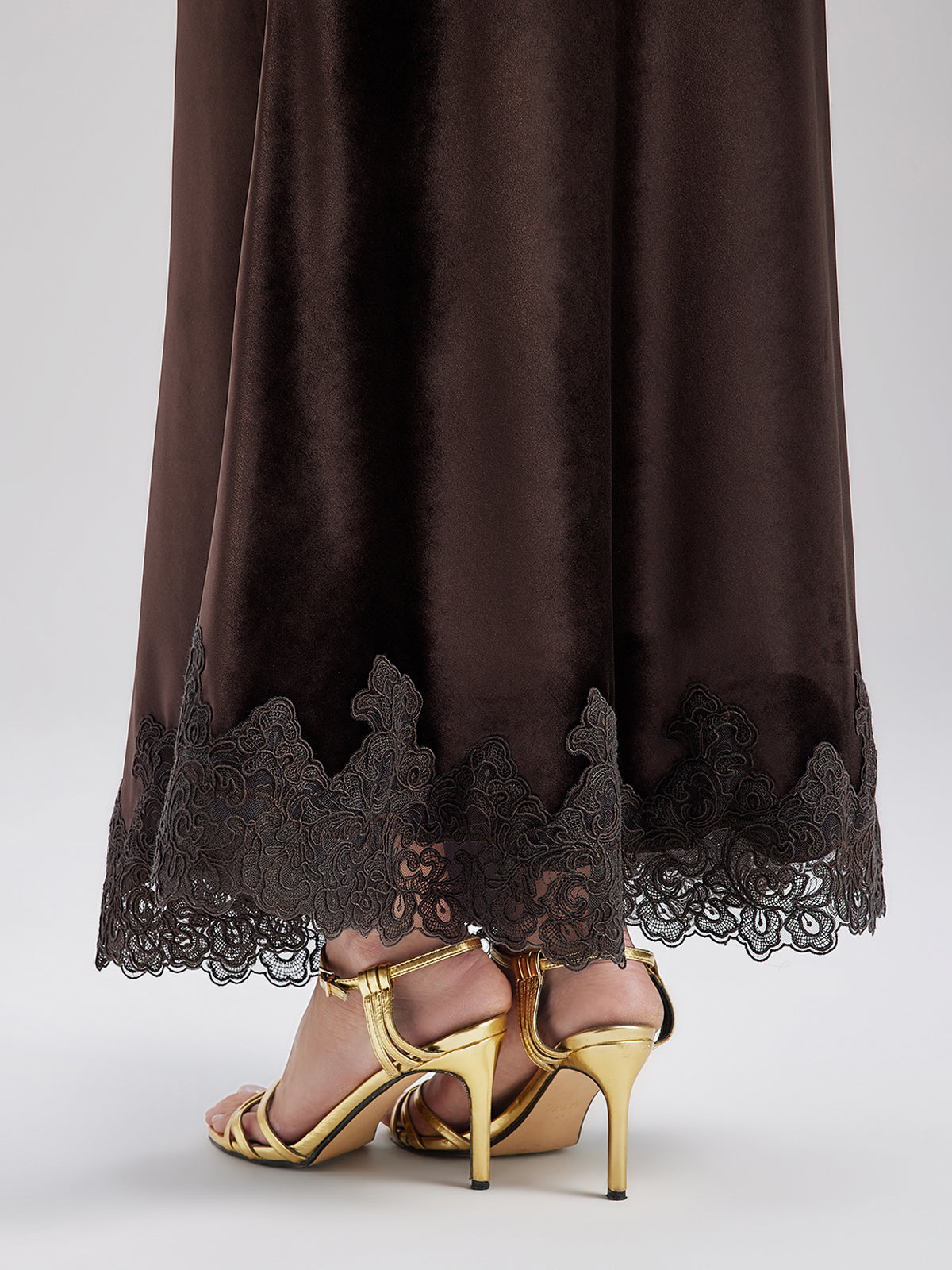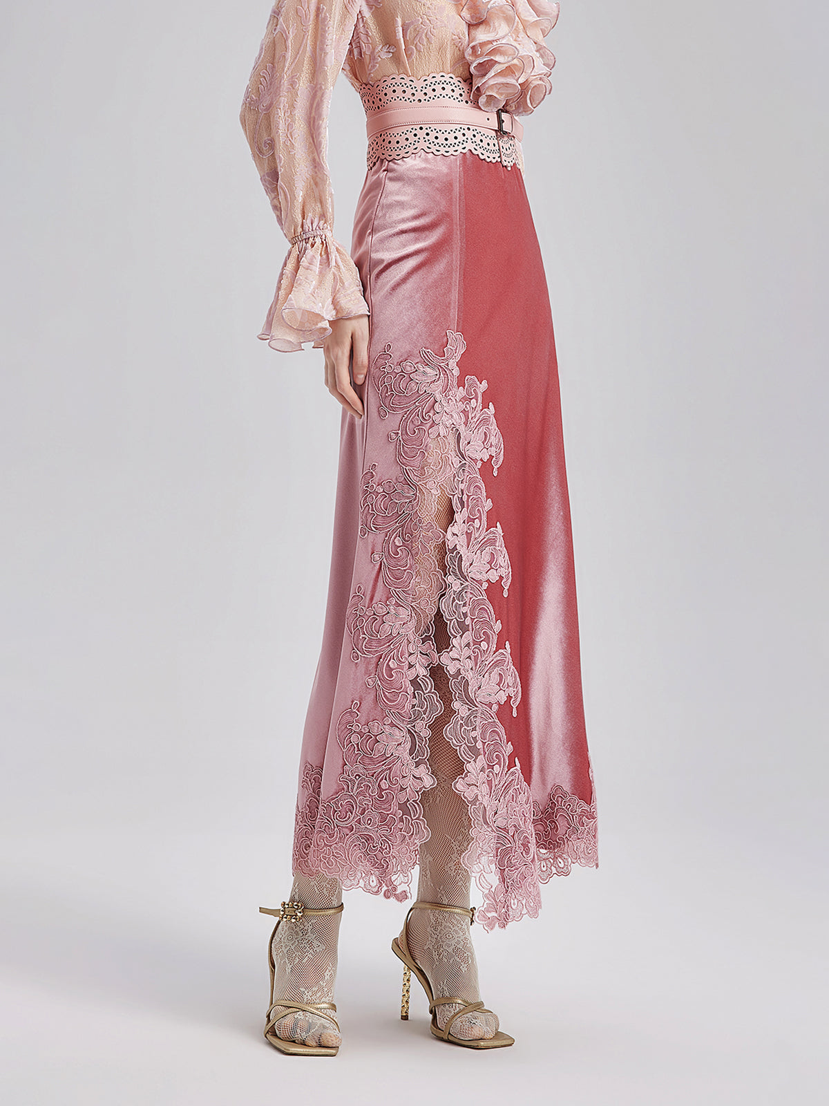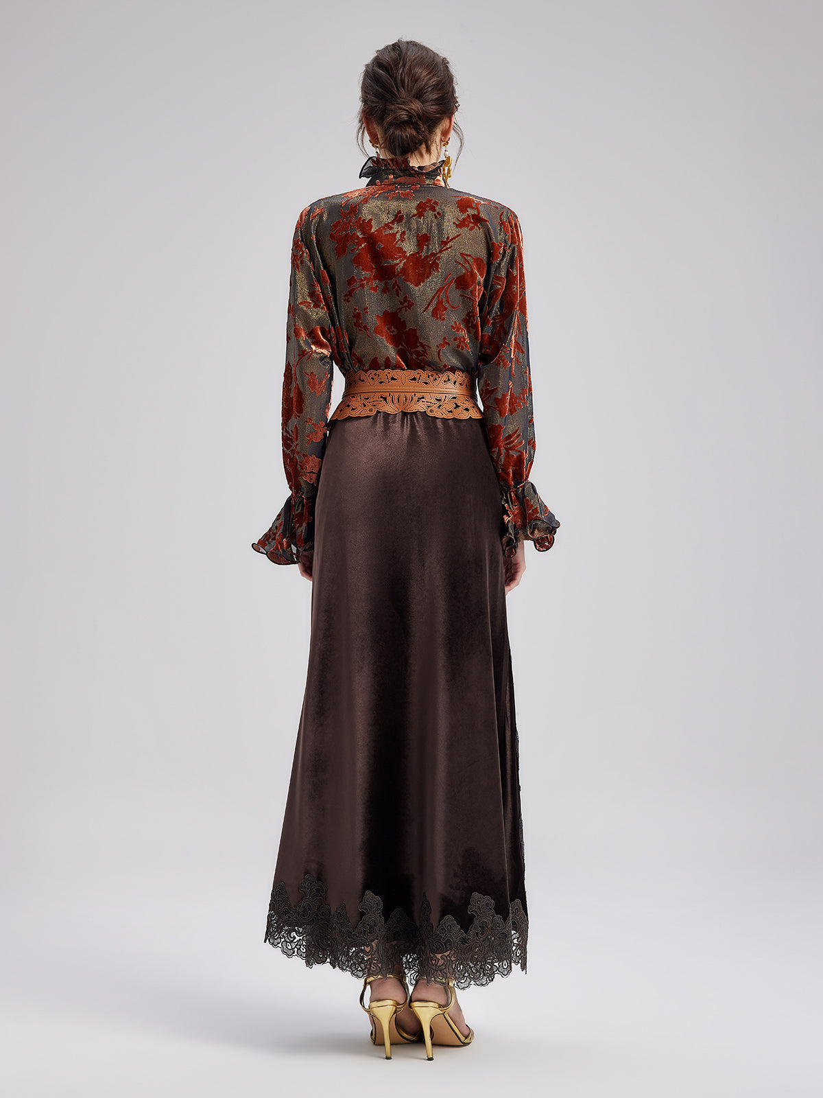 Made from premium velvet, this high-waisted skirt has lace detailing with a subtle side slit. Its draped design flatters the figure, perfect for pairing with heels or flats for an elegant, versatile look.