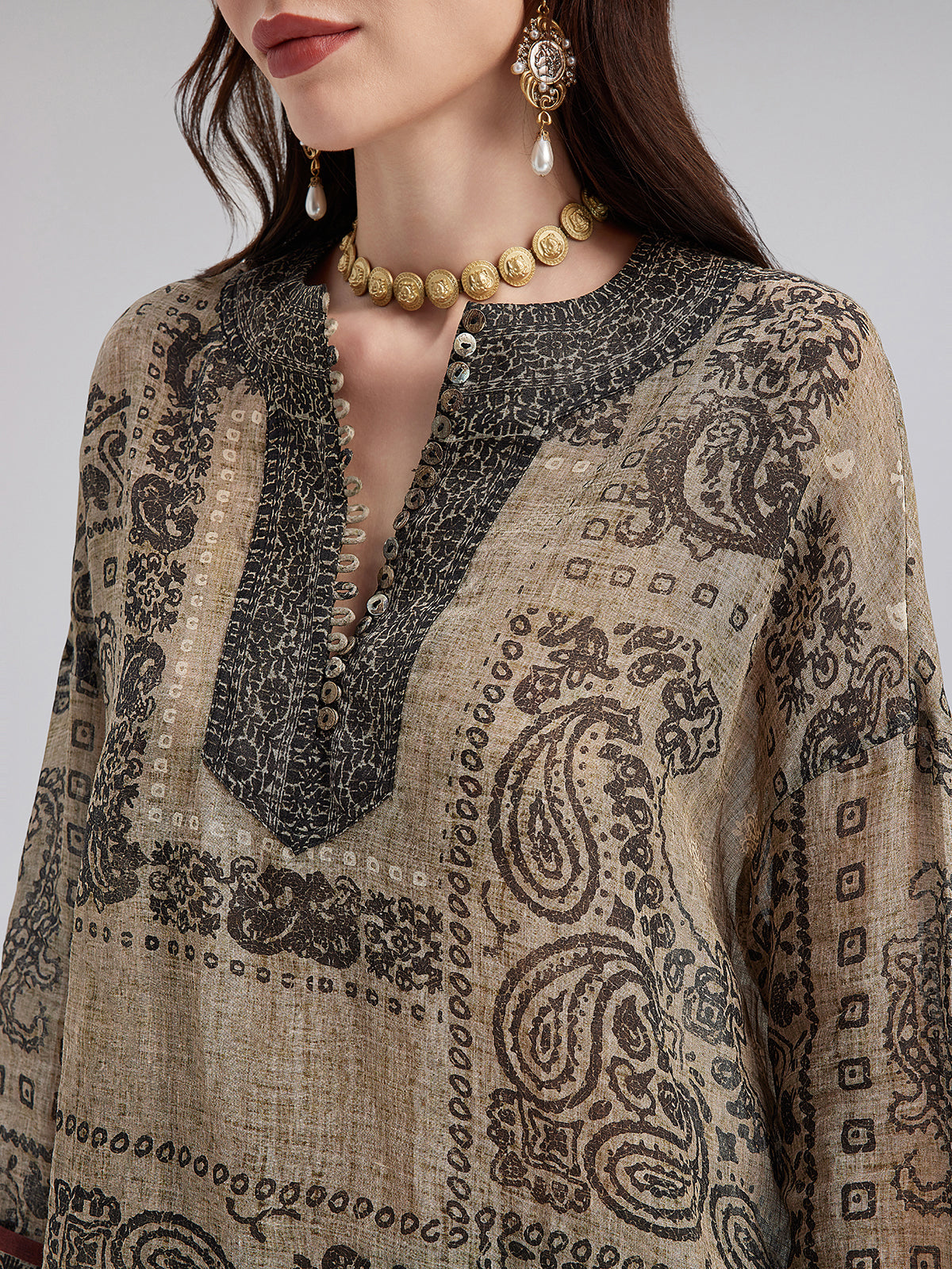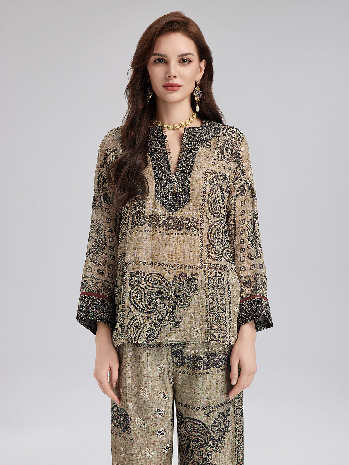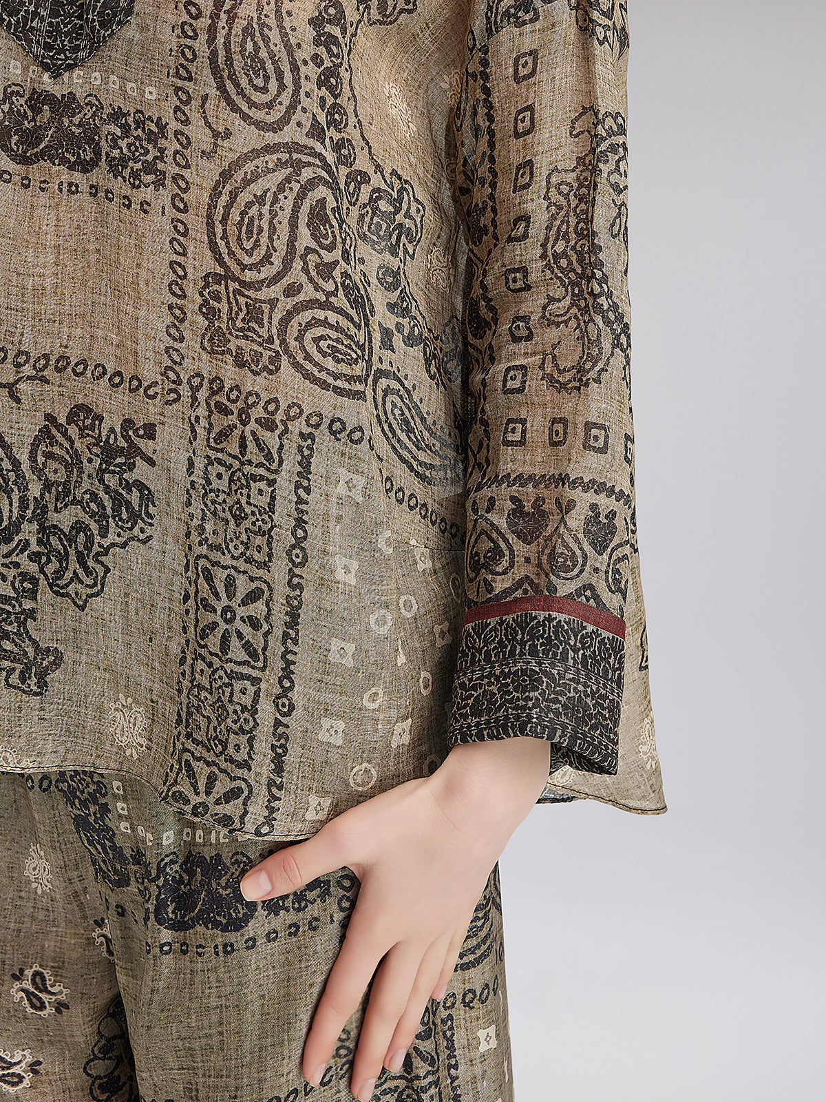 A blend of French ramie fabric and classic paisley print, with shell buttons at the collar for a relaxed, vacation-ready look. Soft and breathable, the loose fit suits all body types. Neckline and button details add layers, while the color-blocked trim at the cuffs provides a finishing touch.