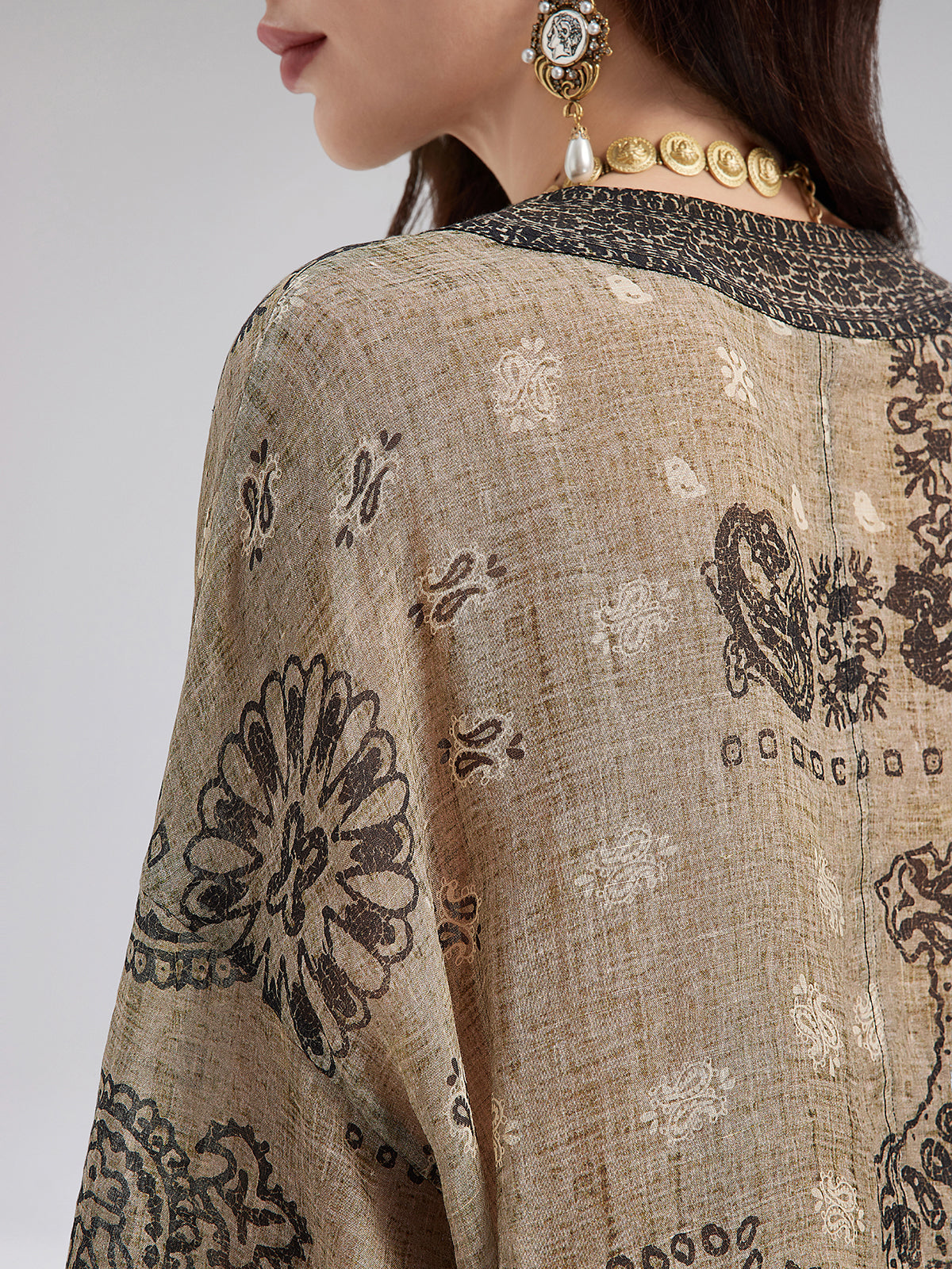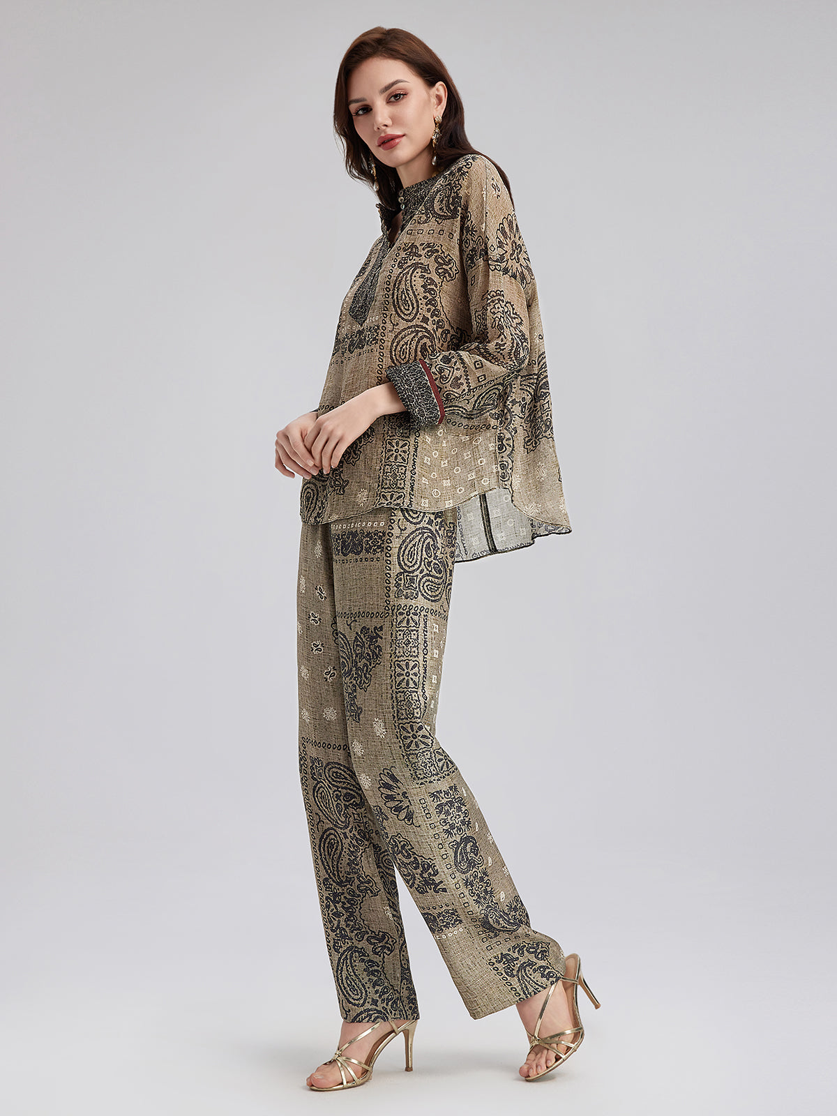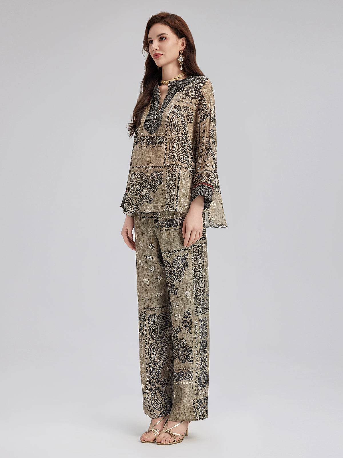 A blend of French ramie fabric and classic paisley print, with shell buttons at the collar for a relaxed, vacation-ready look. Soft and breathable, the loose fit suits all body types. Neckline and button details add layers, while the color-blocked trim at the cuffs provides a finishing touch.