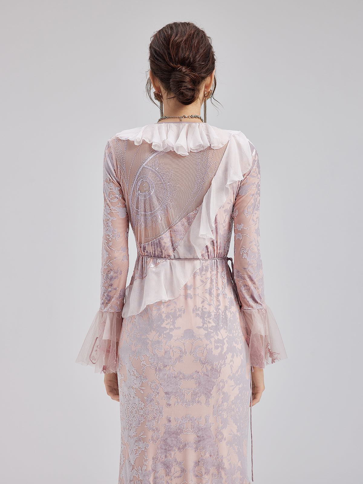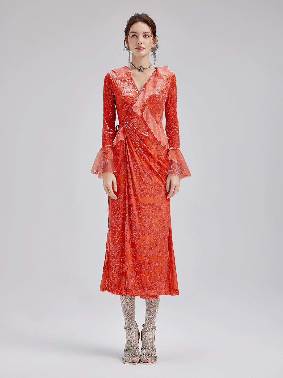 This silk velvet dress features intricate floral flocking and delicate lace trim. The V-neck and ruffled hem create a romantic, elegant silhouette, perfect for spring and summer luxury events. Soft, breathable, and ideal for sophisticated occasions.
