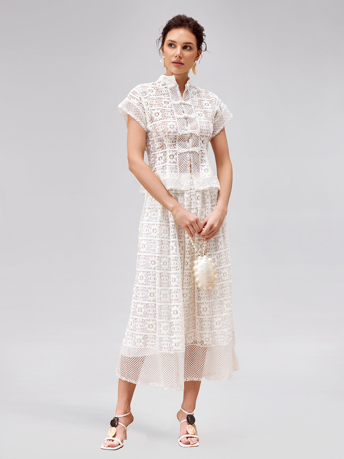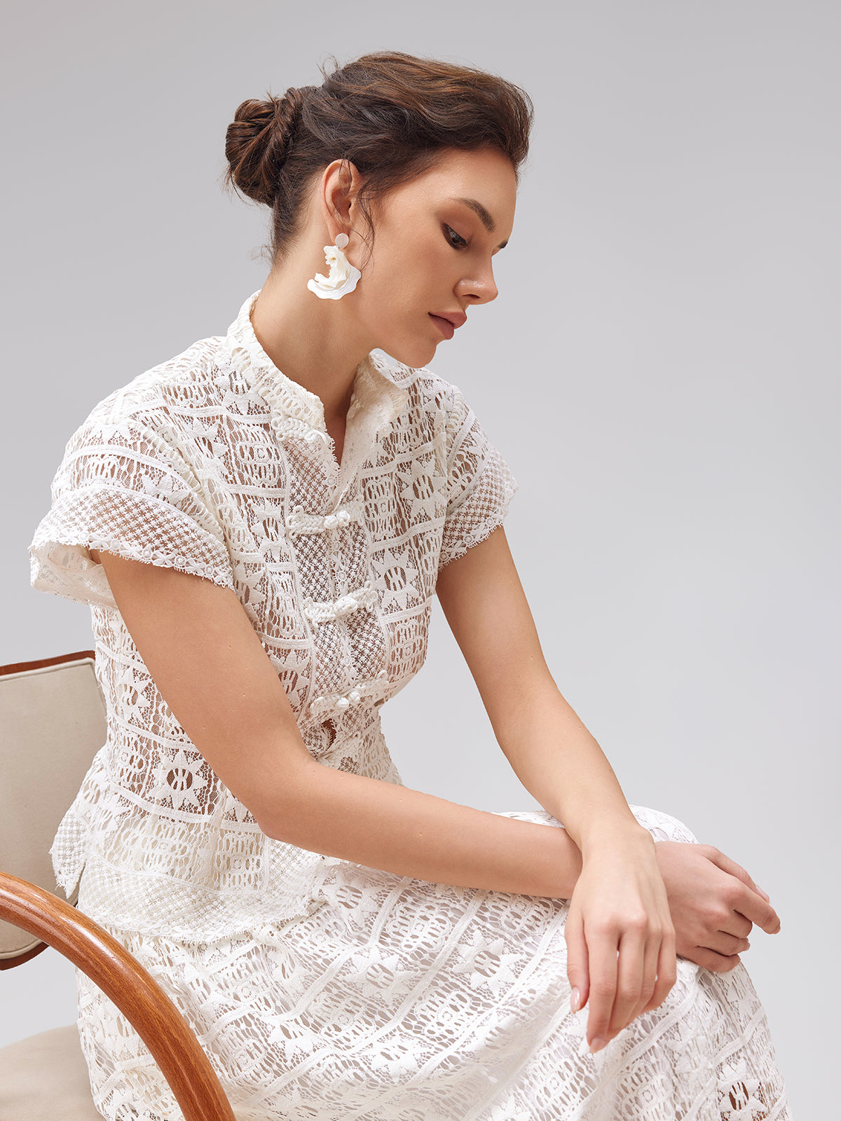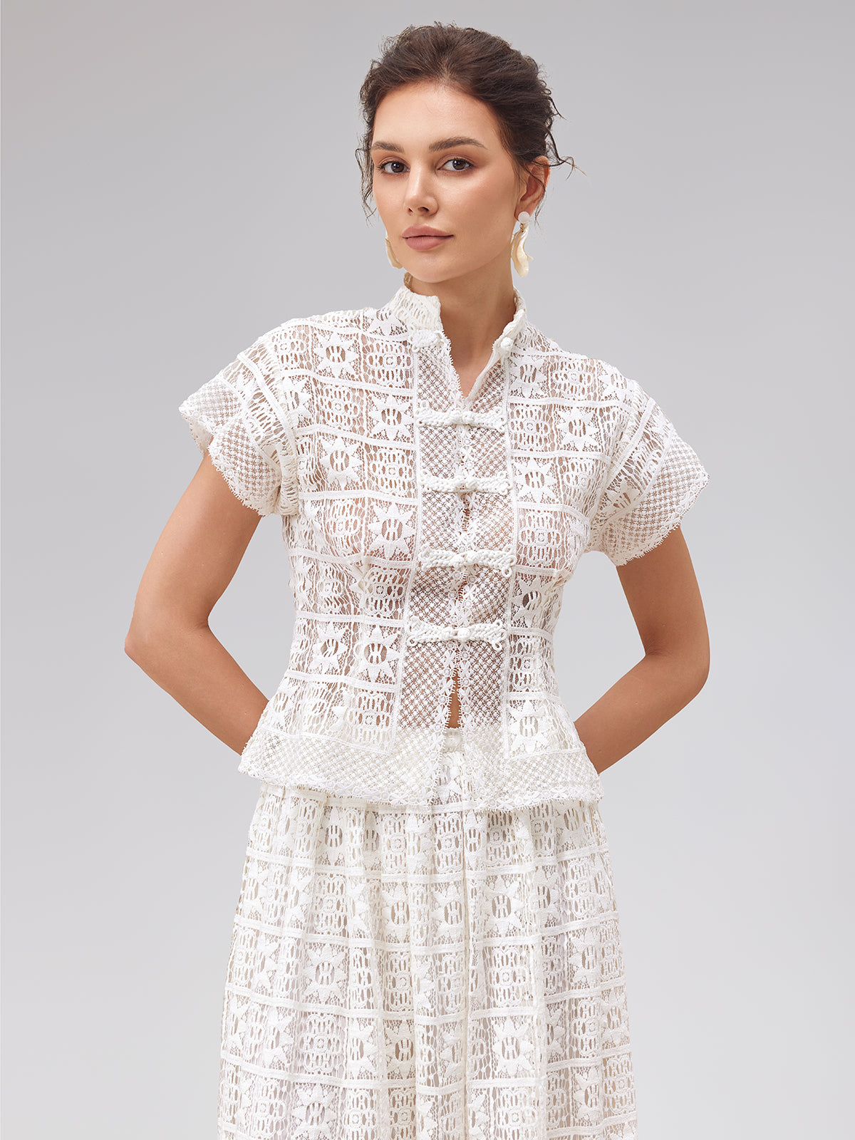 Exquisite lace fabric exudes luxury and softness. The gentle and minimalistic silhouette, featuring a small mandarin collar and straight shoulders, exudes an elegant temperament. The addition of a Delicate Buttoned adds a stylish touch, reflecting refined taste. Perfect for showcasing an elegant French-inspired style in everyday casual or social occasions.