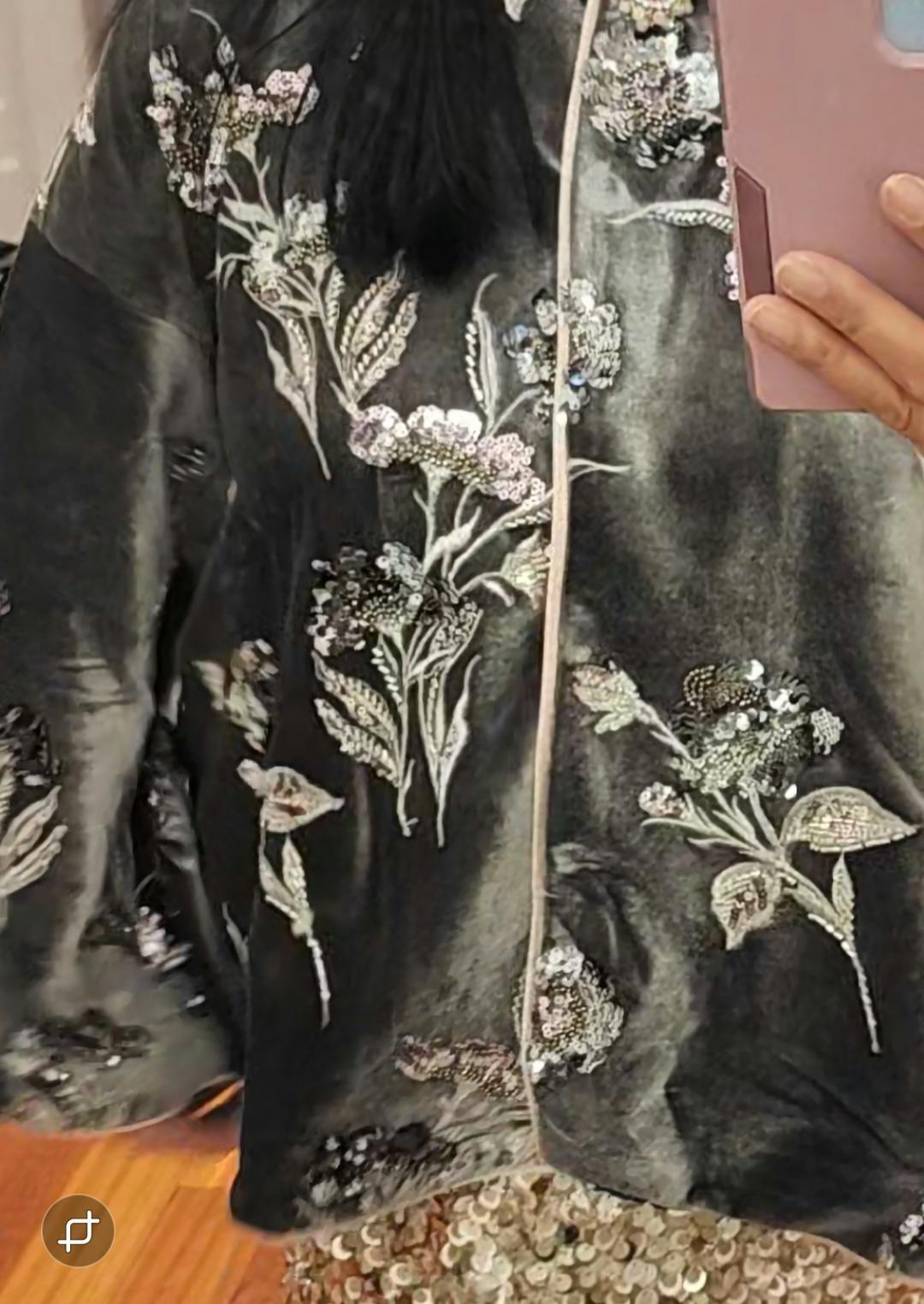 Crafted from luxurious velvet, this coat combines a soft touch with an elegant sheen. Featuring hand-beaded floral embroidery, it exudes sophisticated charm. The soft hue and retro mandarin collar add refined grace, while the flared sleeves and loose silhouette offer a modern, elegant fit for various occasions.