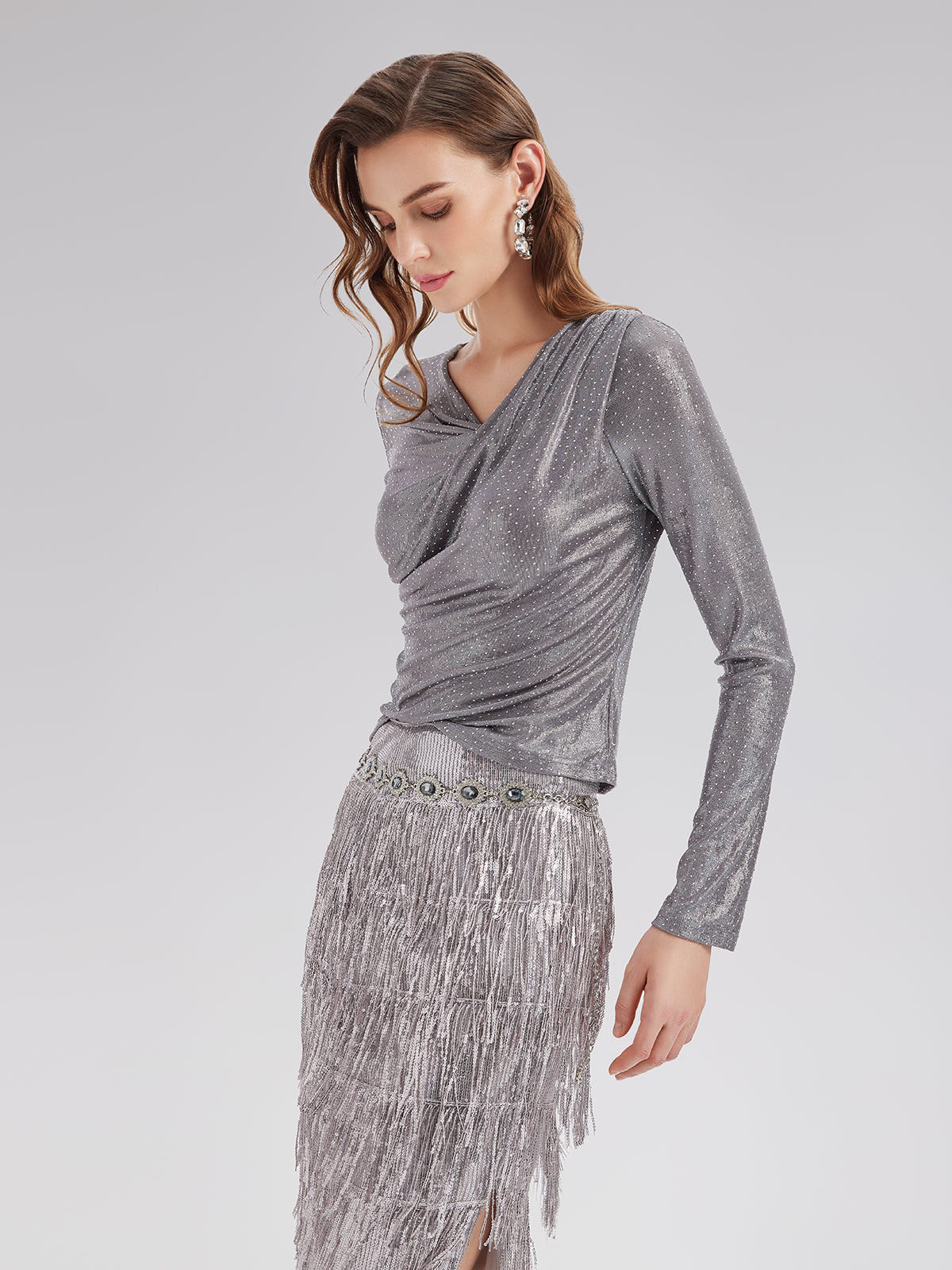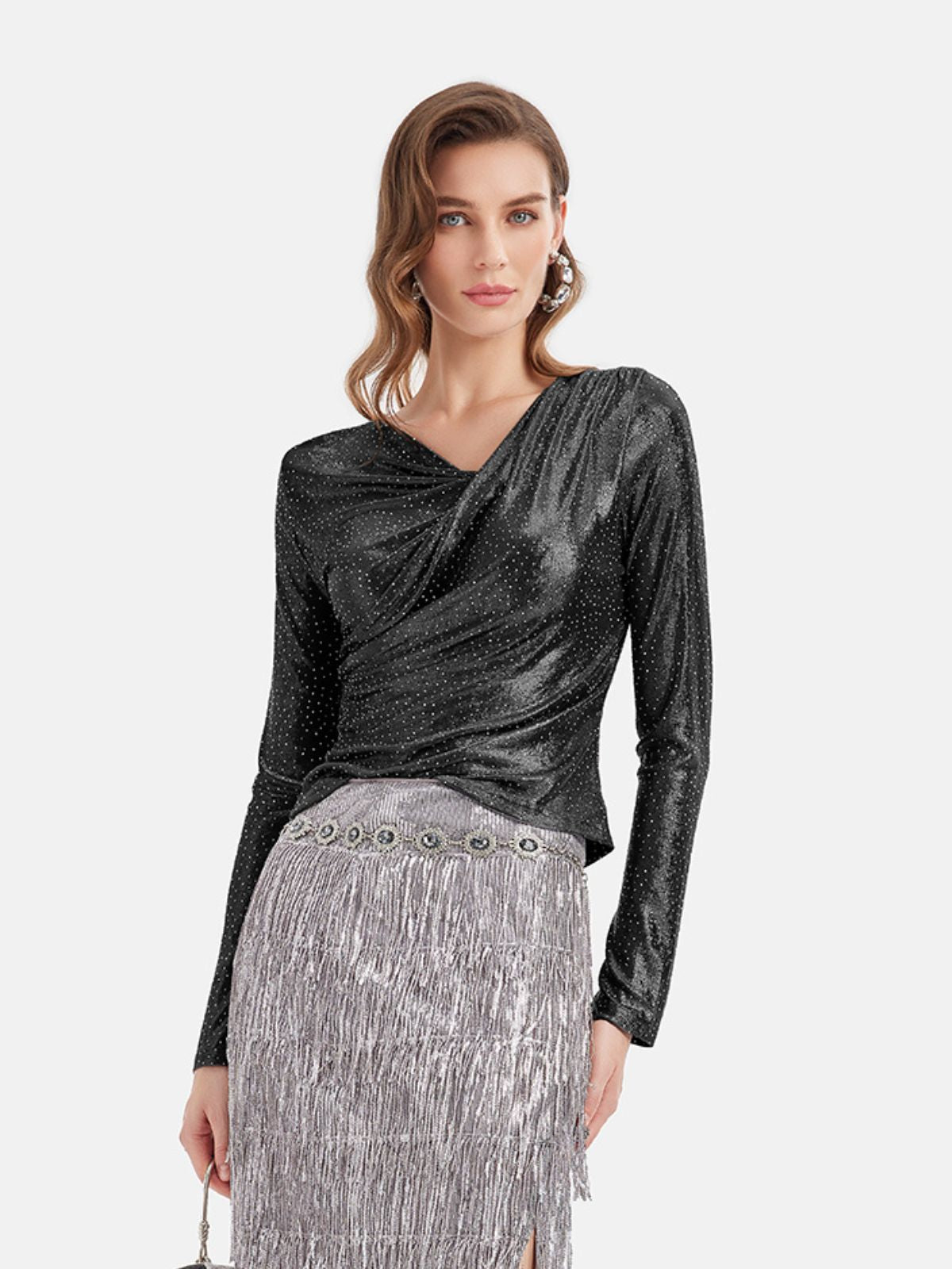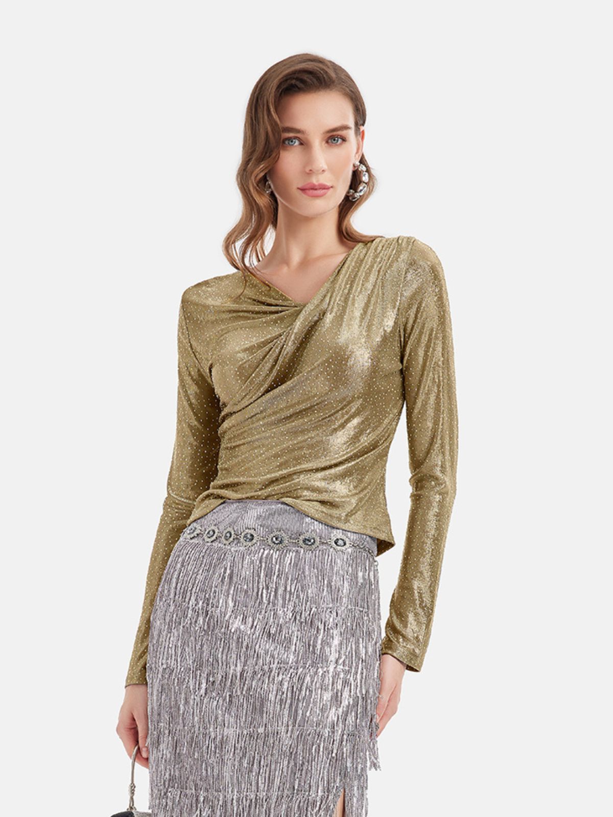 This top features metallic fabric with pleated wrap design, enhancing curves and adding elegance. Its shimmering texture makes it perfect for evening events. Slim fit with soft draping ensures comfort.