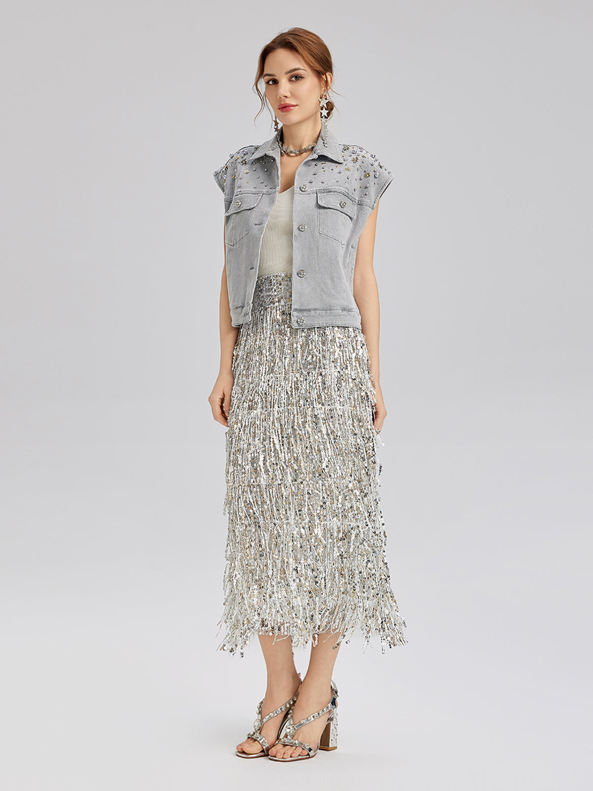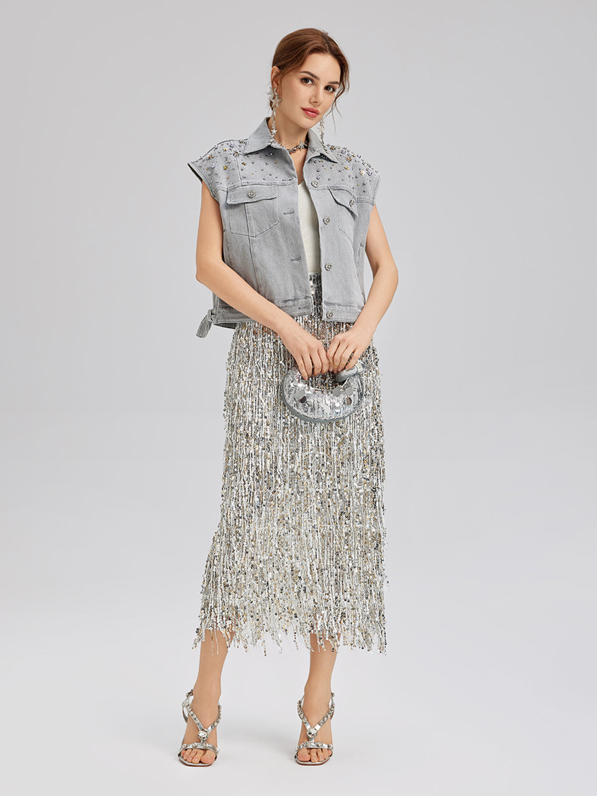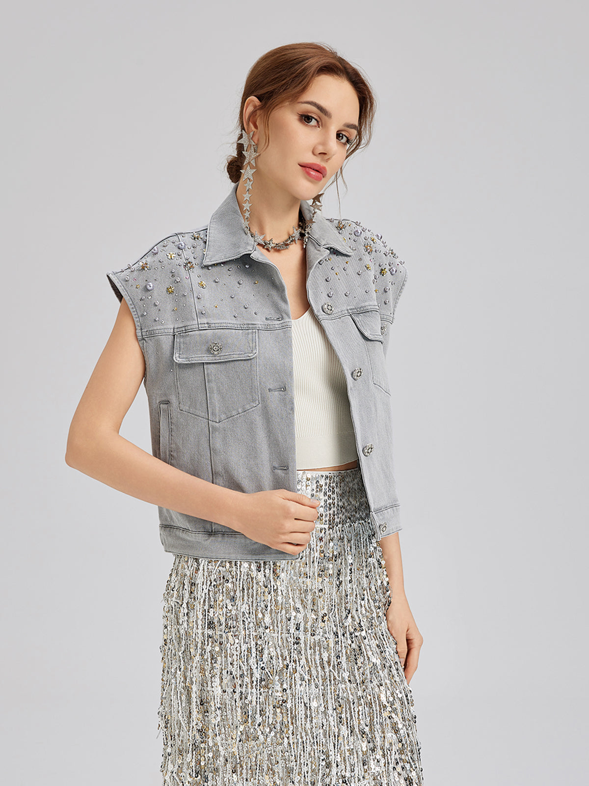 Breaking from stiff denim norms, this washed fabric is softened for a gentle, breathable touch that moves with you—never restrictive or hot. The faded gray tone shows vintage worn texture, subtly enhanced by delicate beading. Its cropped, loose cut pairs perfectly with high-waisted bottoms to elongate your silhouette.