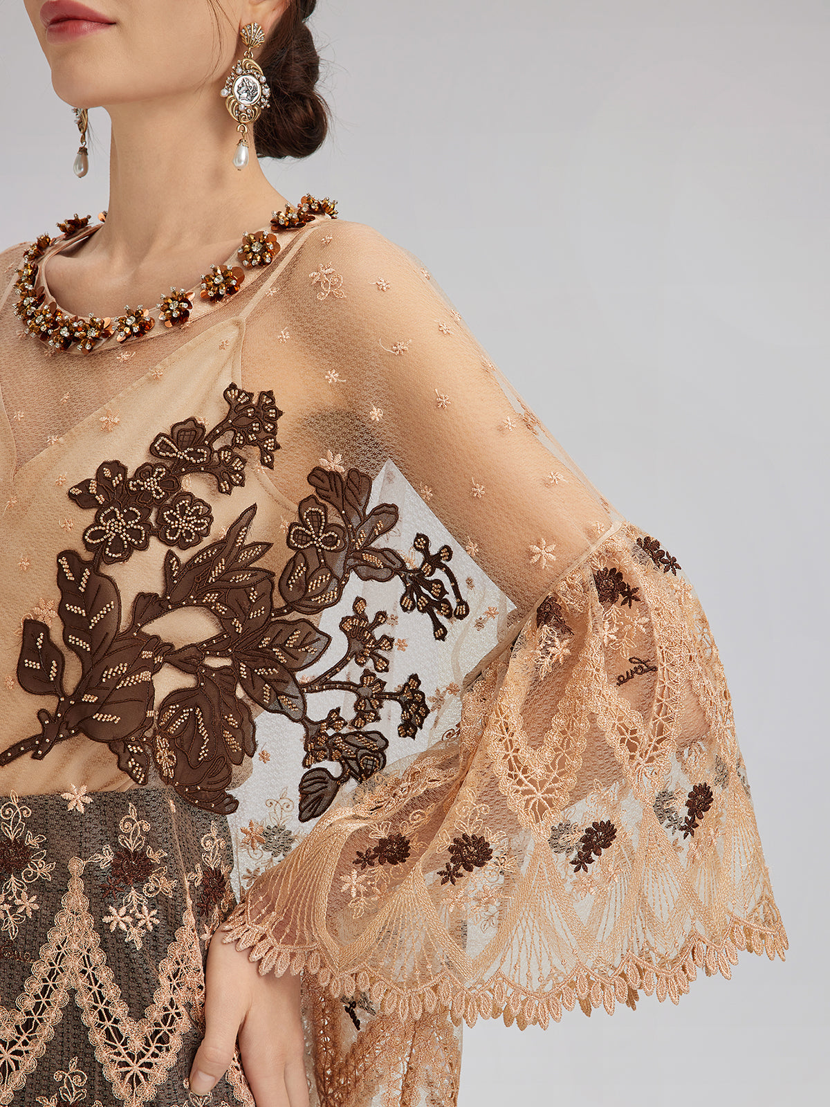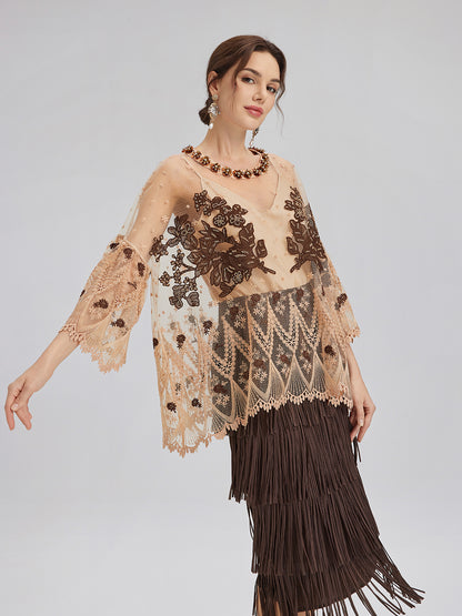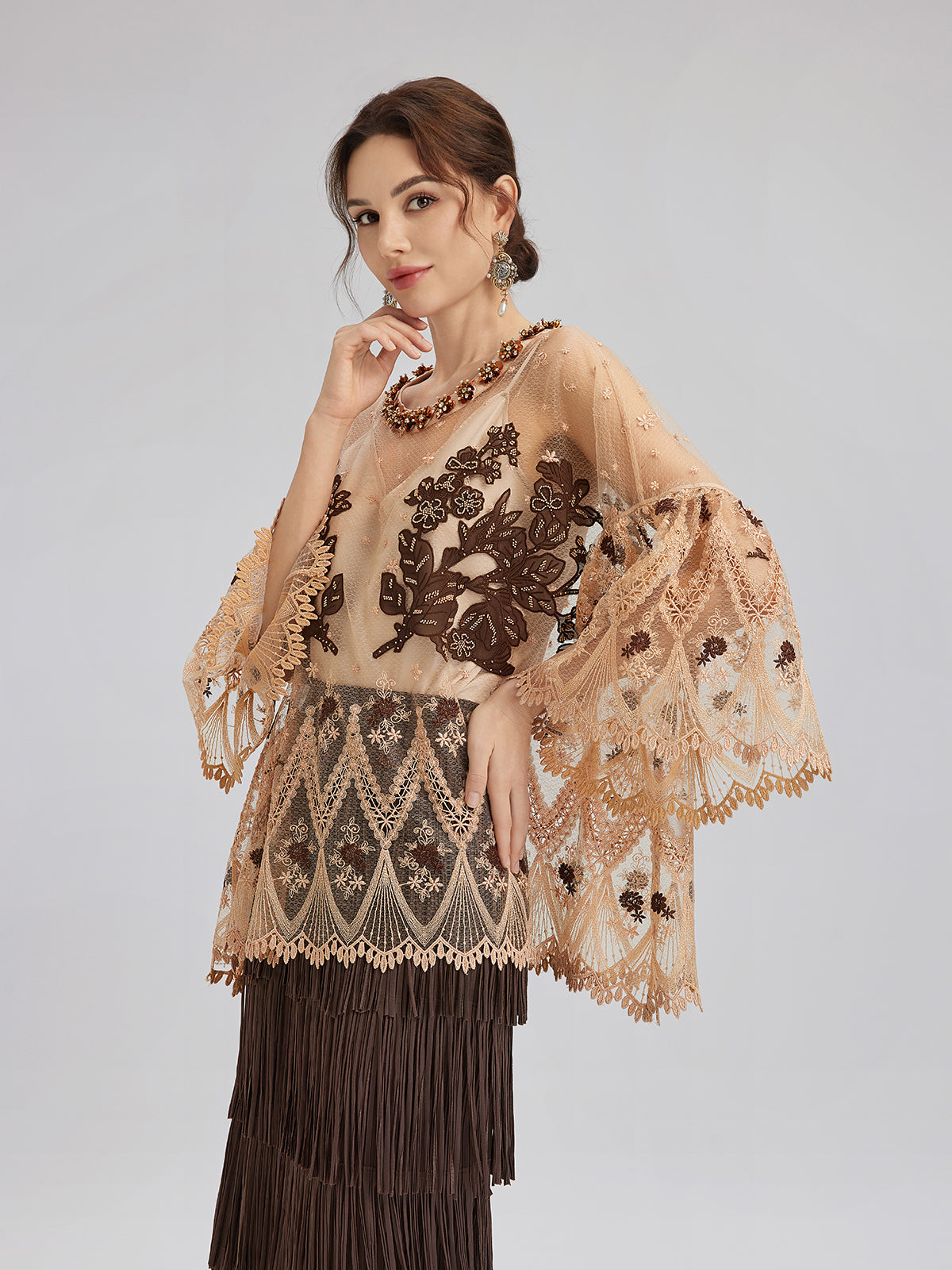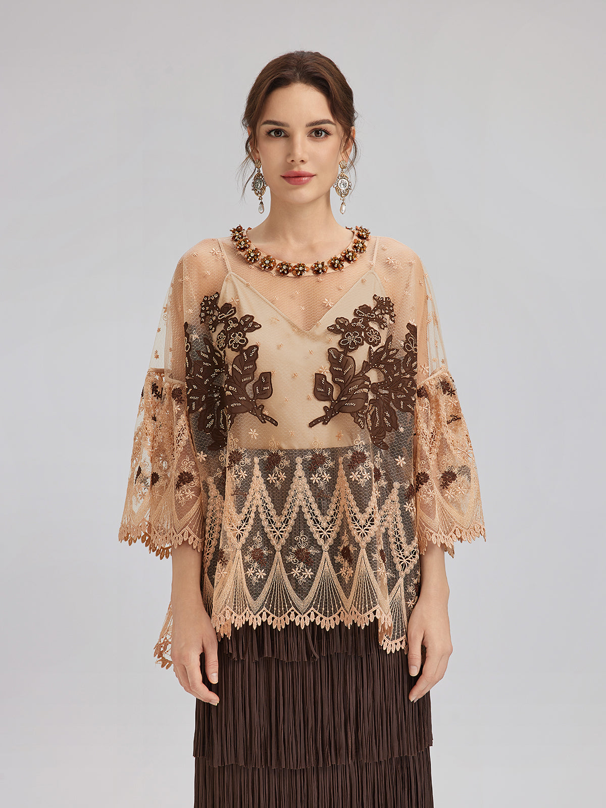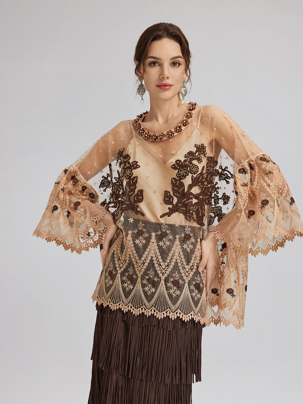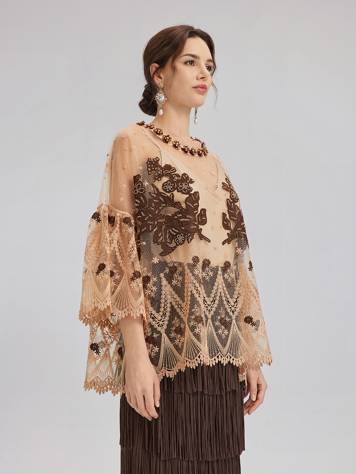 Crafted from soft, breathable embroidered lace with a relaxed silhouette. Lace trim are precisely placed at the hem and cuffs for added elegance. Two floral appliqués at the chest combine embroidery, beading, and rhinestones, creating vivid contrast against the lace base. A touch of sparkle at the neckline comes from 3D sequin clusters. Finished with a back keyhole button for easy wear.