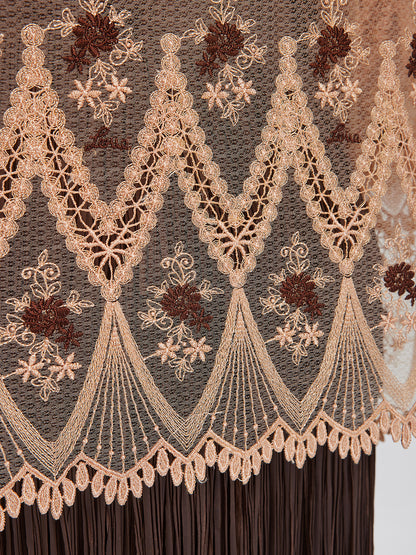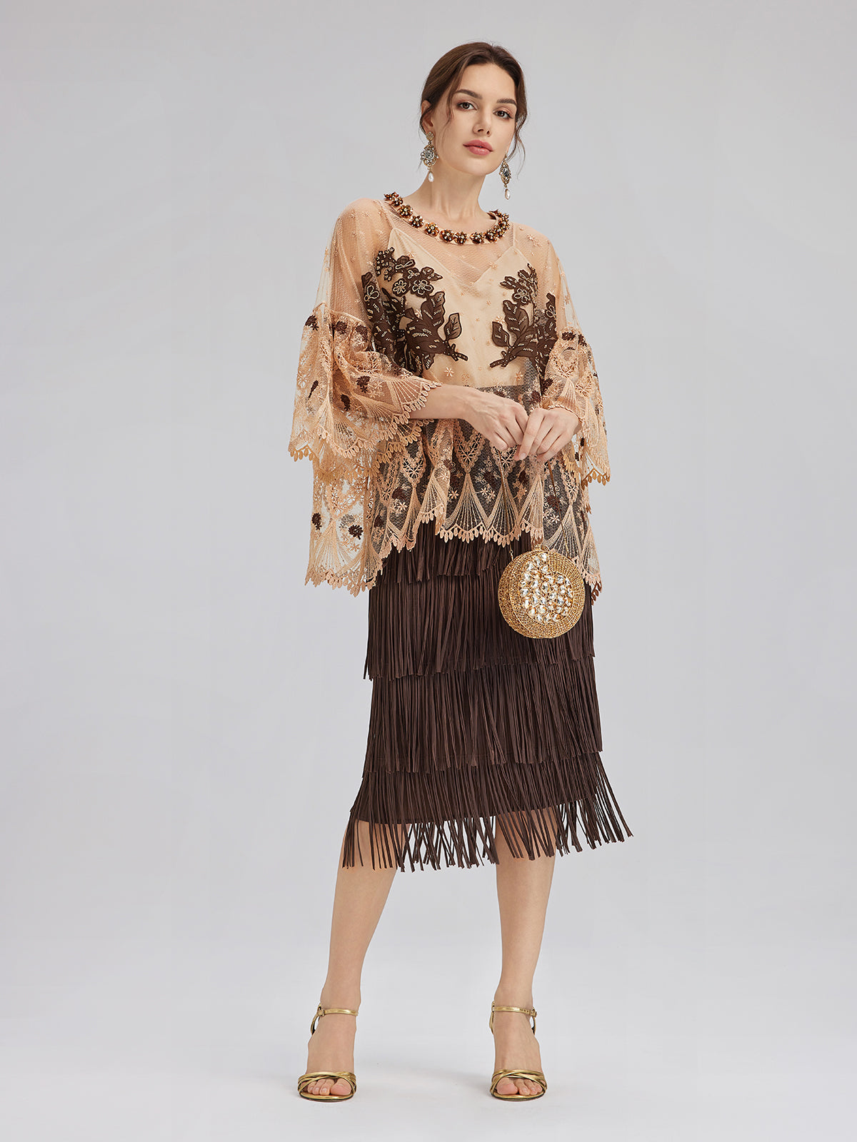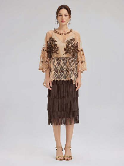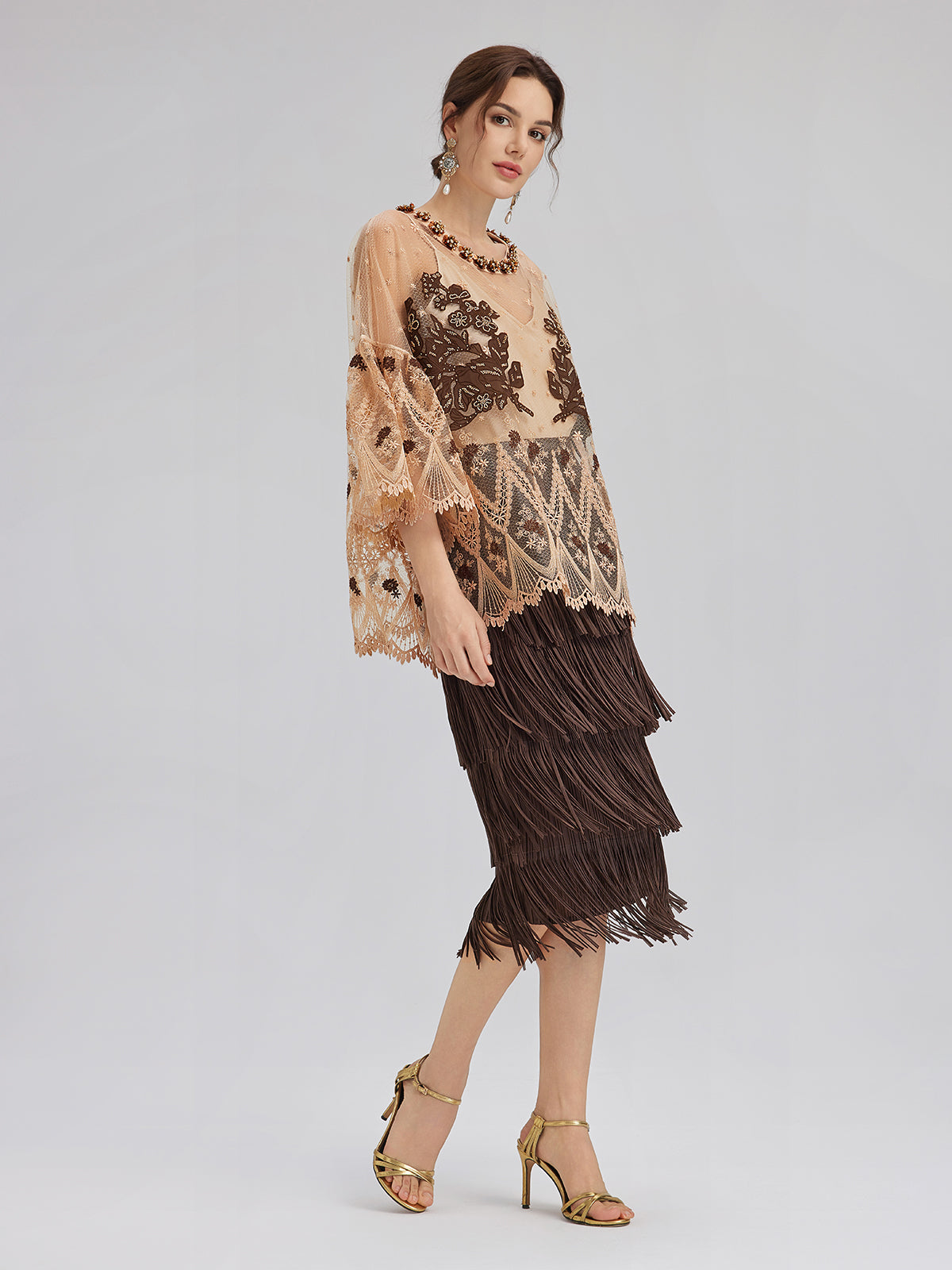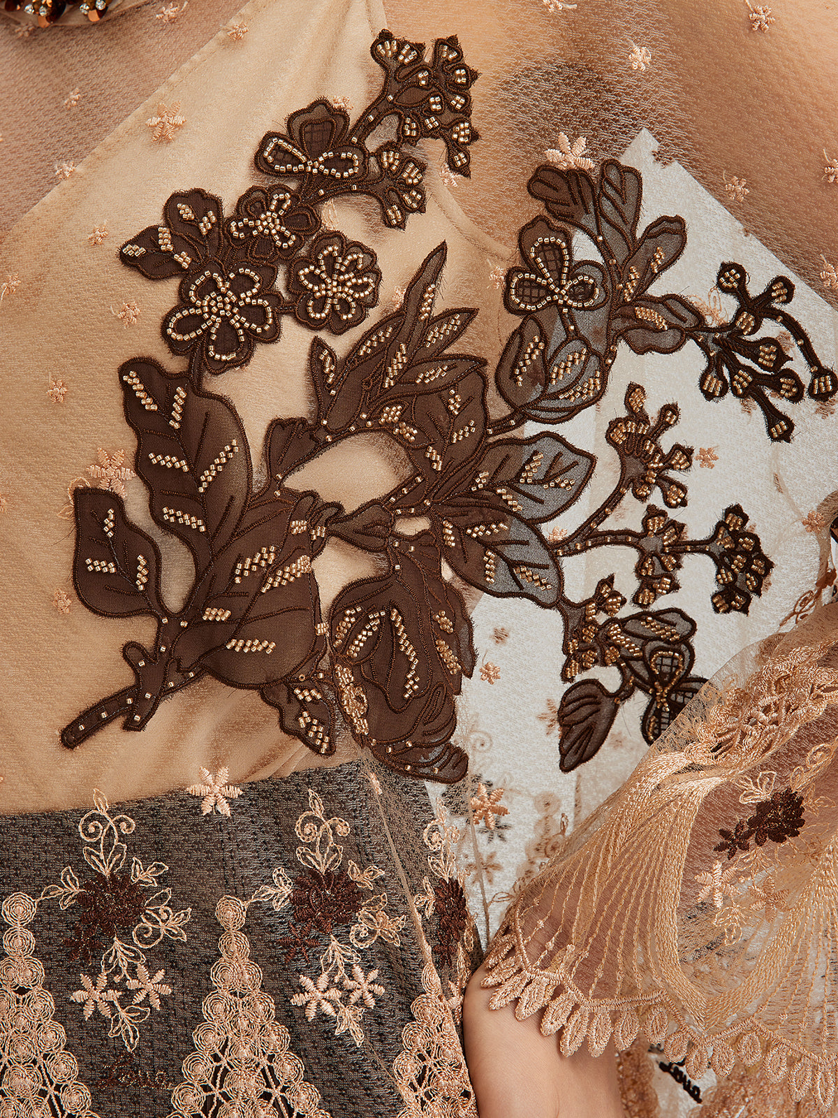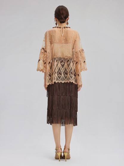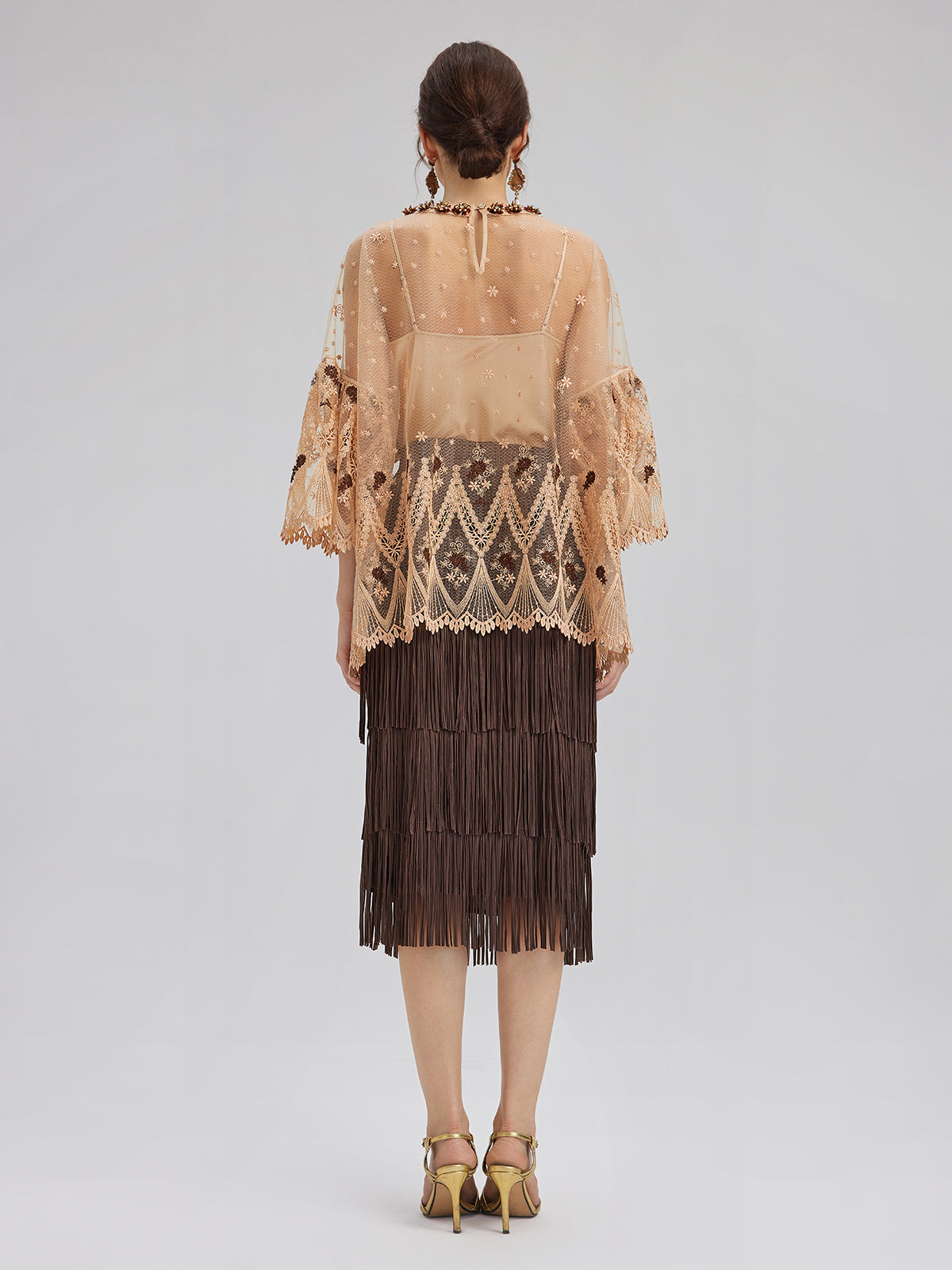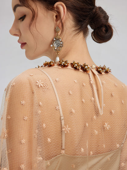 Crafted from soft, breathable embroidered lace with a relaxed silhouette. Lace trim are precisely placed at the hem and cuffs for added elegance. Two floral appliqués at the chest combine embroidery, beading, and rhinestones, creating vivid contrast against the lace base. A touch of sparkle at the neckline comes from 3D sequin clusters. Finished with a back keyhole button for easy wear.