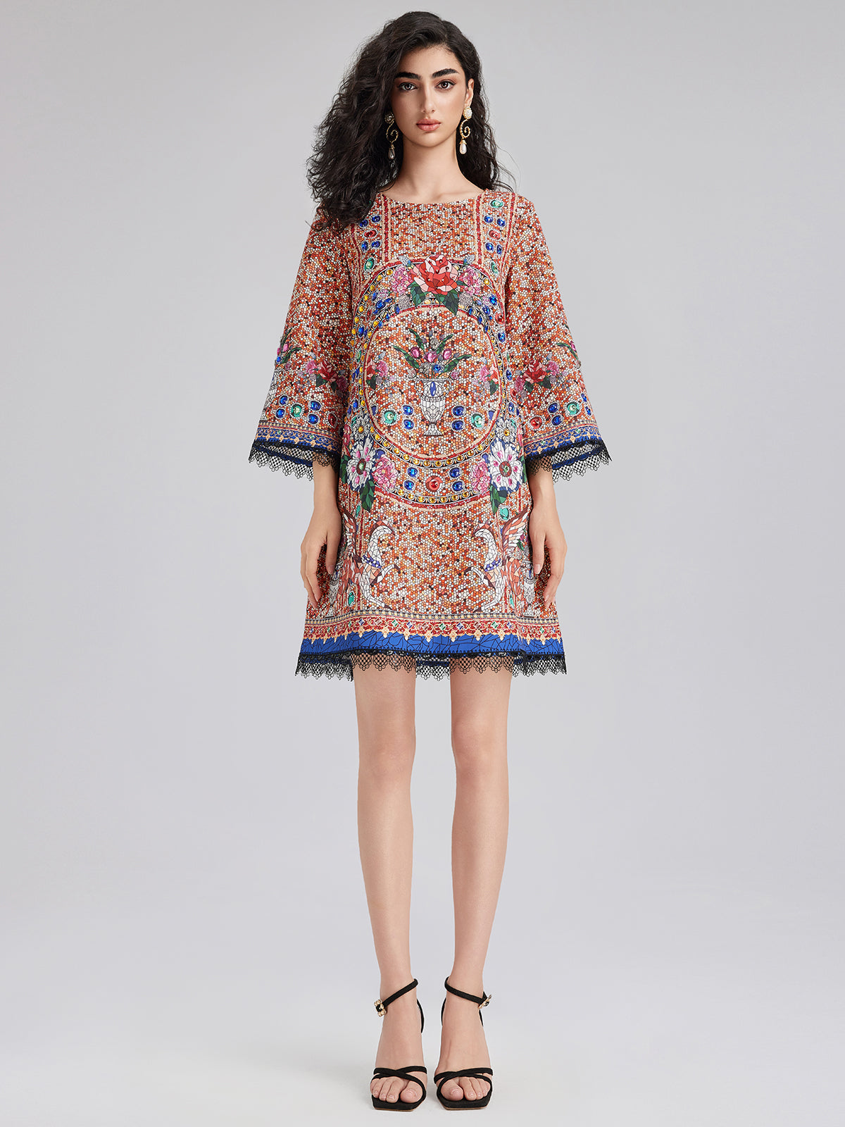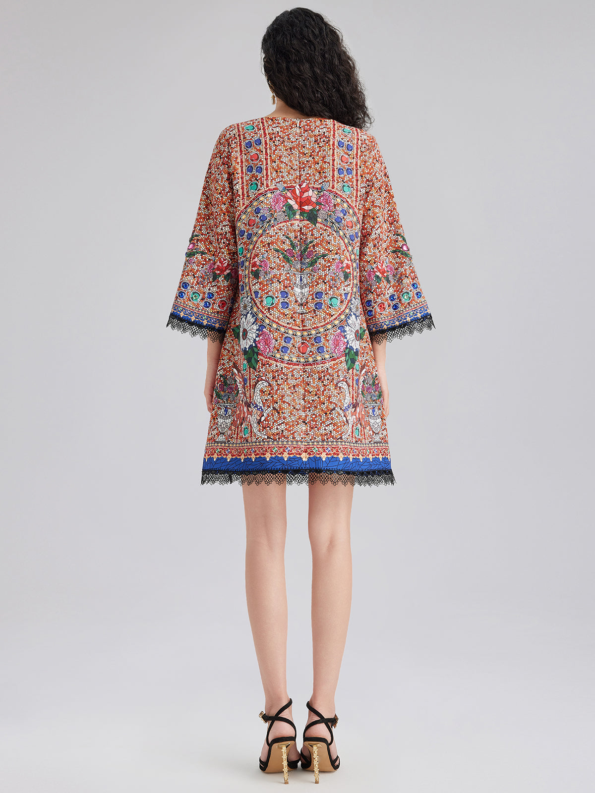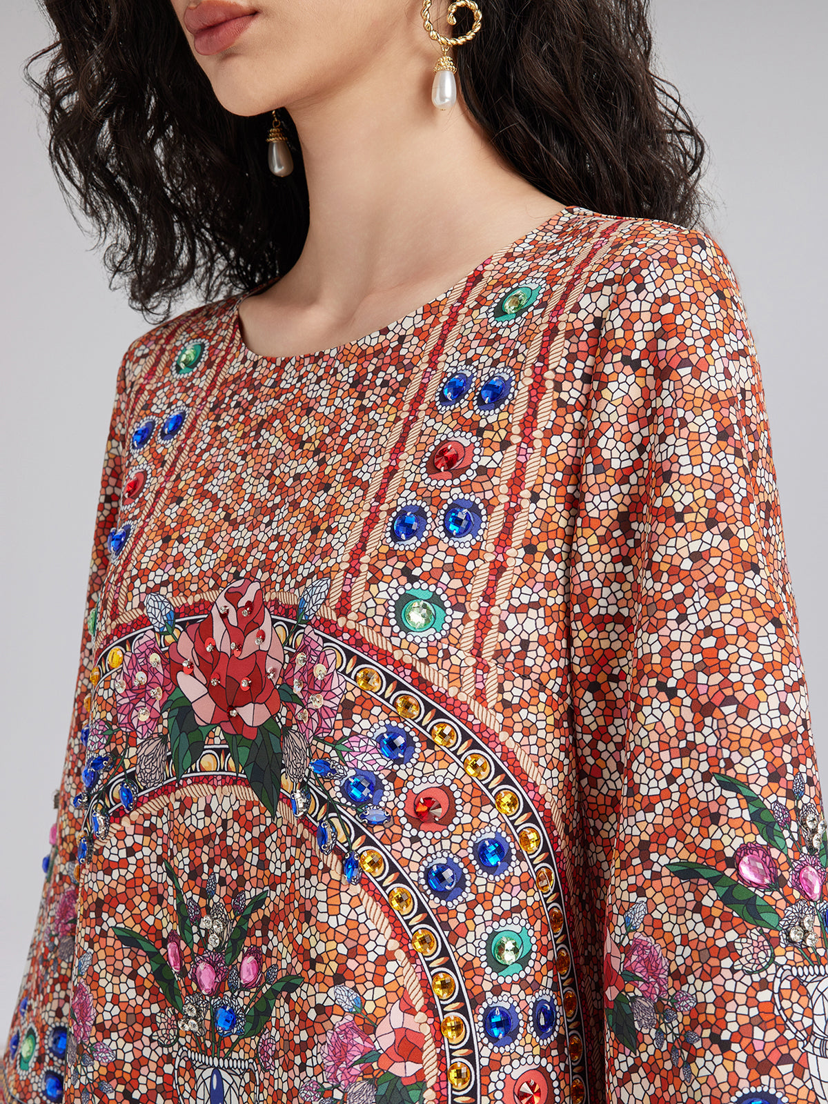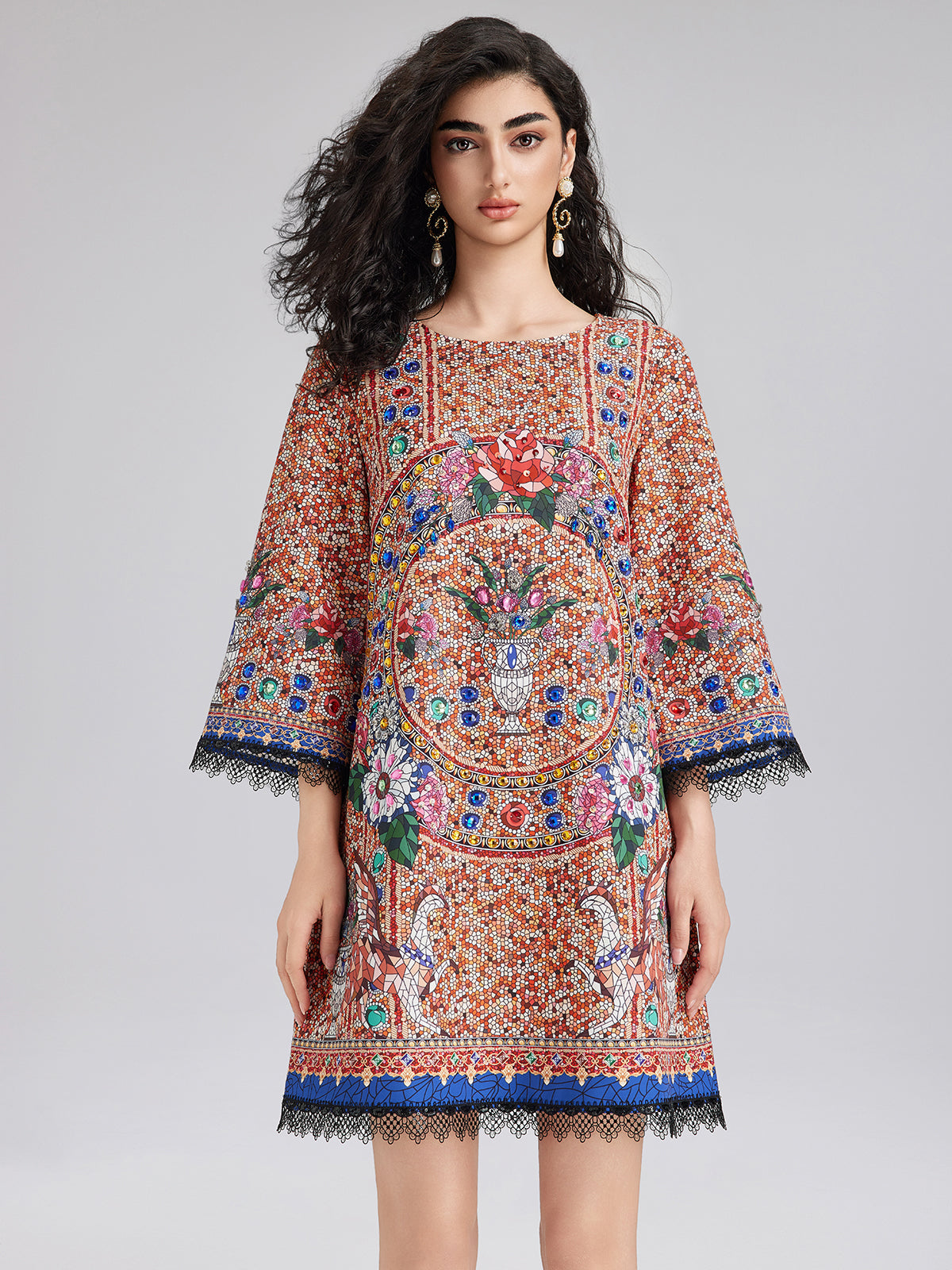 Each bead and rhinestone is hand-sewn, ensuring vibrant colors and high quality. The design features floral, vase, and artistic elements, exuding elegance. The relaxed fit flatters all body types, while the lace hem adds a delicate, feminine touch.