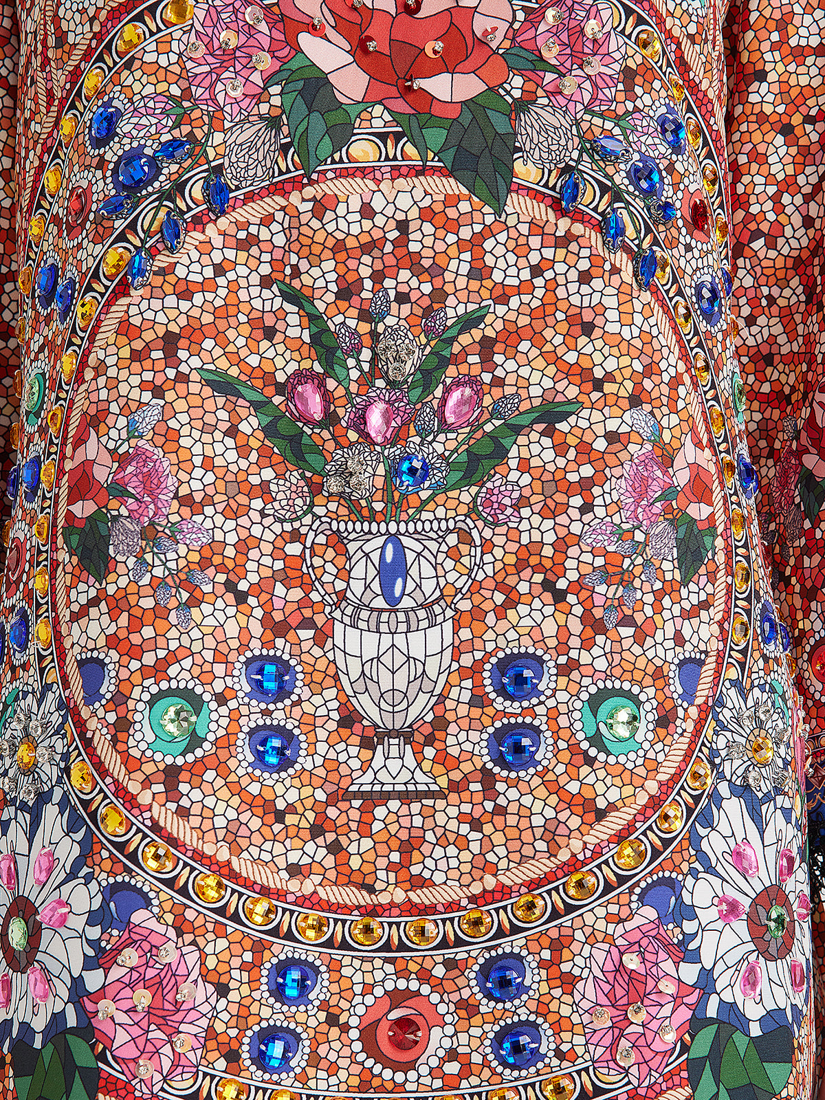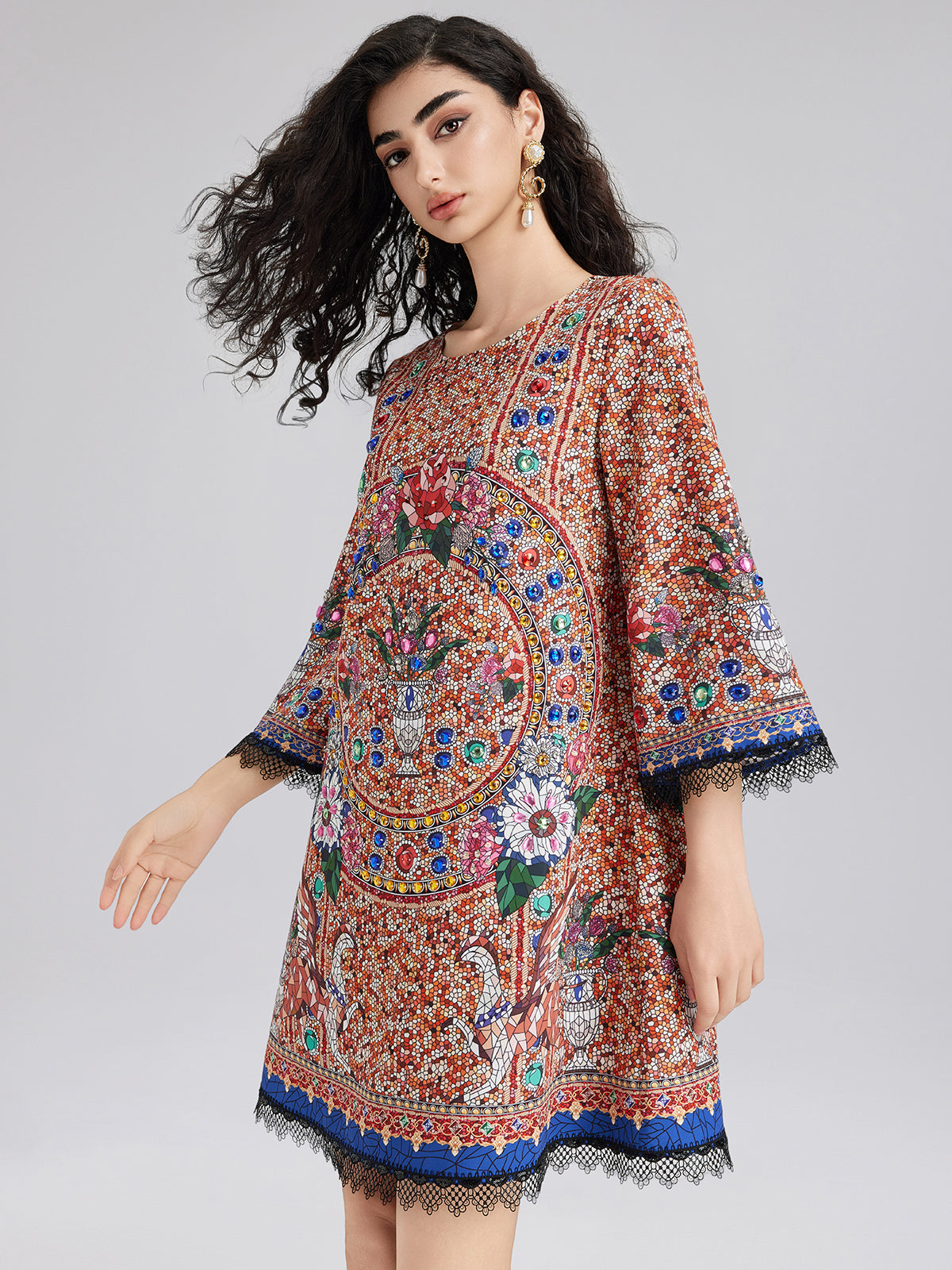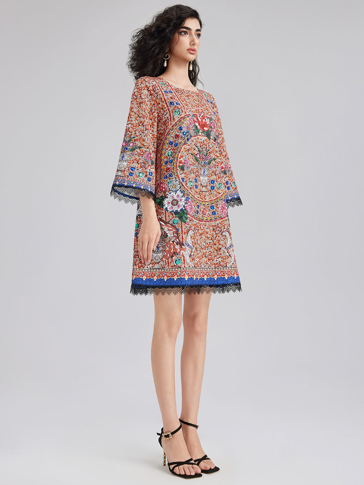 Each bead and rhinestone is hand-sewn, ensuring vibrant colors and high quality. The design features floral, vase, and artistic elements, exuding elegance. The relaxed fit flatters all body types, while the lace hem adds a delicate, feminine touch.