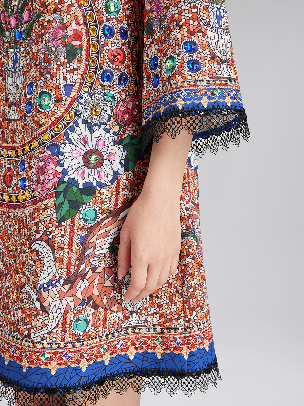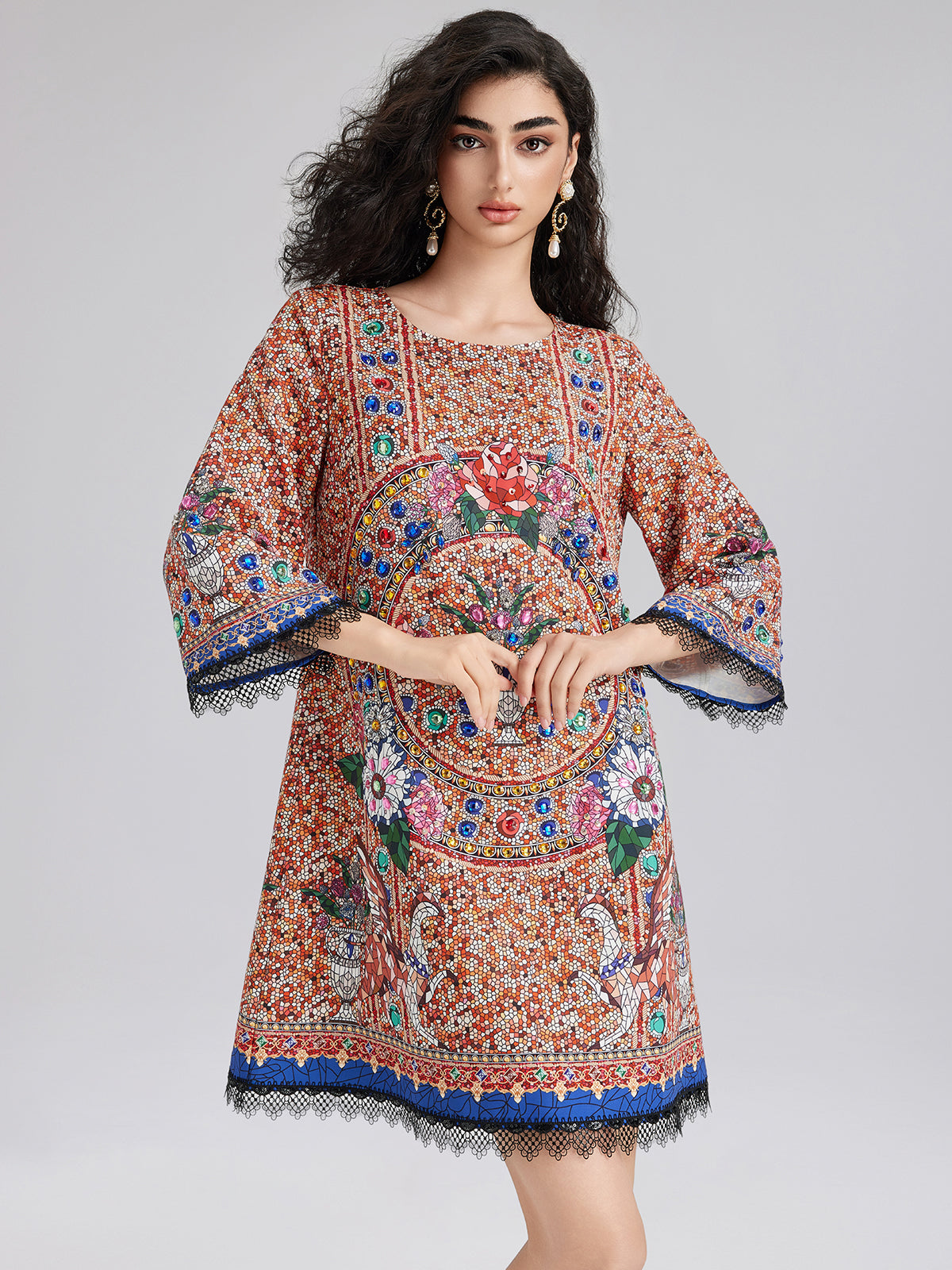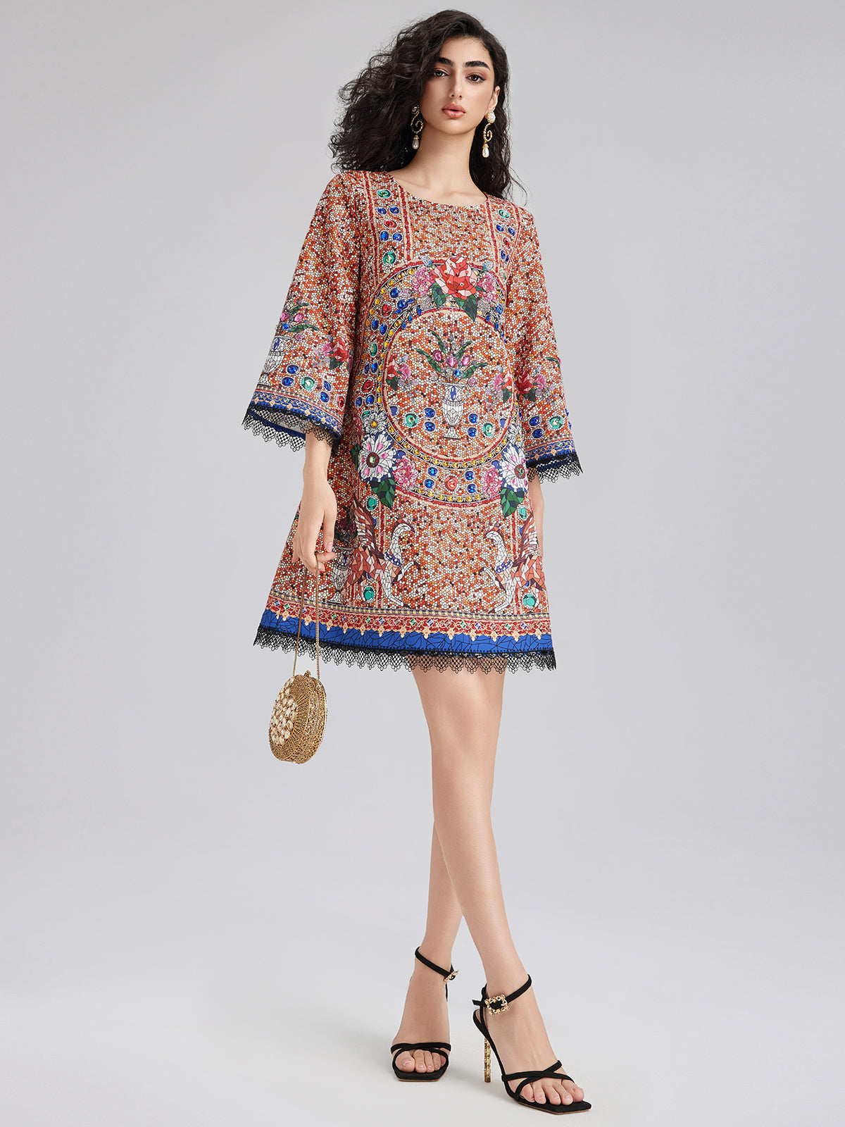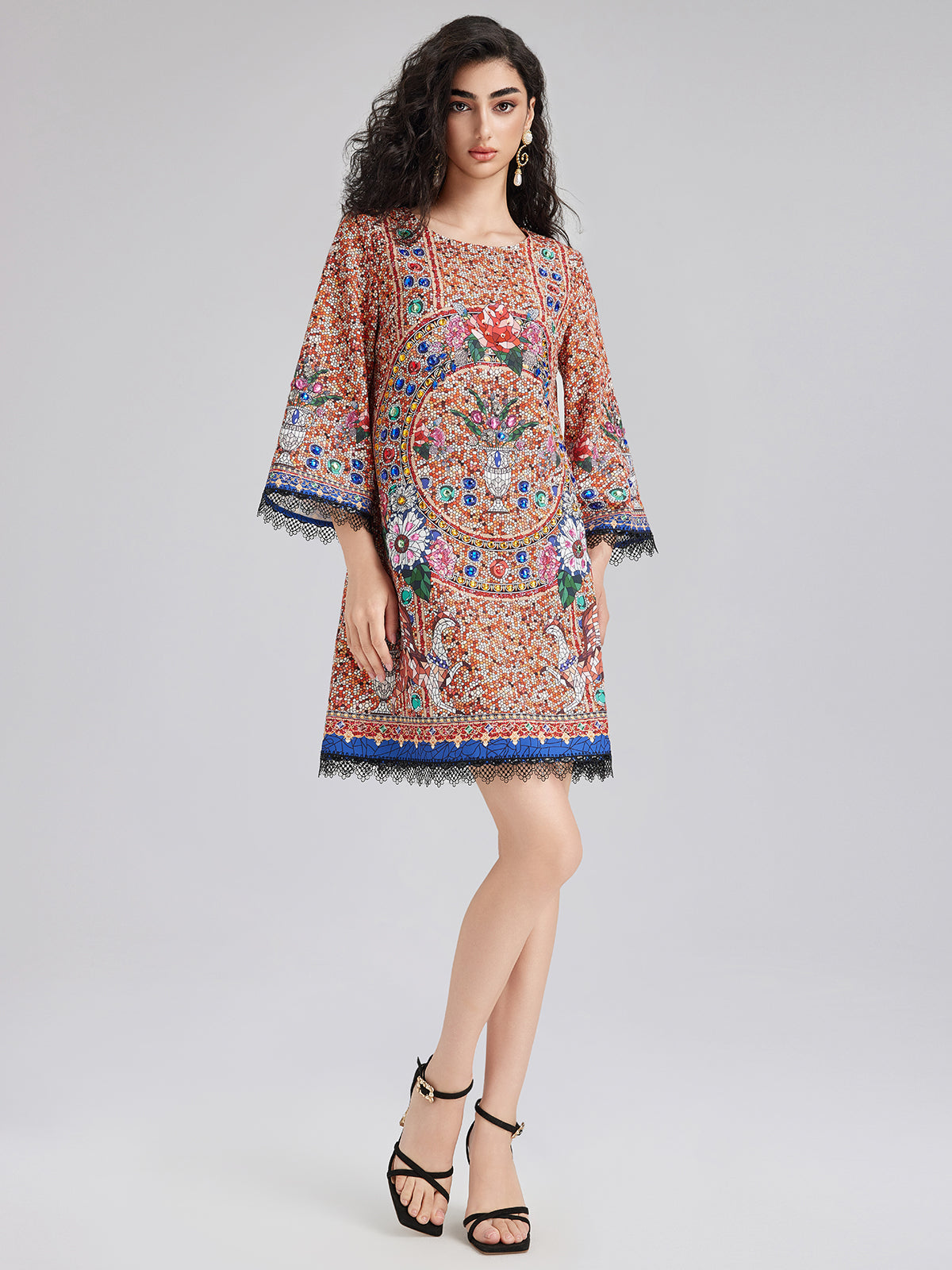 Each bead and rhinestone is hand-sewn, ensuring vibrant colors and high quality. The design features floral, vase, and artistic elements, exuding elegance. The relaxed fit flatters all body types, while the lace hem adds a delicate, feminine touch.