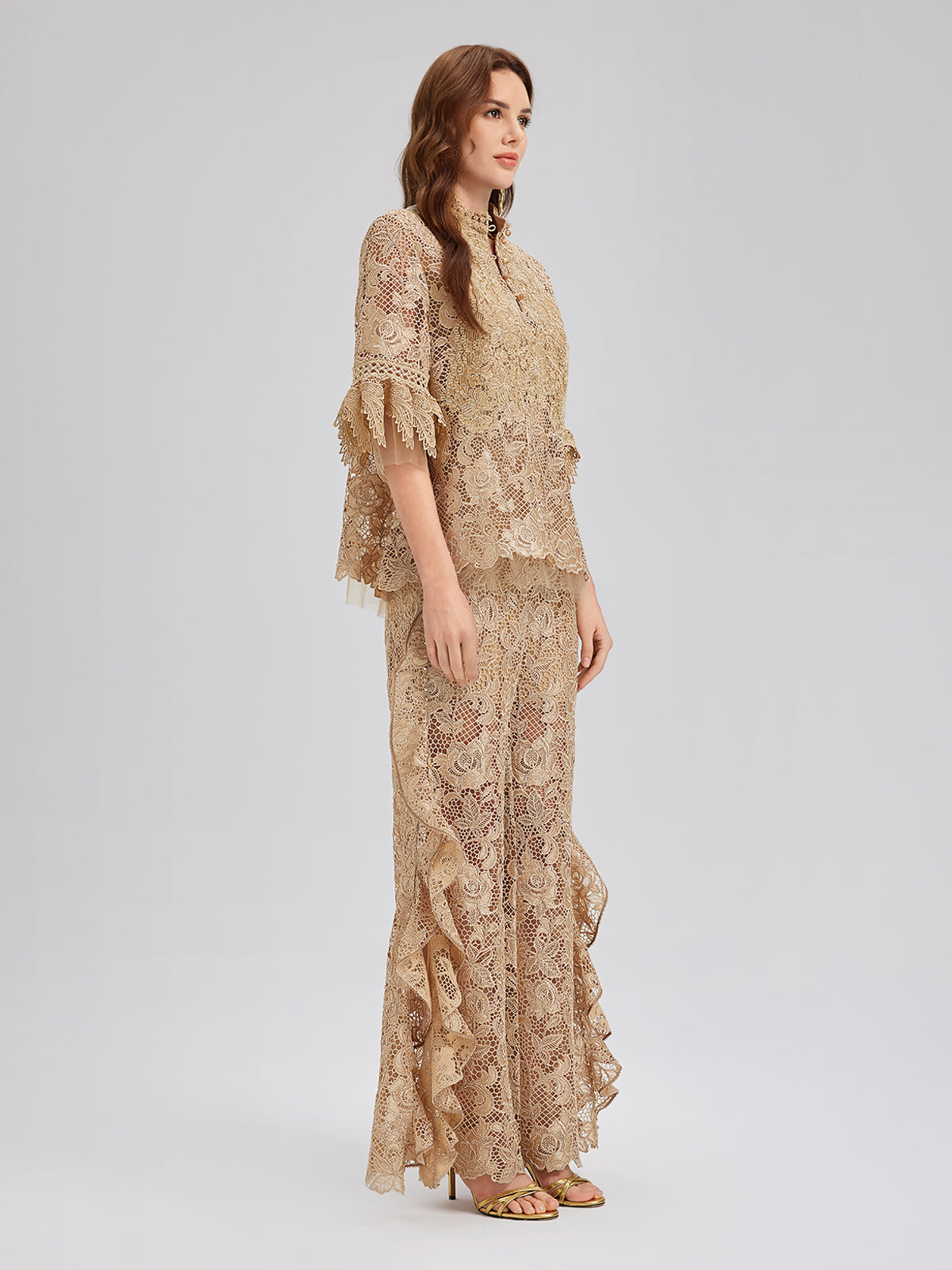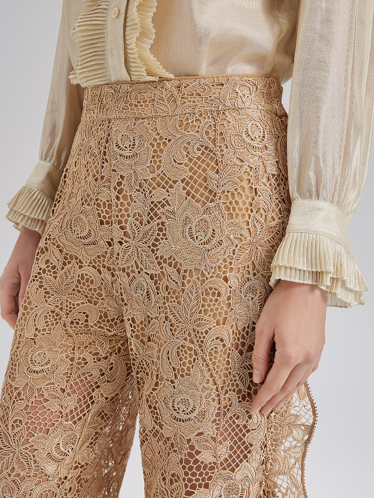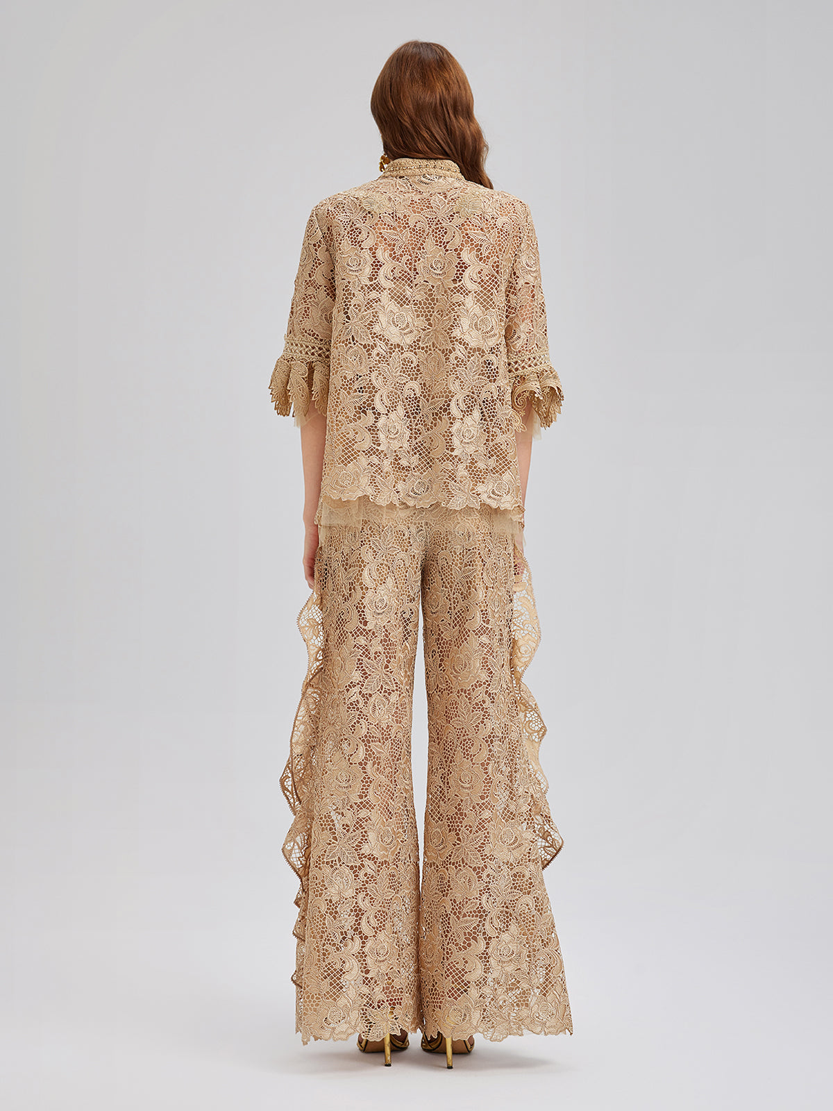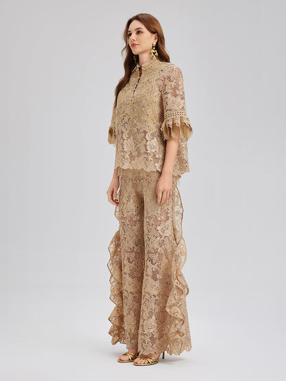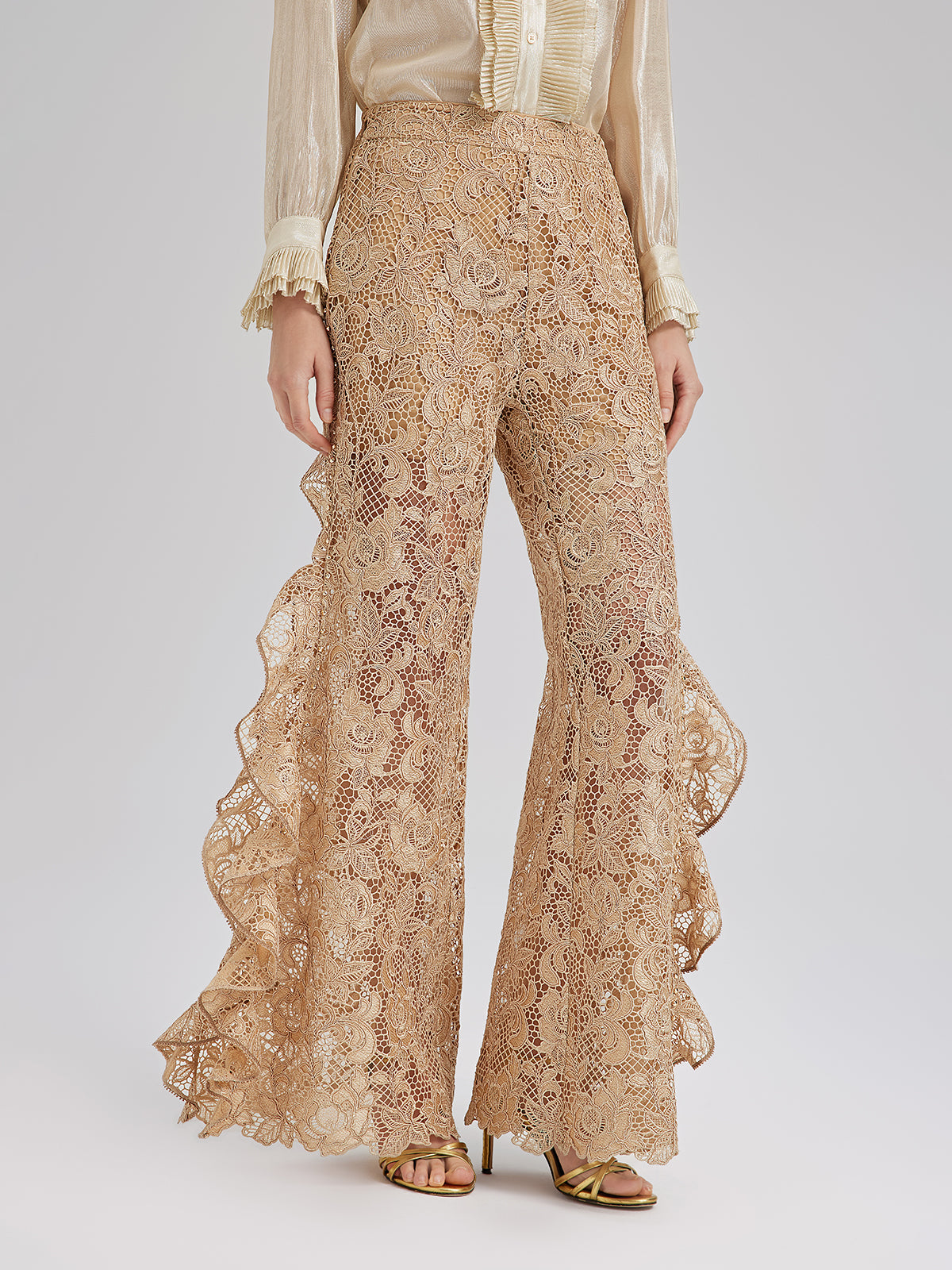 Double-layer ruffled hems flutter like petals with every step. Memory pleats retain their sculptural shape even after washing. The high-waisted flared cut smooths the hips and lengthens the legs, with an elastic back waist and hidden side zip for effortless wear.