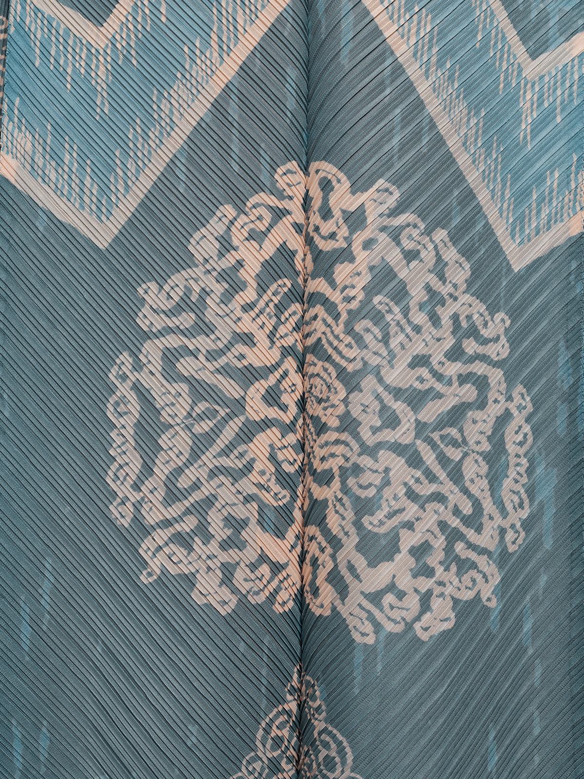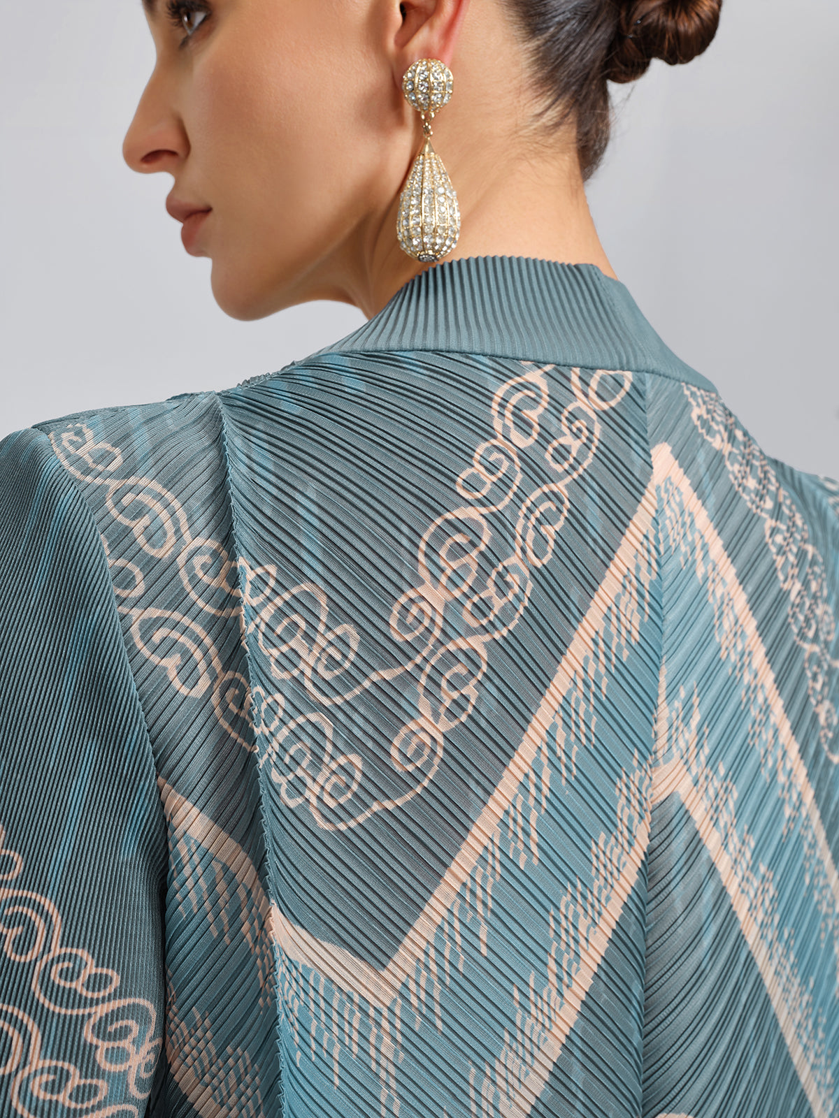 A loose H-line silhouette meets intensive pleating and printed craftsmanship, offering exceptional stretch and comfort. Hand-sewn dimensional floral accents at the sleeves add layered depth, creating a relaxed yet thoughtfully detailed look.