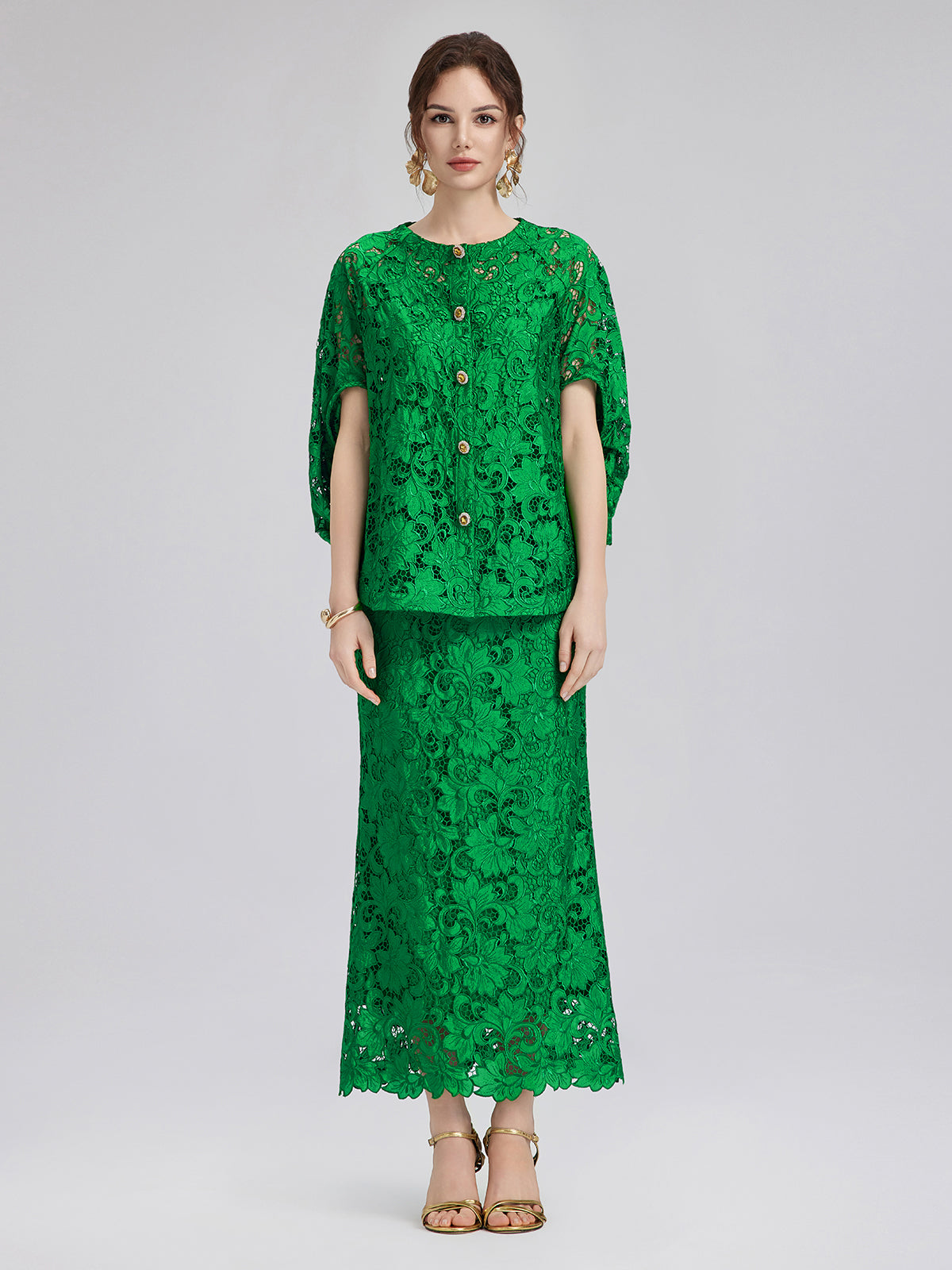 Features delicate lace appliqué with refined patterns and rich emerald tones. Relaxed silhouette suits various body types. Unique sleeve cut adds a modern edge. Finished with jewel-like buttons for a touch of luxury. (Comes with a matching camisole for easy styling.)