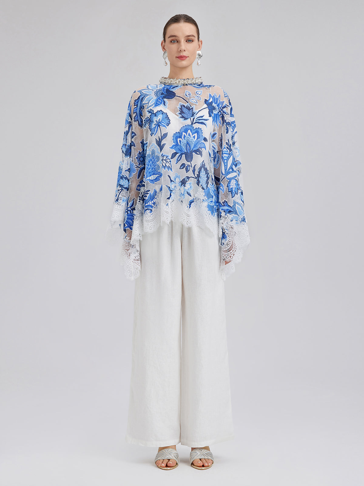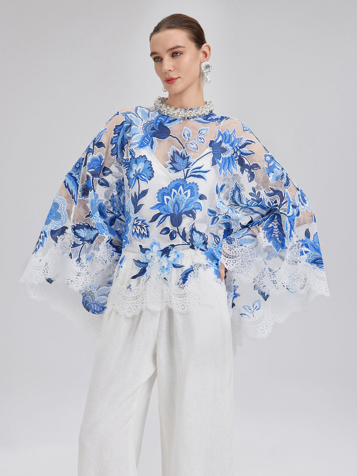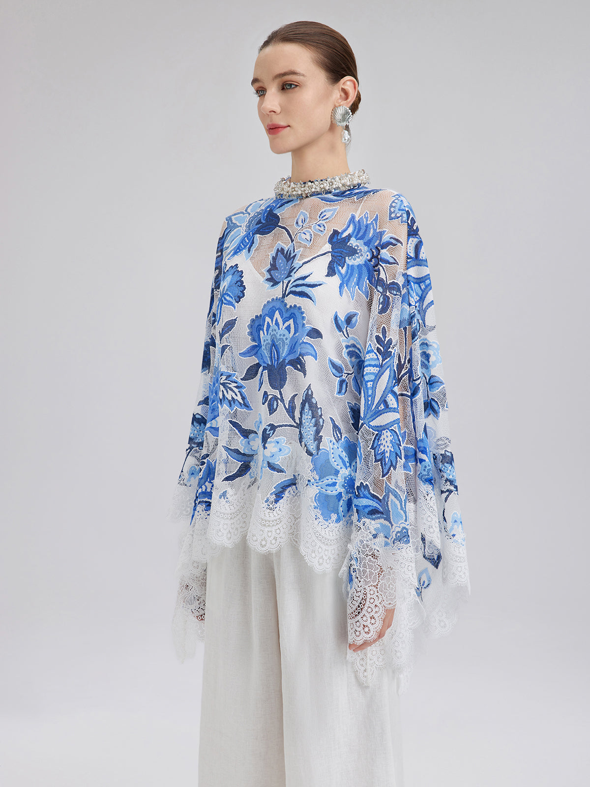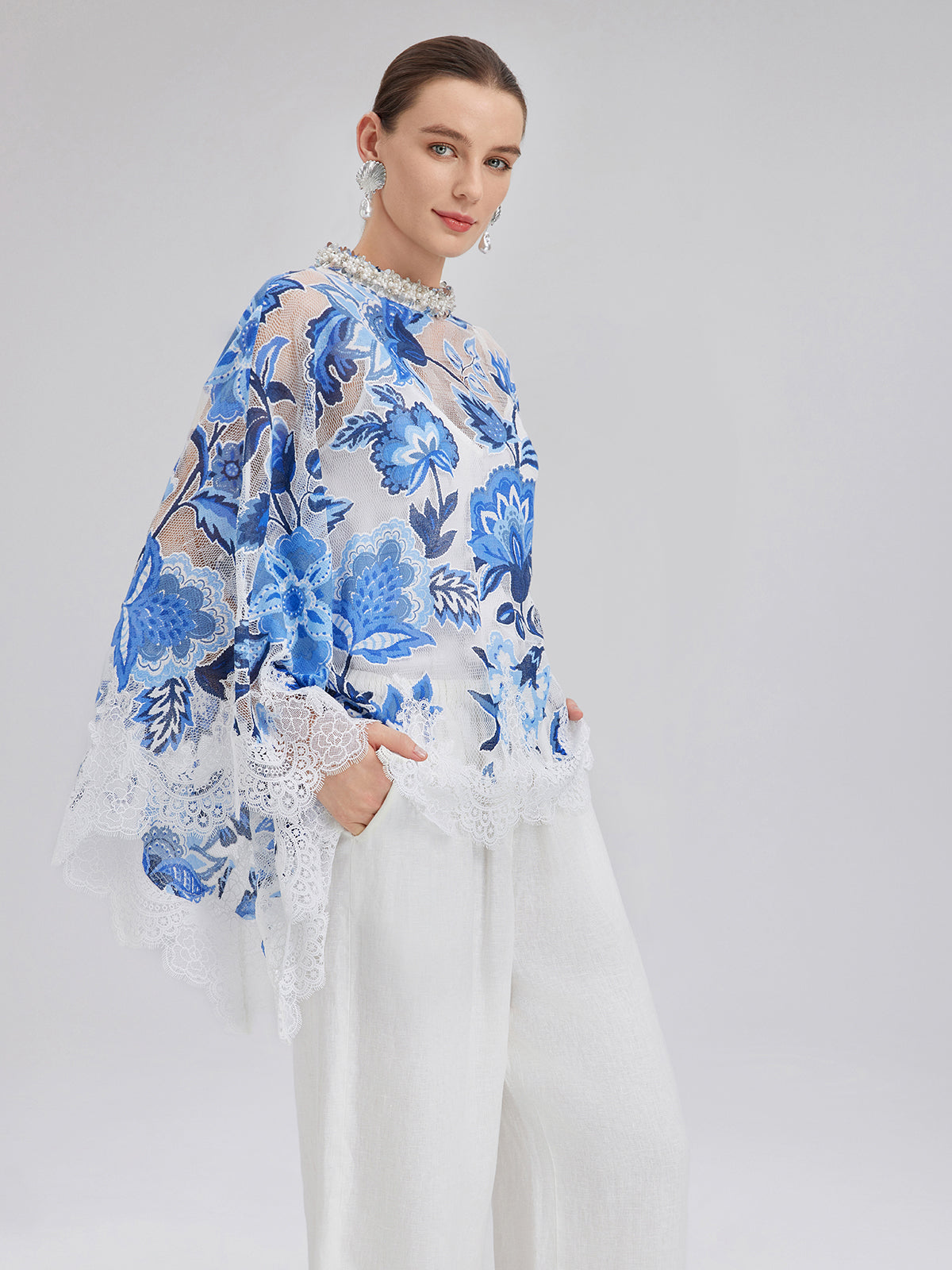 Made from vibrant lace jacquard, this elegant blouse features a pearl-trimmed neckline and finely layered lace at the hem that sways with airy grace. The relaxed cape silhouette drapes effortlessly for a graceful, feminine look. Comes with a tonal camisole to soften the sheer finish.