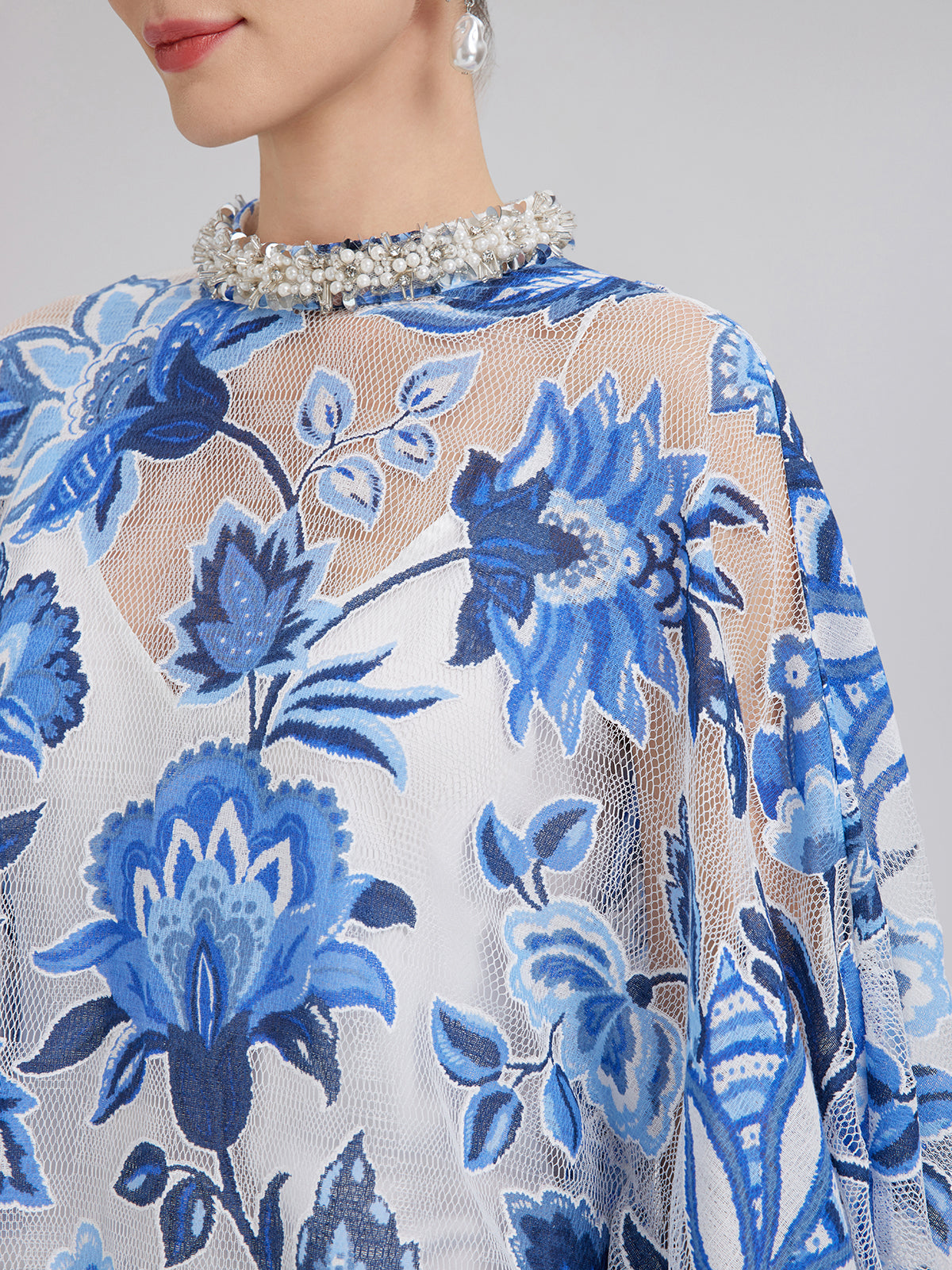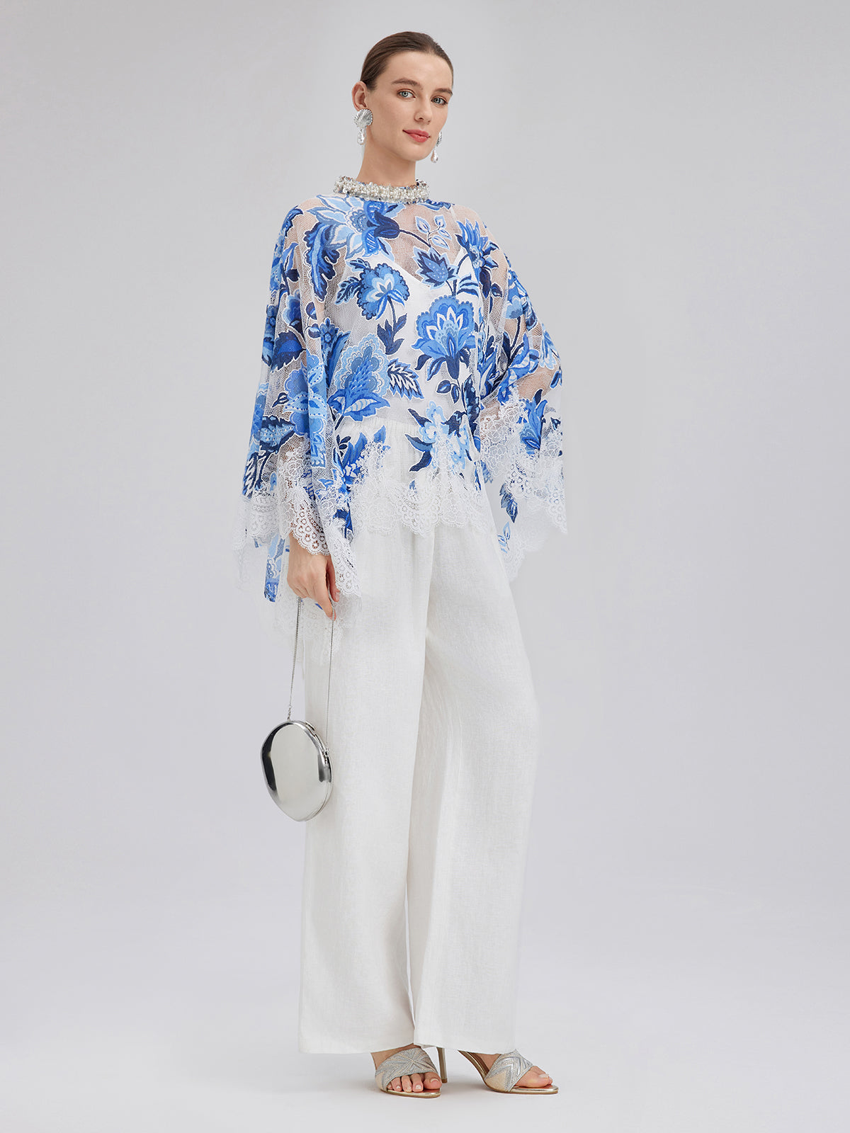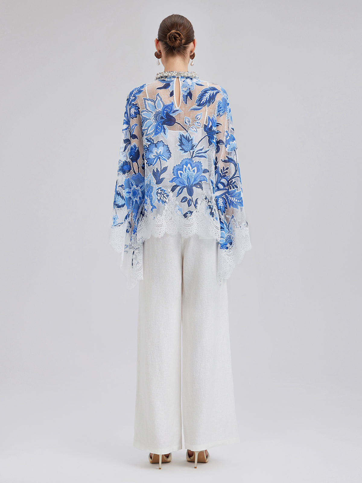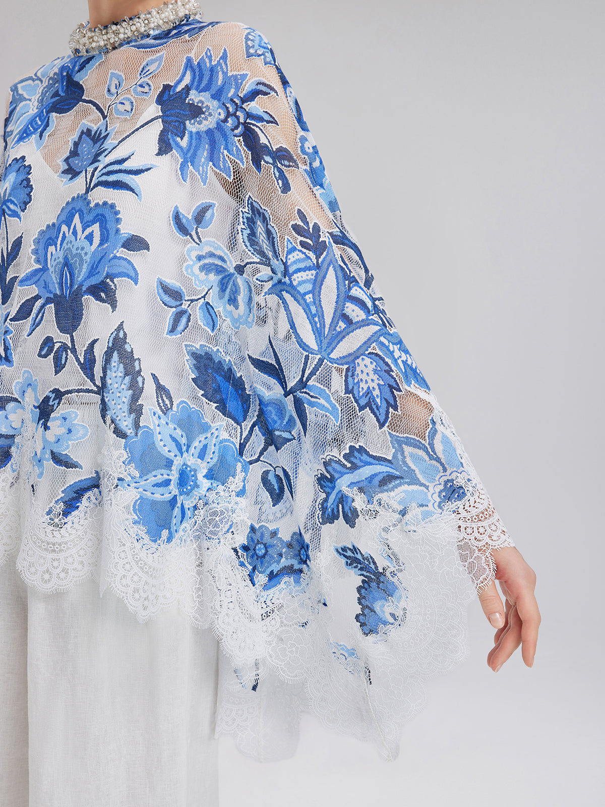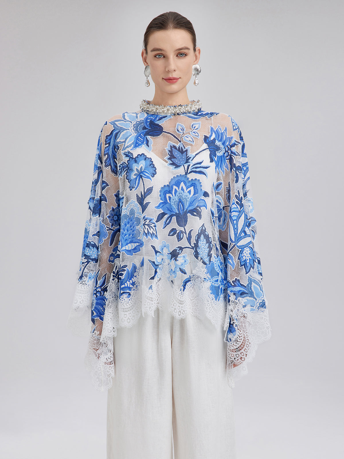 Made from vibrant lace jacquard, this elegant blouse features a pearl-trimmed neckline and finely layered lace at the hem that sways with airy grace. The relaxed cape silhouette drapes effortlessly for a graceful, feminine look. Comes with a tonal camisole to soften the sheer finish.